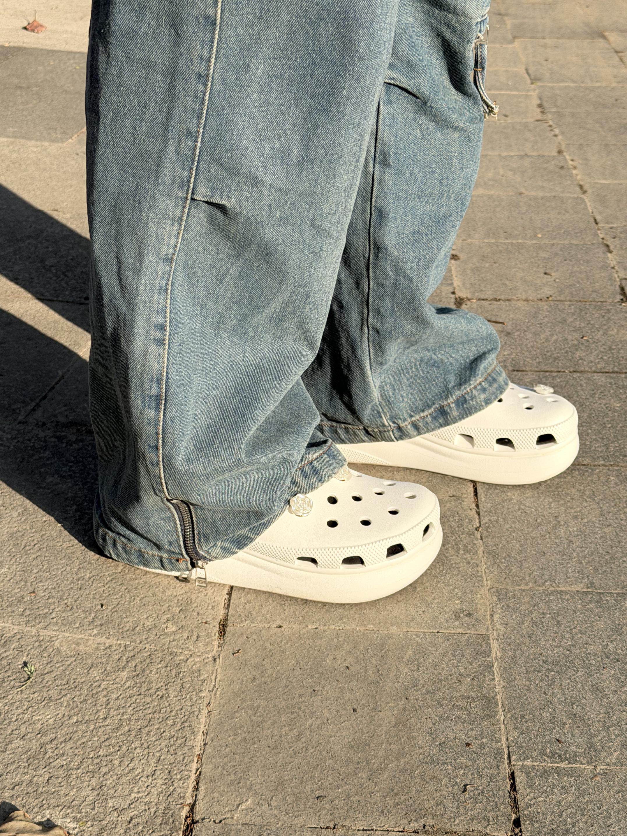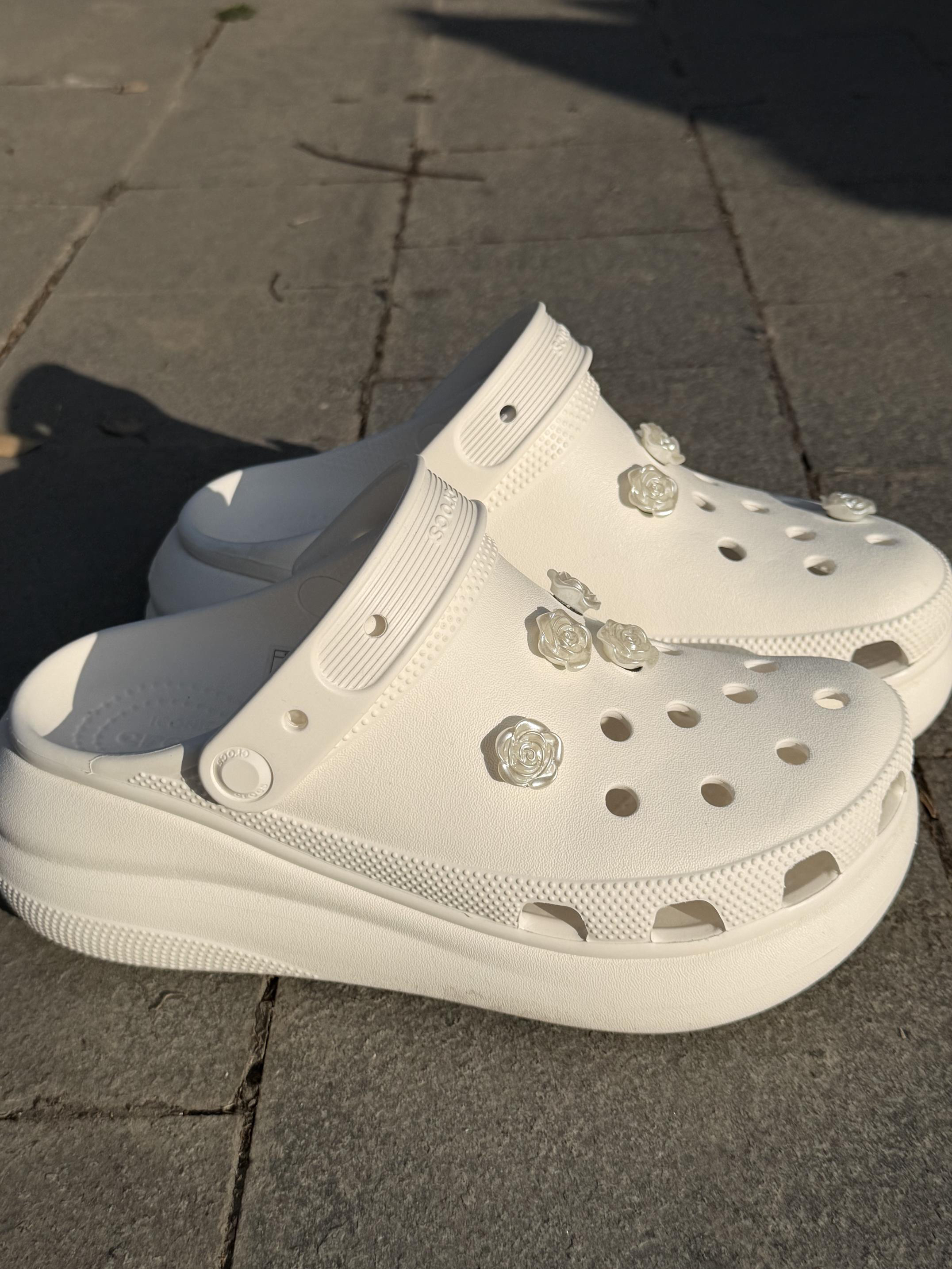 ✨ Crocs 厚底洞洞鞋,经典EVA材质 轻便防滑又耐磨,夏天外穿超合适! 真的有足弓支撑,穿上脚很舒服,暴走不累! 一全体EVA材质,不进水不响不臭脚 厚底设计有增高效果,可以增高大约5cm小个子的福音 鞋面多处透气孔+可拆卸玫瑰花装饰 个性满分,日常、沙滩、休闲都能轻松驾驭🌹 白色百搭,情侣款也很友好 实用又时髦,出街回头率up!
