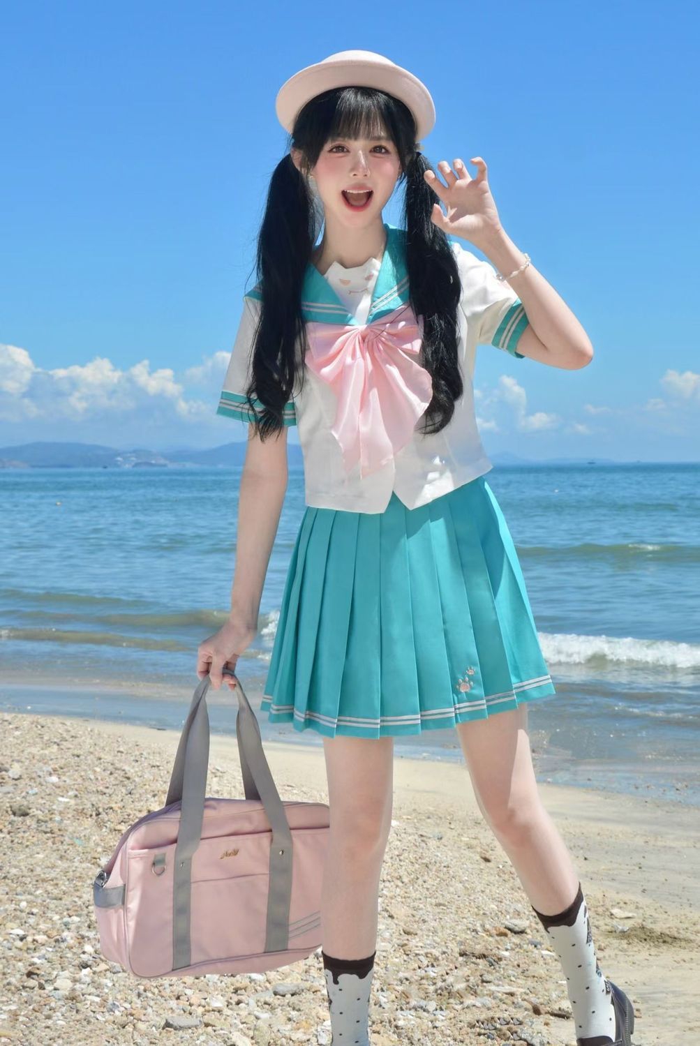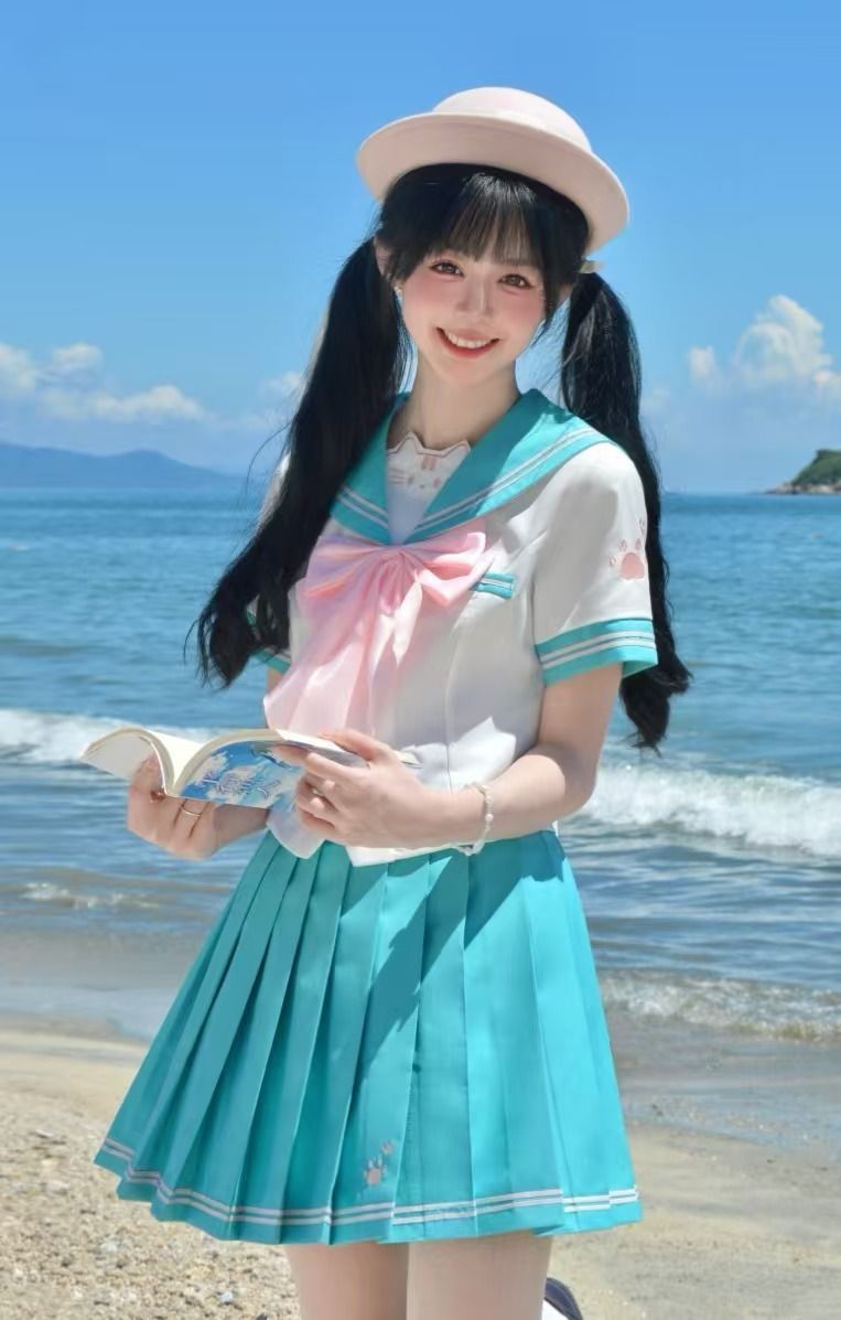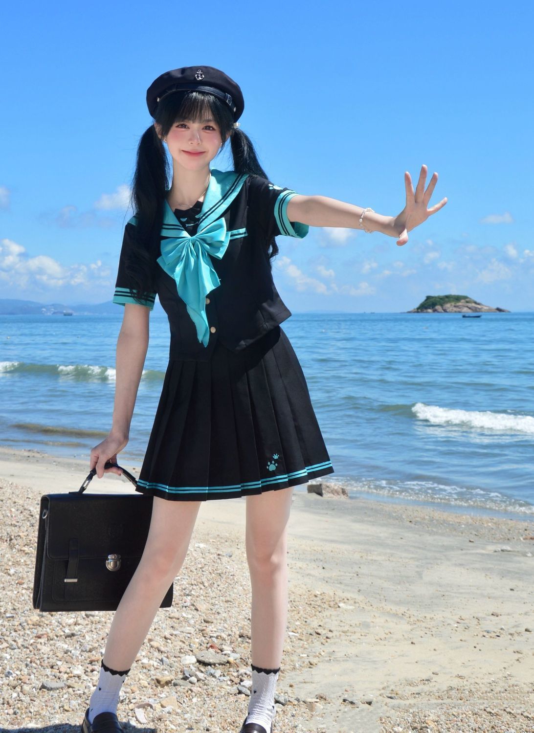 太懂了!这套黑+薄荷绿的猫咪水手服,简直把「元气甜妹」的氛围感焊在身上了✨ 再配上海边的蓝天白浪、双马尾和水手贝雷帽,那种日系漫画里走出来的感觉直接拉满,甜而不腻,清爽又元气,太戳人啦!