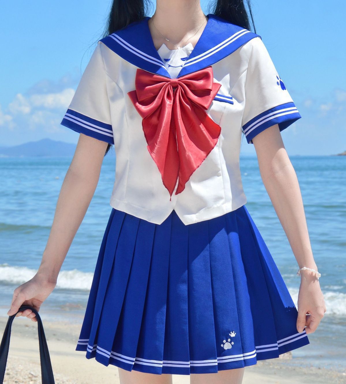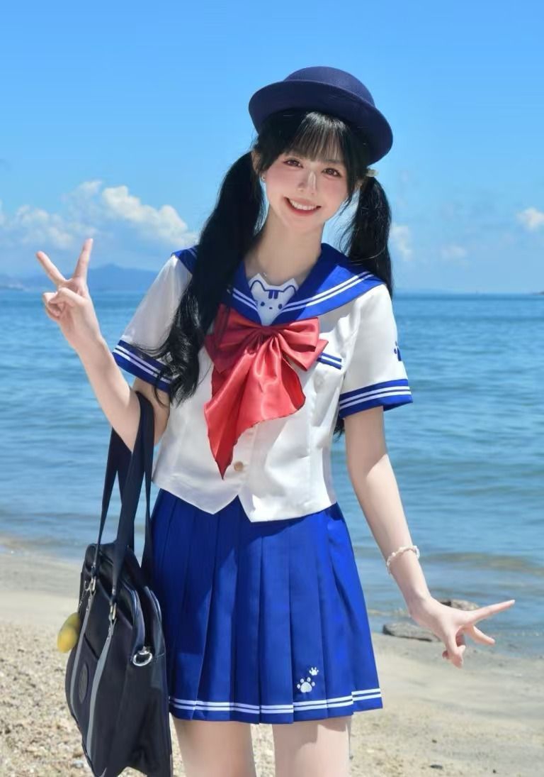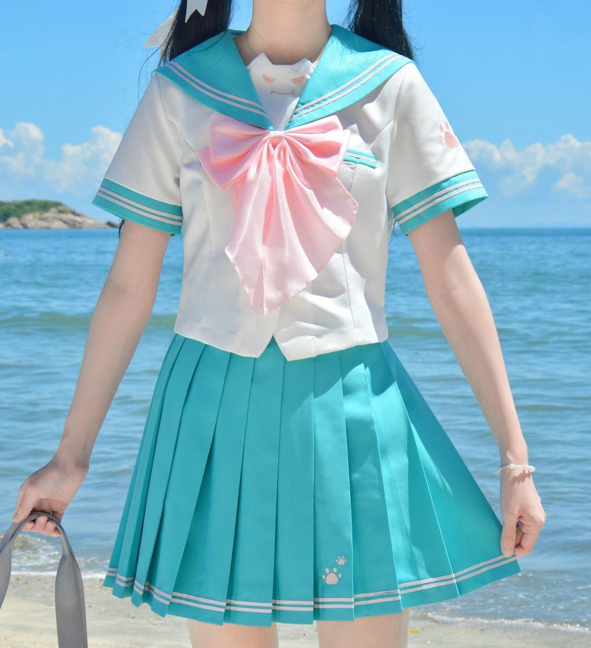 太懂了!这套黑+薄荷绿的猫咪水手服,简直把「元气甜妹」的氛围感焊在身上了✨ 再配上海边的蓝天白浪、双马尾和水手贝雷帽,那种日系漫画里走出来的感觉直接拉满,甜而不腻,清爽又元气,太戳人啦!