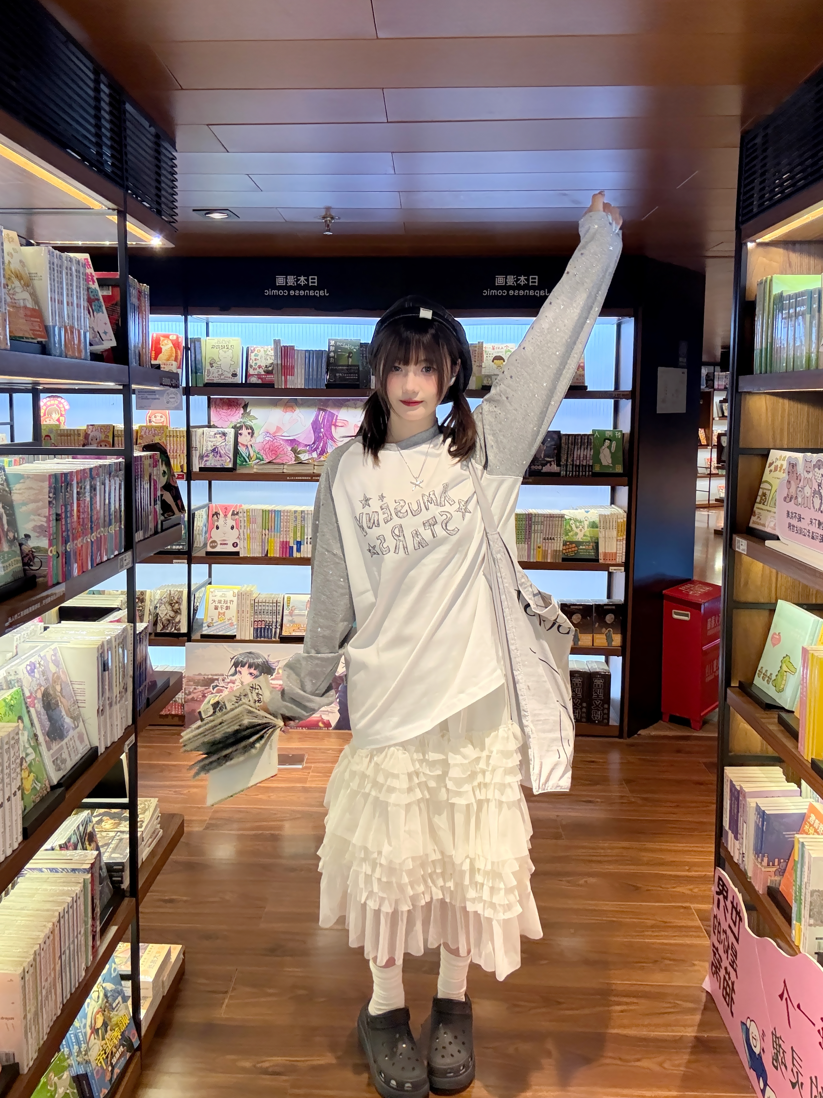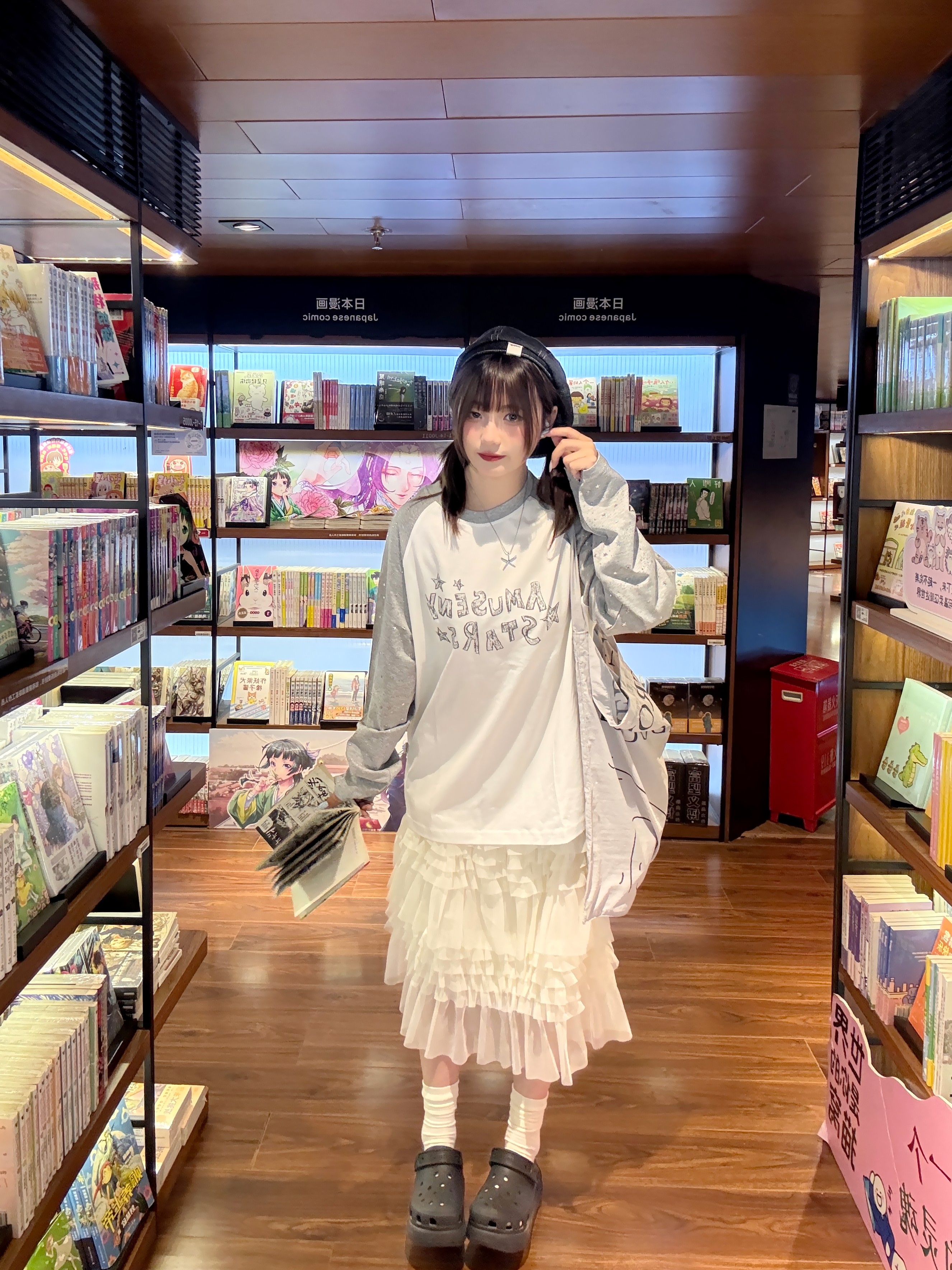 用一套软乎乎的穿搭,结束疲惫的一天~ 插肩T恤+蛋糕纱裙,搭配帆布包和洞洞鞋, 减龄又随性,自带元气buff! 下班后在书店里翻漫画的傍晚,是独属于自己的松弛