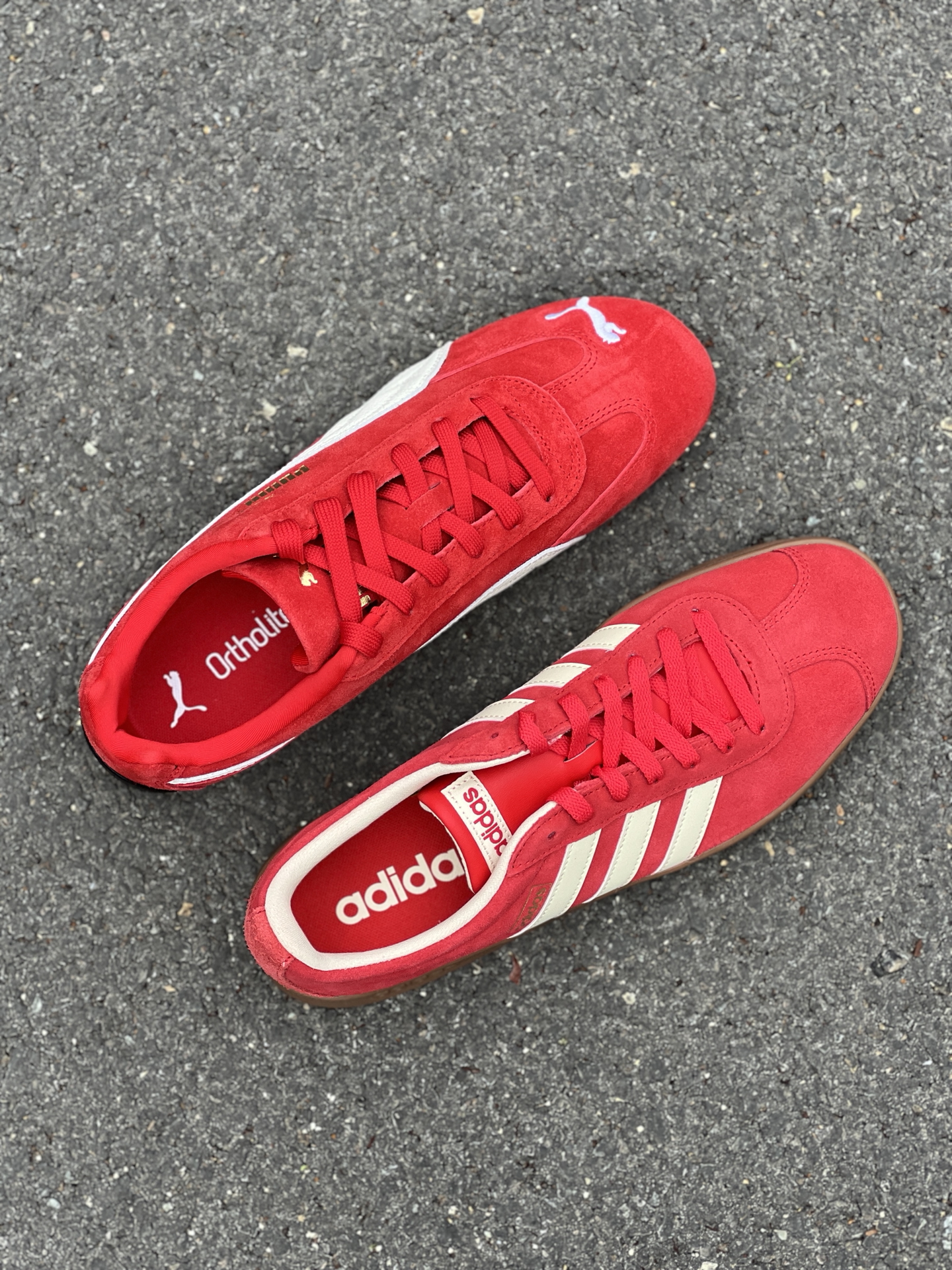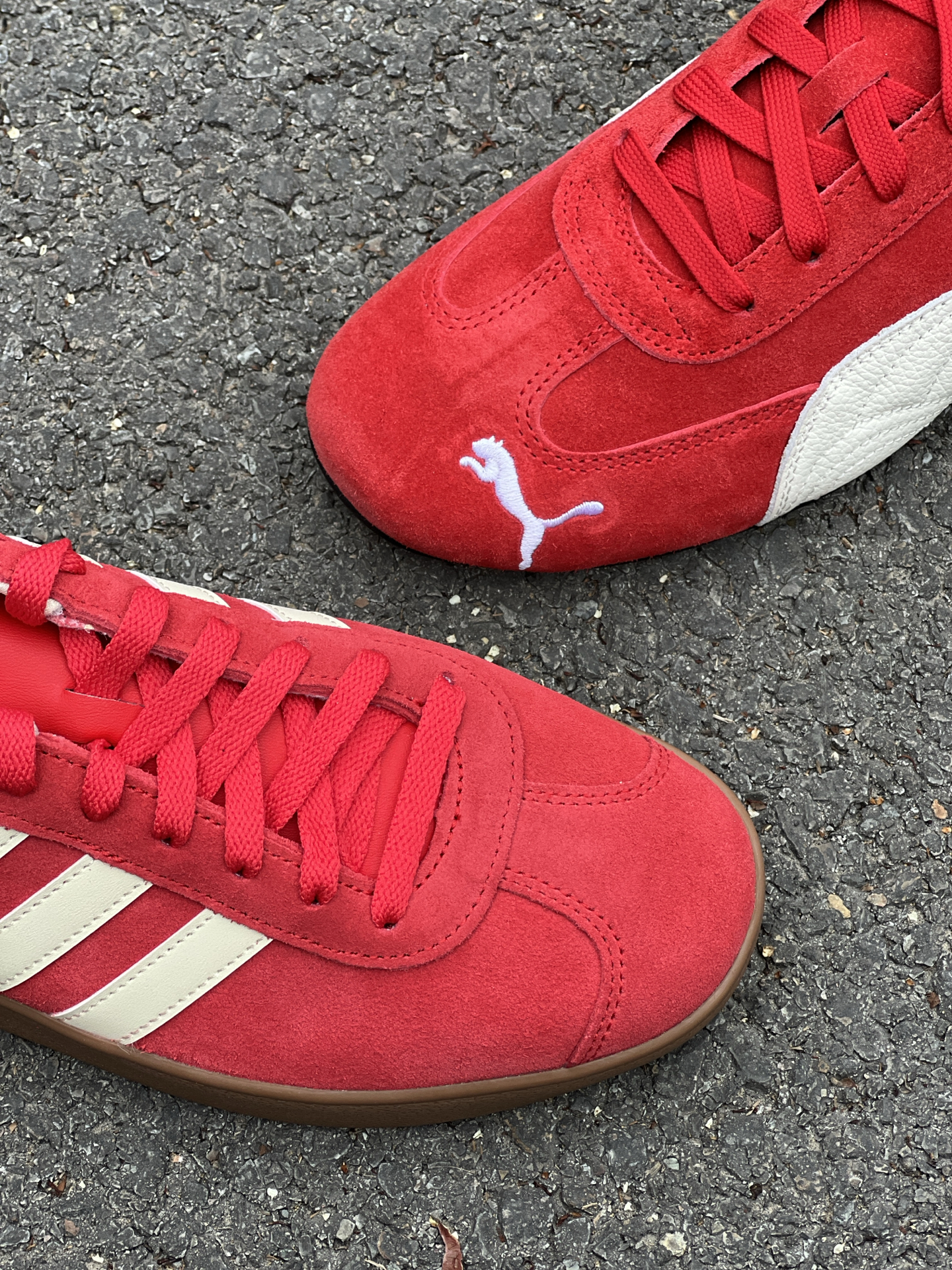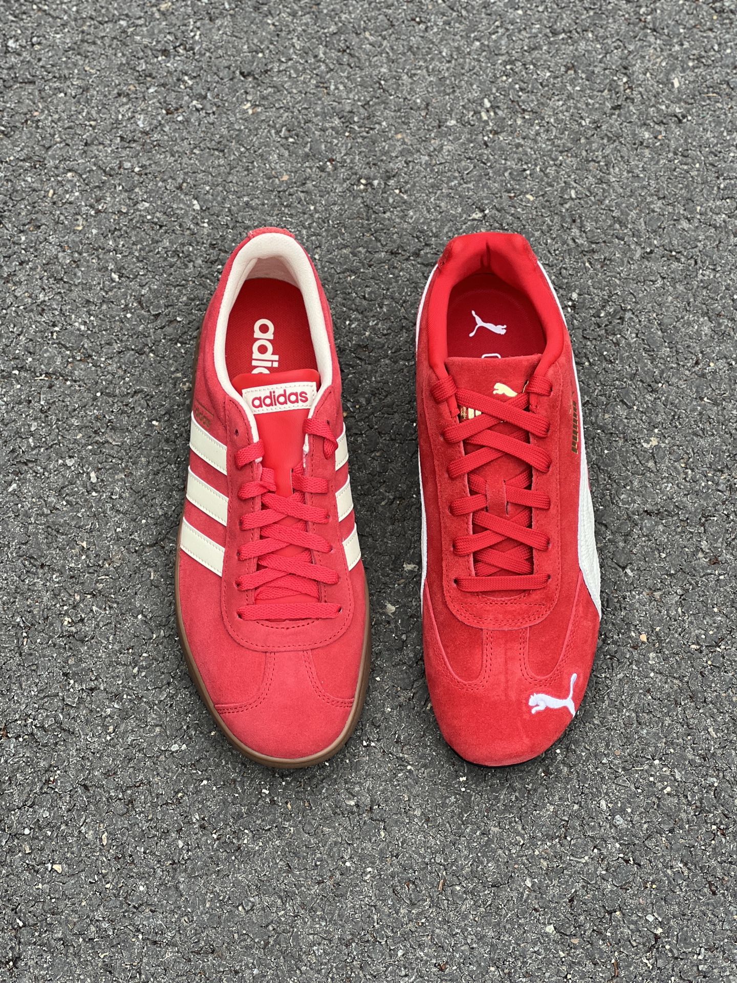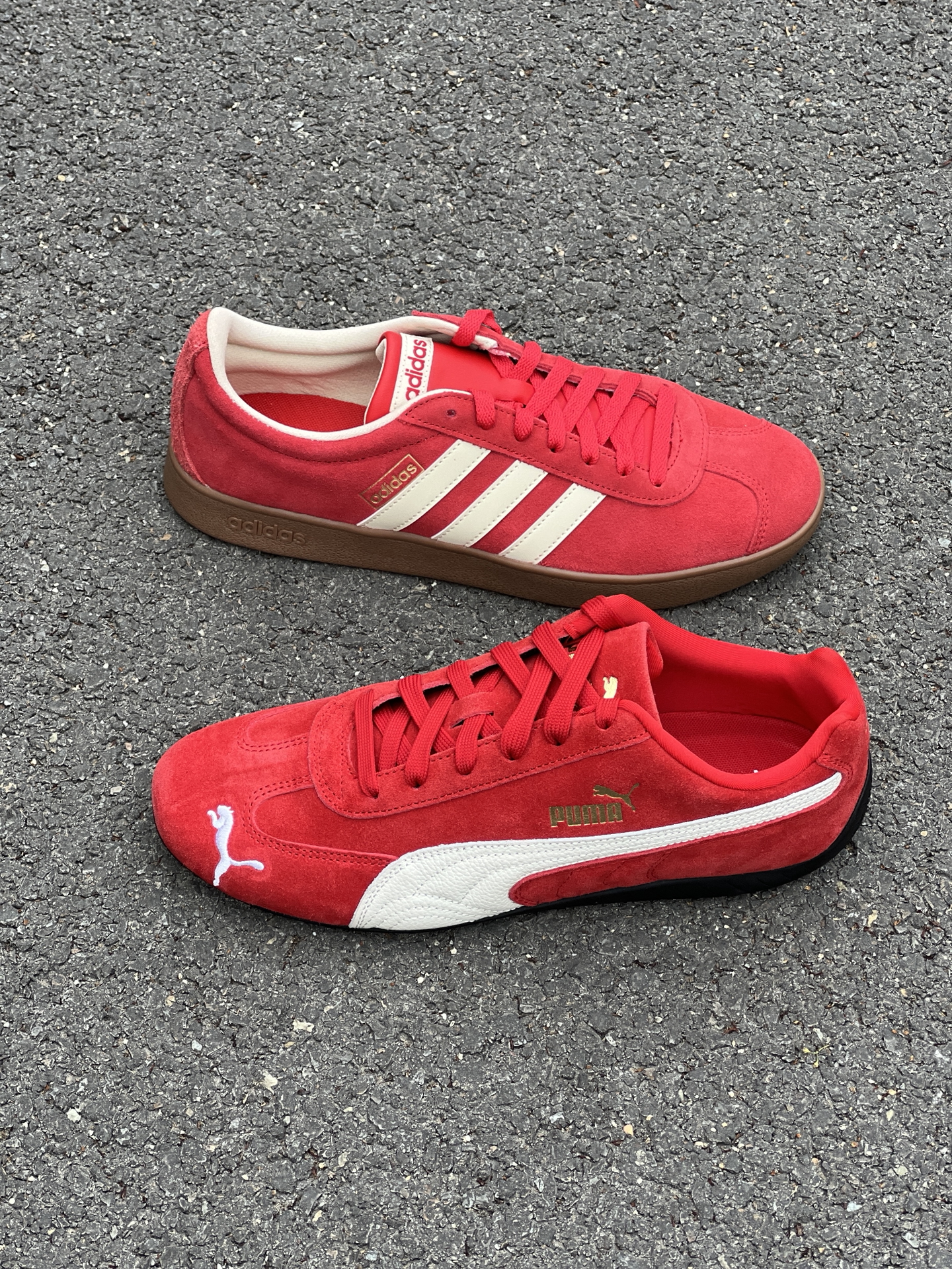 春日想要出片⁉️我选了这两双比较吸睛的宝藏休闲鞋 踏春穿这双红色迪子德训鞋太出片了! 阿迪🌸我超爱它的轻盈脚感,我春日出游穿它完全不累脚,低帮版型利落显腿长。 鲜艳的红身一上脚就点亮全身,搭配浅色春装反差感绝了。 牛剖层革鞋面软而挺括,风一吹特别舒服,随手一拍都是大片! PUMA🌸这双烈焰红赛车鞋是我的春日吸睛利器!头层牛皮质感满满,我穿它去踏青特别跟脚,贴地的薄底走路轻盈又稳。 烈焰红特别显白,...