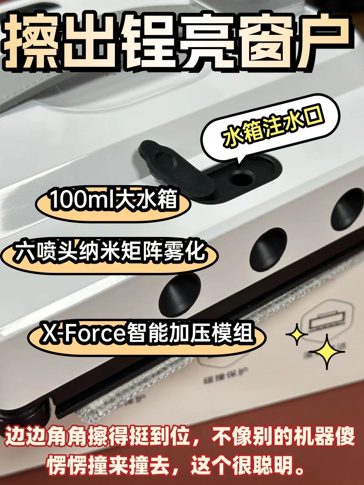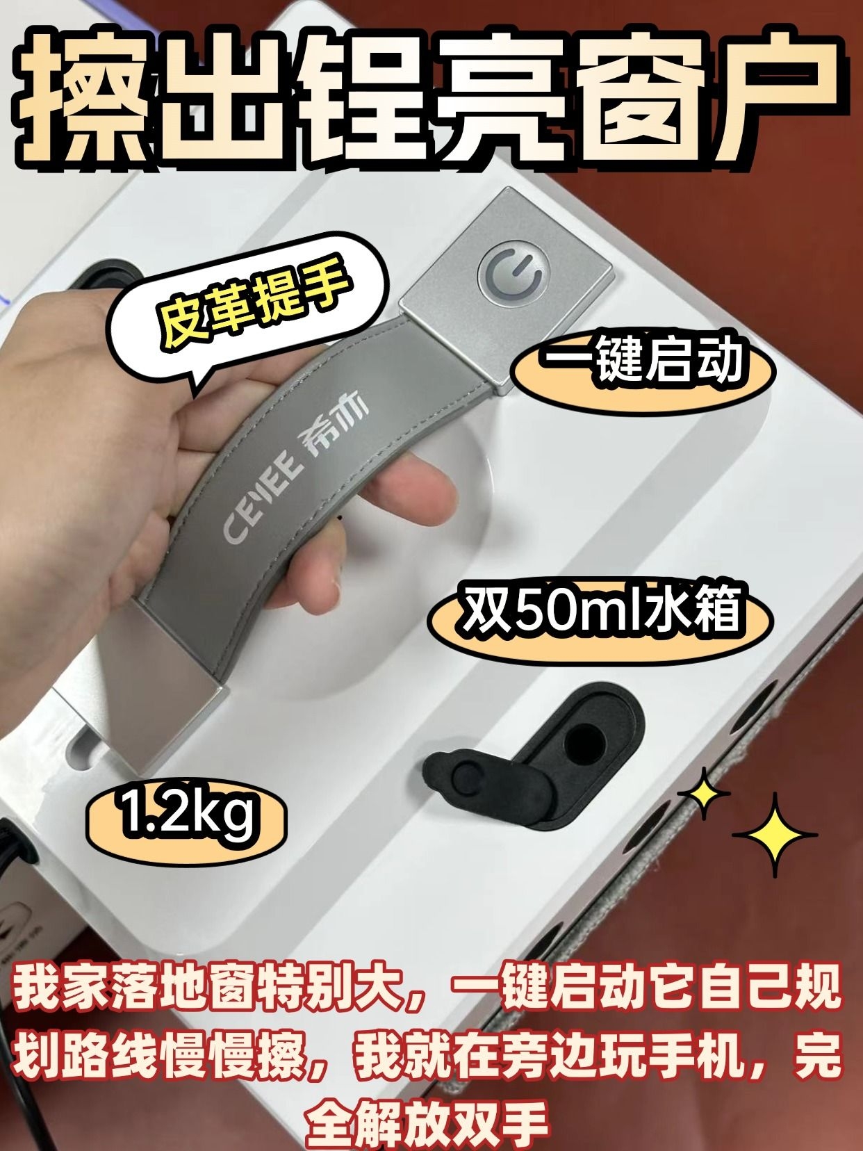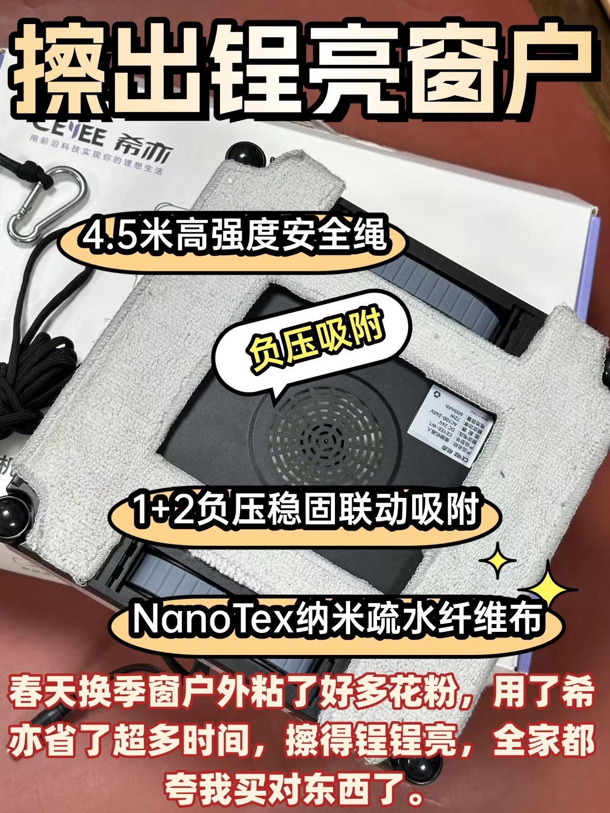 真心劝所有家庭,别再手动擦窗了!又累又难擦干净还危险,希亦 W1 擦窗机器人直接把专业保洁搬回家,用过一次就彻底爱上~ 颜值和实力双在线!简约纯白机身,质感高级,小巧不占地方,收纳超方便。双 50ML 大水箱,一次加水能擦完整屋落地窗,不用频繁加水,懒人狂喜。最绝的是清洁效果! 超声空化技术瓦解顽固污渍,爪印、灰尘、雨渍一擦即净,纳米疏水布防水防刮,擦完玻璃透亮无痕迹,比人工擦得干净4倍。 ...