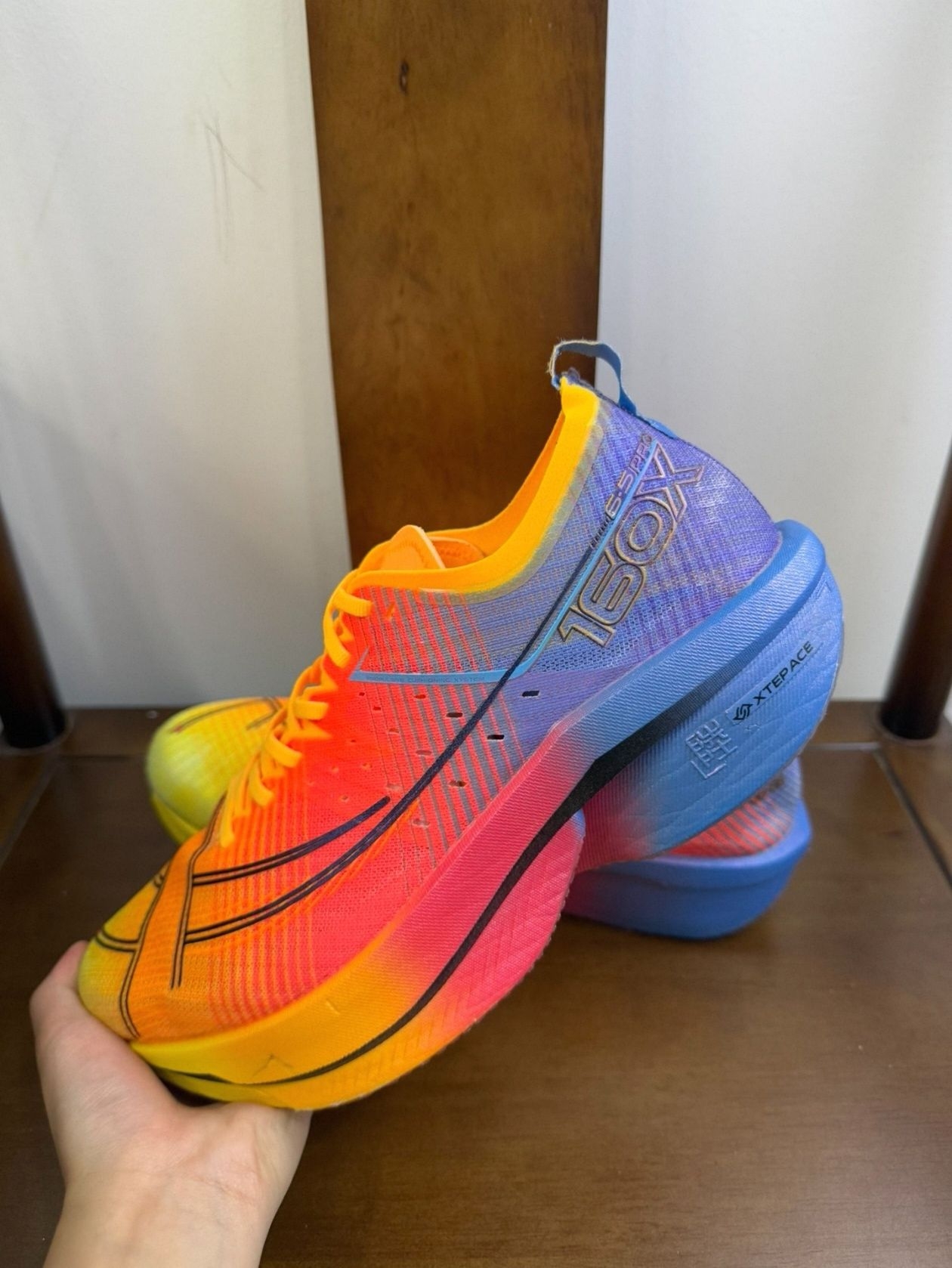 它配得起这个头衔,业界最新的X-tep Ace pisa射胚发泡和添加pi纤维的gt700“黄金碳板”,使得这双鞋的推进和泡棉素食极其的高,特别是前掌跑者前掌落地时可以很明显的感受到泡棉的压缩,形变,储能和释能,gt700黄金碳板即使你不是非常主动的蹬伸都能给到很好的滚动感,不用说全掌落地的跑者了,在大步幅蹬伸跑者的身上,可以很好的发挥这双鞋的激进滚动和推进,特步也很贴心的在鞋头起翘点给了个小竖线...