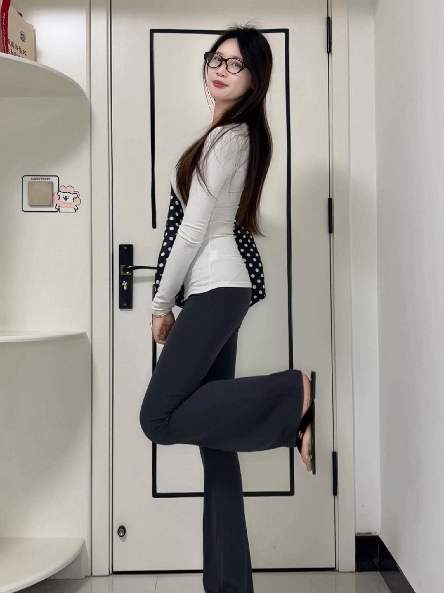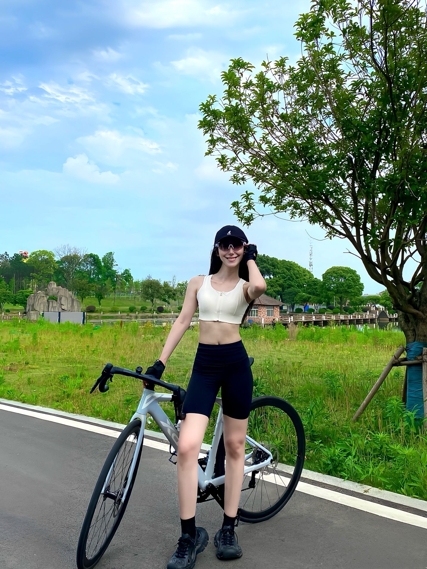 救命!这条黑色阔腿裤简直是懒人天菜,垂感拉满还藏肉,腿粗腿不直全给你藏得严严实实! 搭件浅灰美式T恤+红尾小白鞋,再配个Kitty棒球帽,又酷又乖,健身房直接穿,舒服又出片