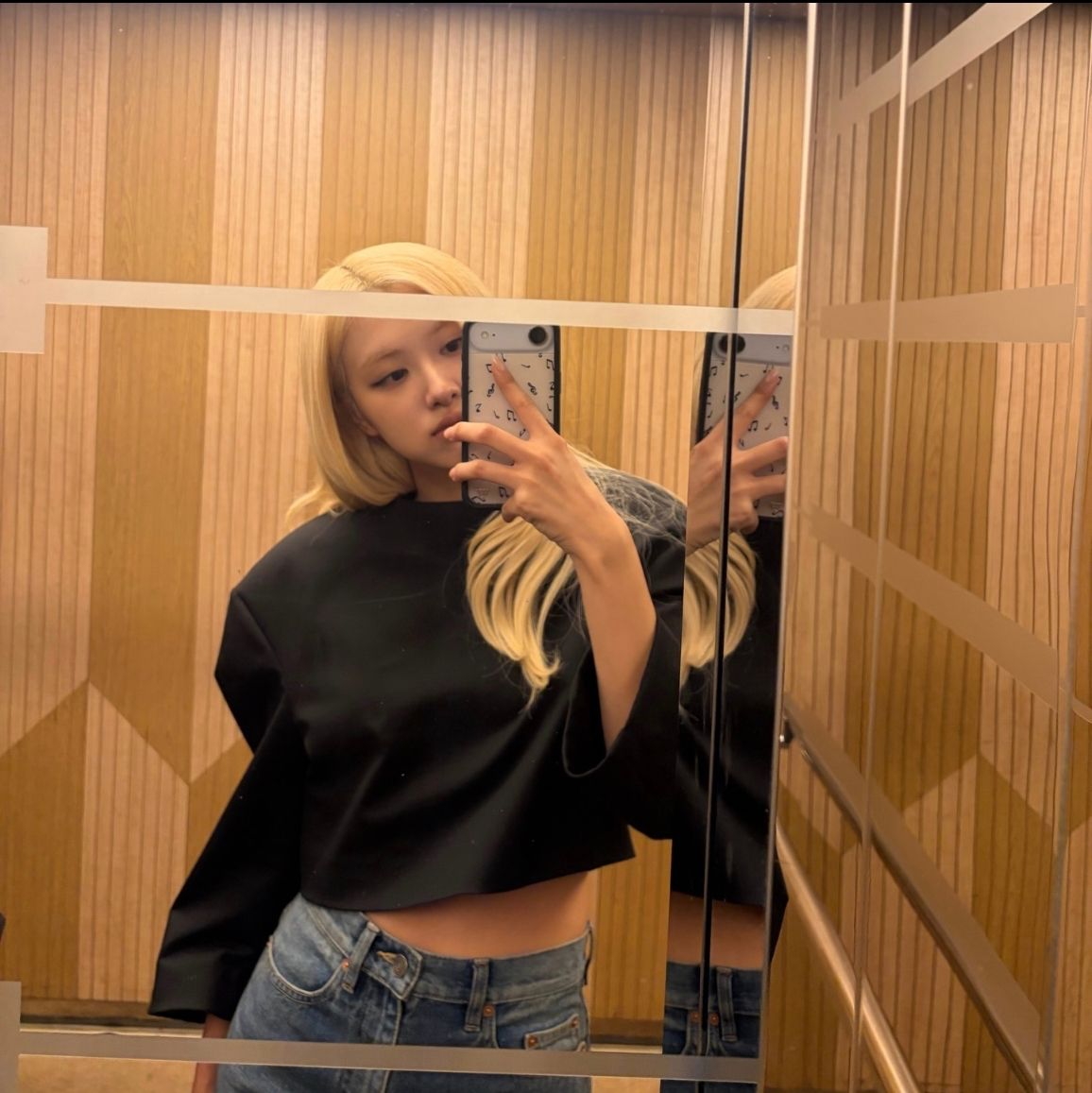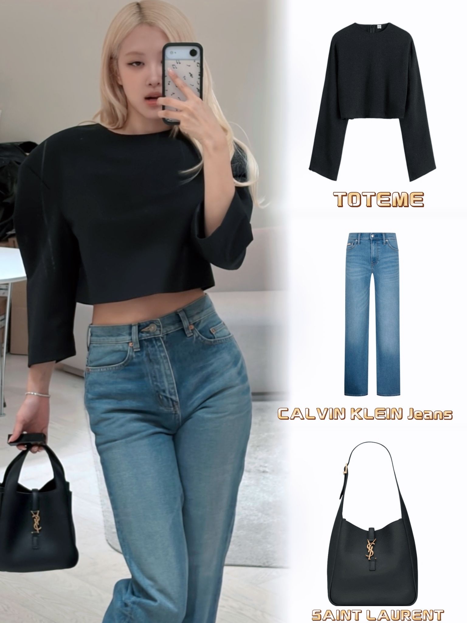Rosé这套对镜自拍真的把极简风刻在DNA里了🖤 工作室随手一拍,黑色短款上衣配高腰牛仔裤,YSL小包一提,直接把"quiet luxury"拉满!就是说这种越简单越高级的感觉真的很上头啊啊啊 ▪️单品拆解: 上衣:黑色短款圆领上衣(七分袖/微喇袖,衣长及腰,露一截腰线,极简无logo) 牛仔裤:中蓝色高腰直筒牛仔裤(经典五袋款,水洗自然,裤长及地) 包:YSL / Saint Laurent 黑...