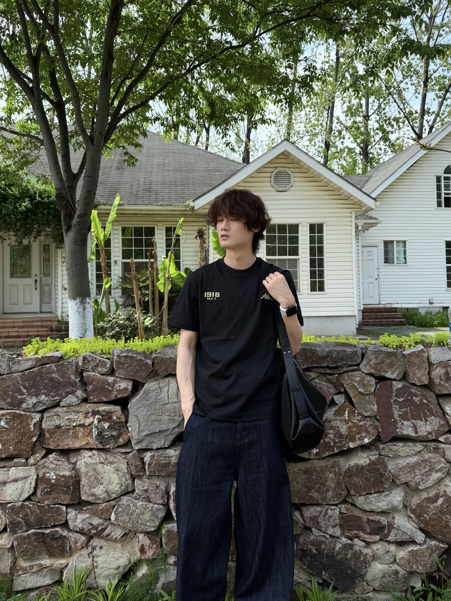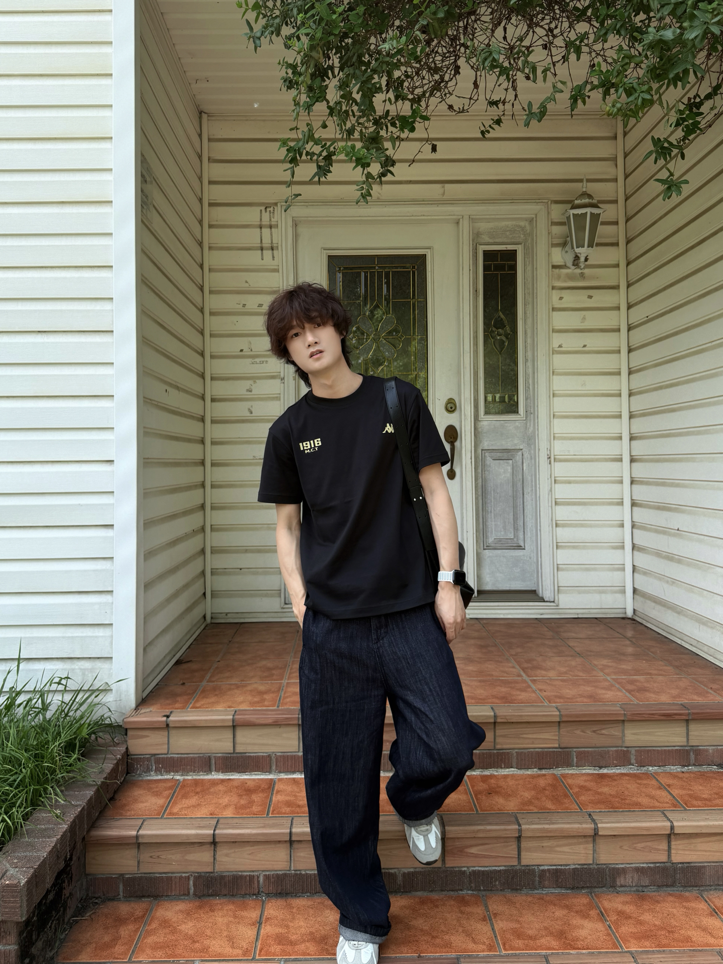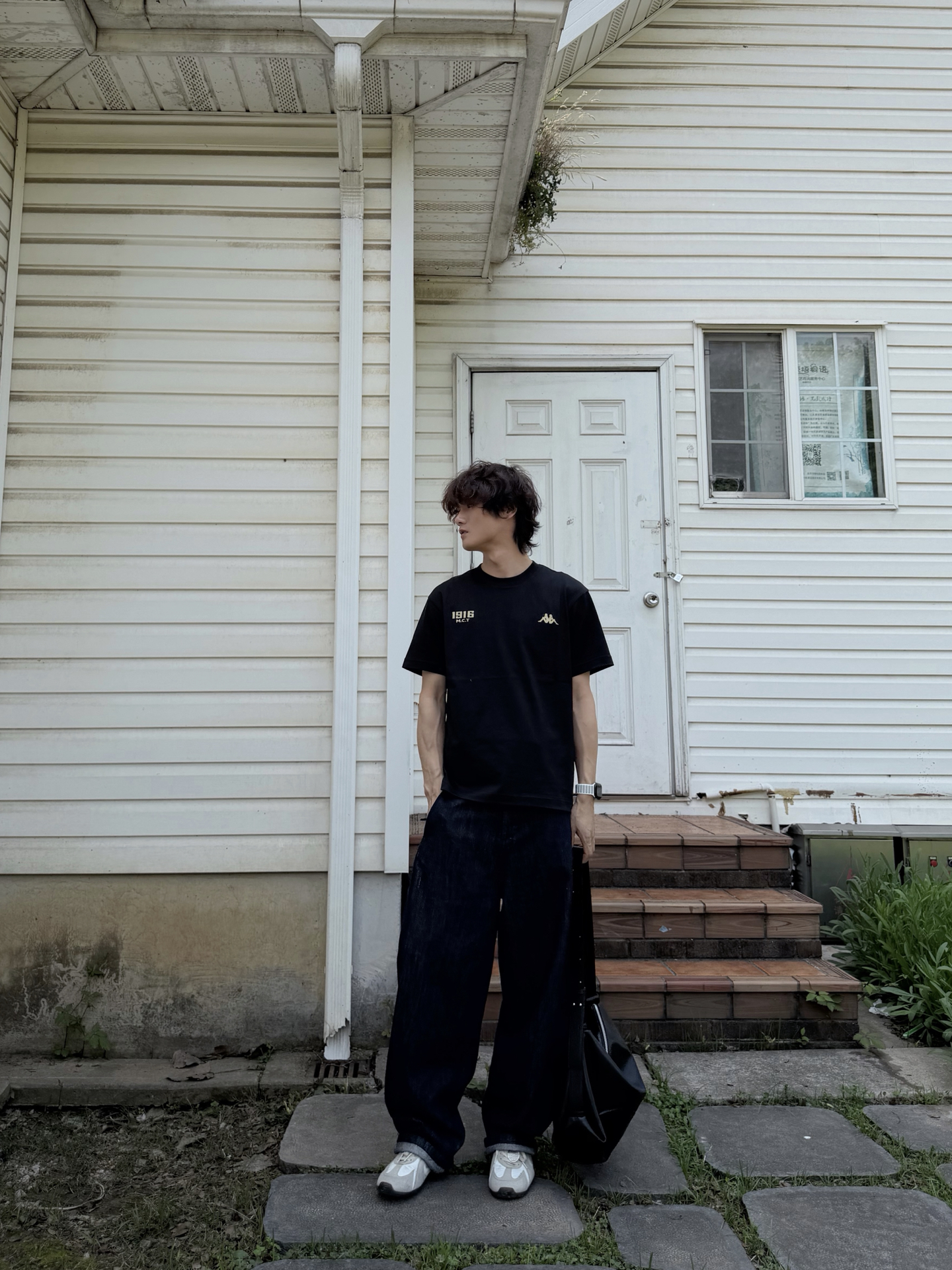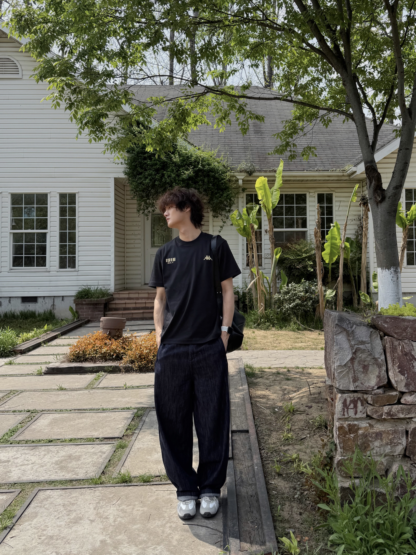 搭配思路:黑T+阔腿牛仔裤+小白鞋 ▫️上衣:KAPPA黑金短袖,面料软糯亲肤,金色logo细节提升质感,基础款也不单调 ▫️下装:原色阔腿牛仔裤,垂坠感很松弛 ▫️鞋子:简约小白鞋,平衡整体调性 不费力的酷帅感,学生党/打工人直接抄作业💥 短袖