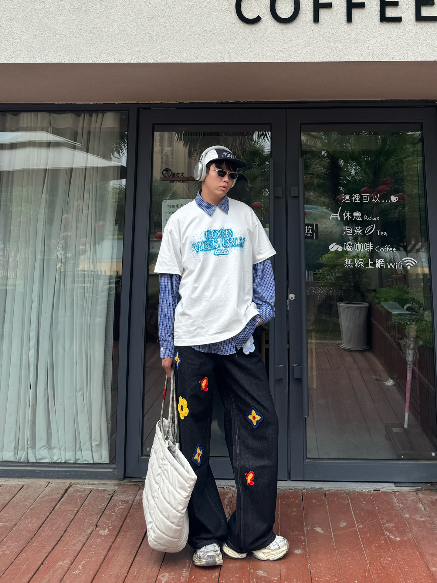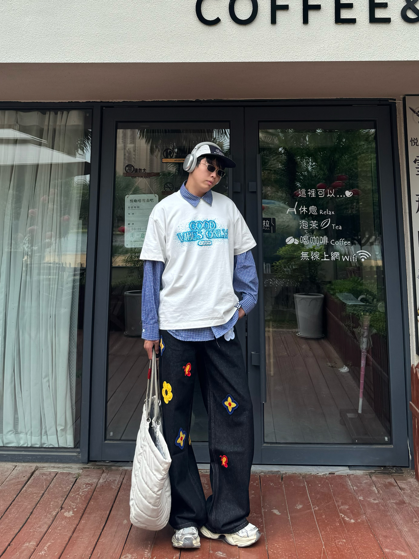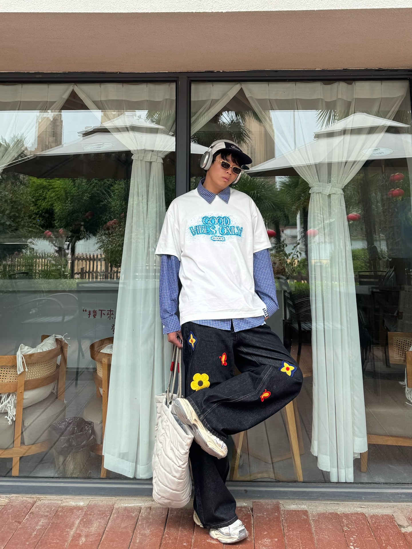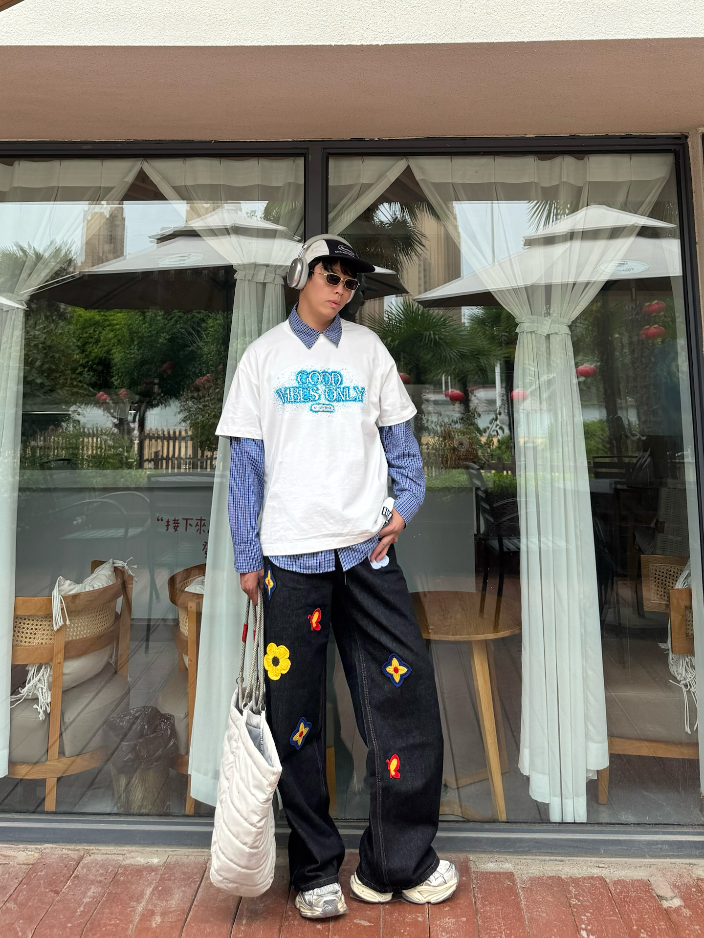 今日穿搭来自183/160 👔上身搭配一件白色T恤 👖下身搭配一条黑色印花牛仔裤 👟脚上搭配一双老爹鞋 🔗 夏天就爱这么搭简单又清爽 这件白T恤面料软乎乎的 贴身穿也不闷汗 版型宽松不贴身搭衬衫叠穿刚好有层次感不会显得臃肿 印花和整体风格也很搭看着干净舒服 出门不用费脑搭配 一套下来少年感直接拉满 短袖