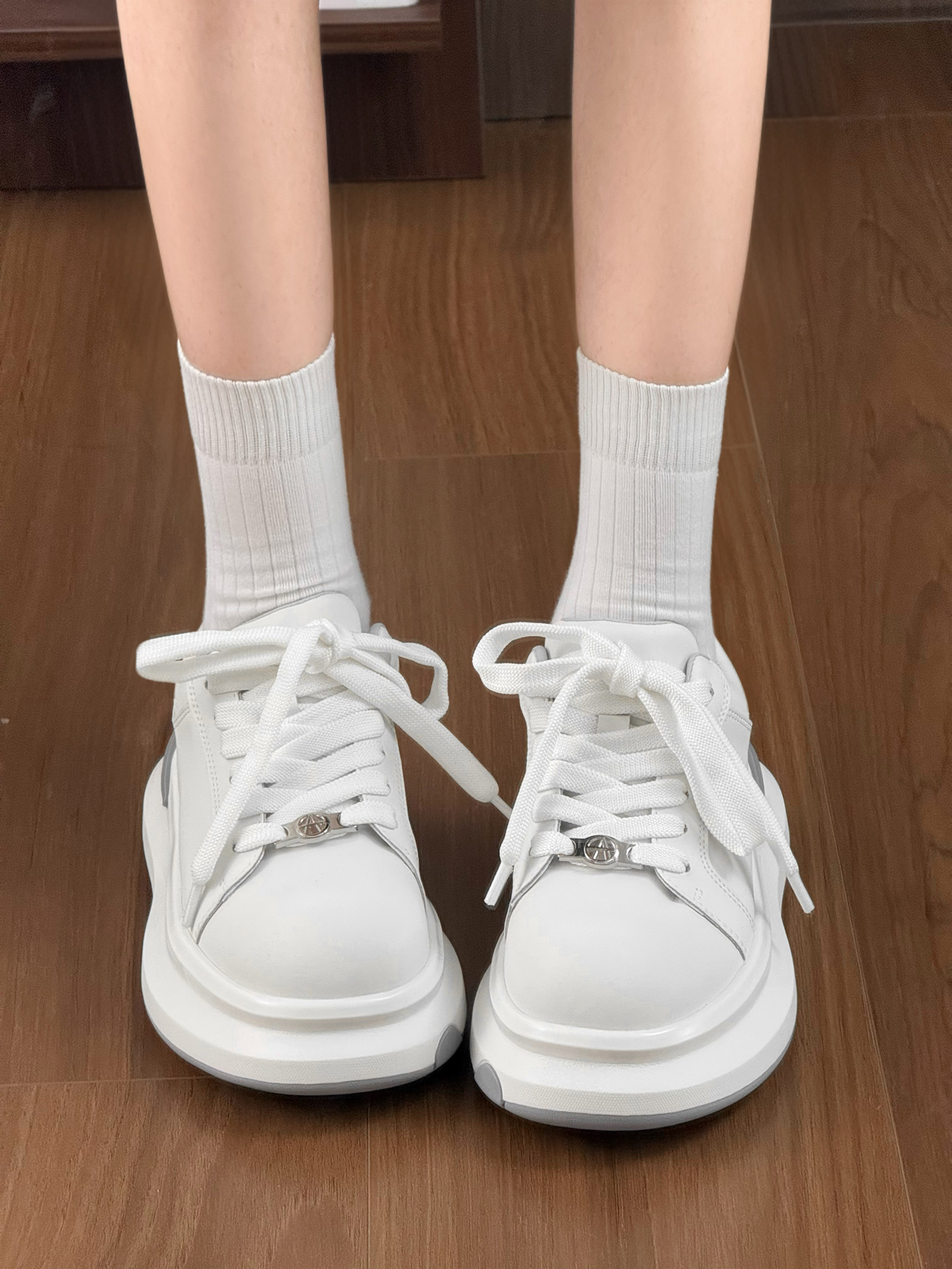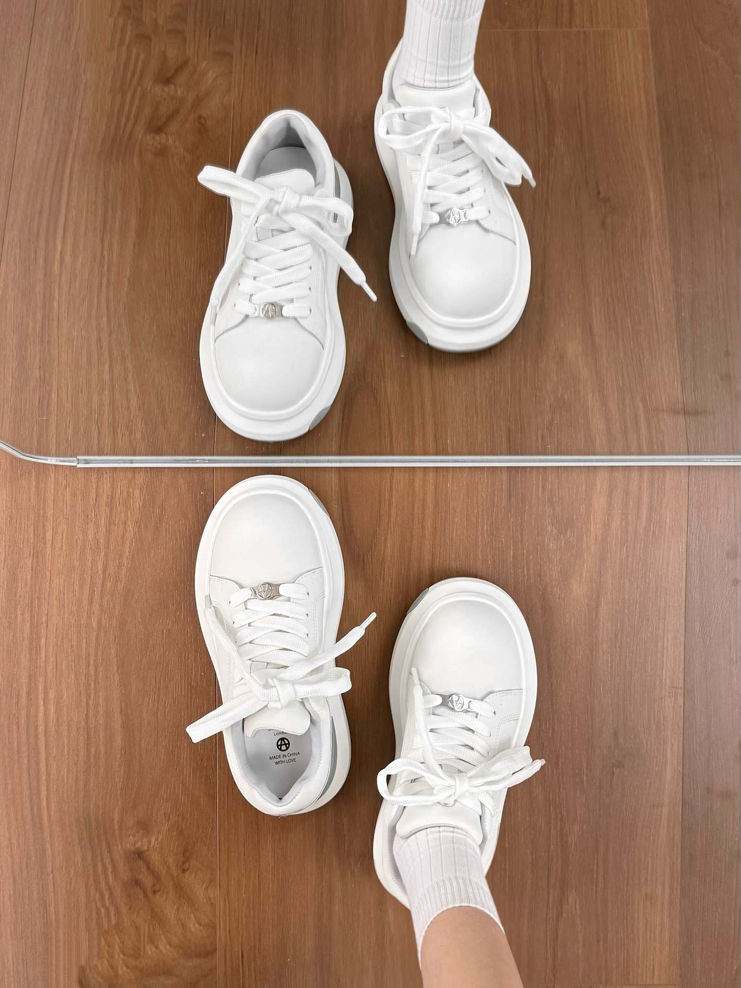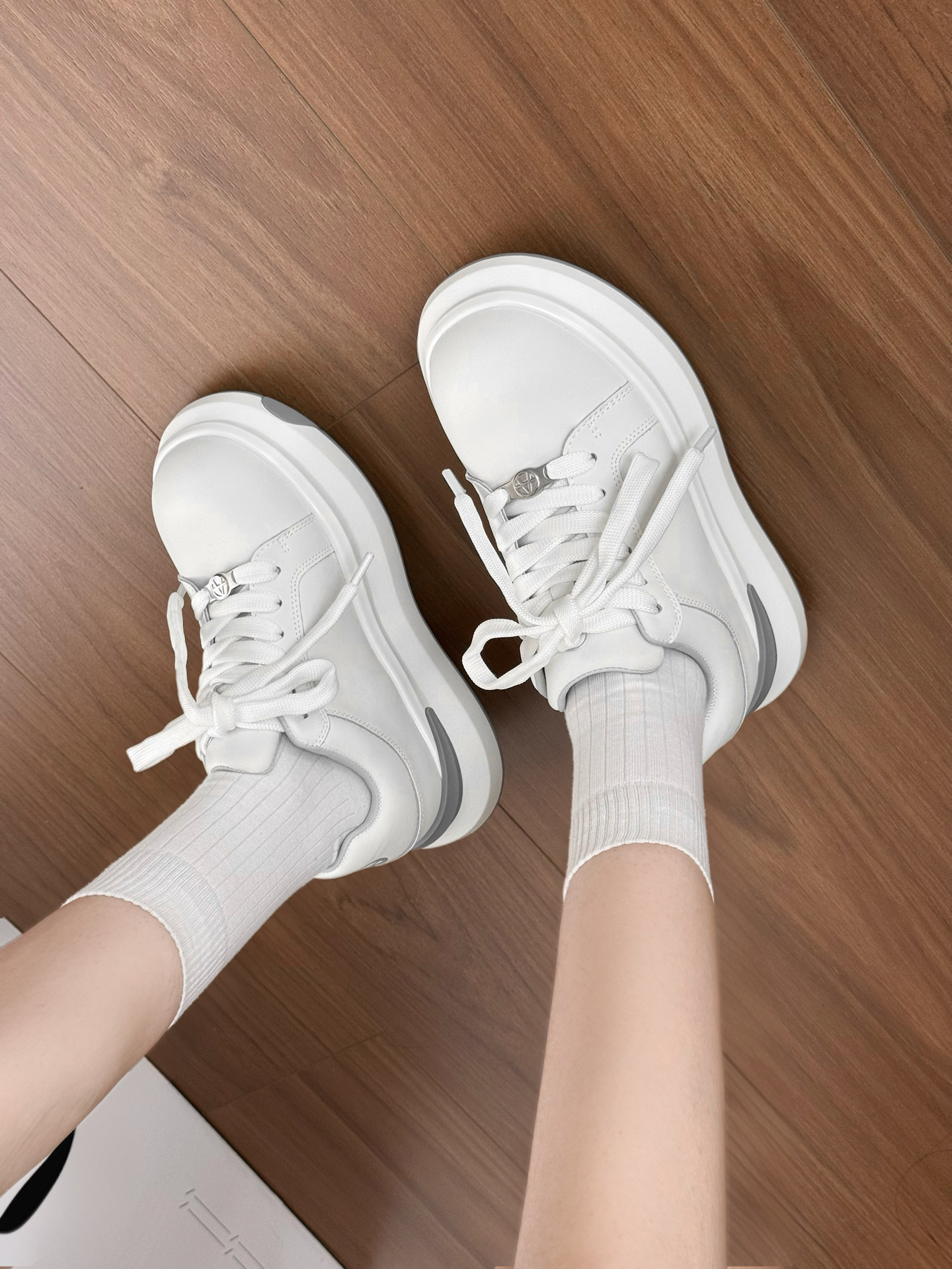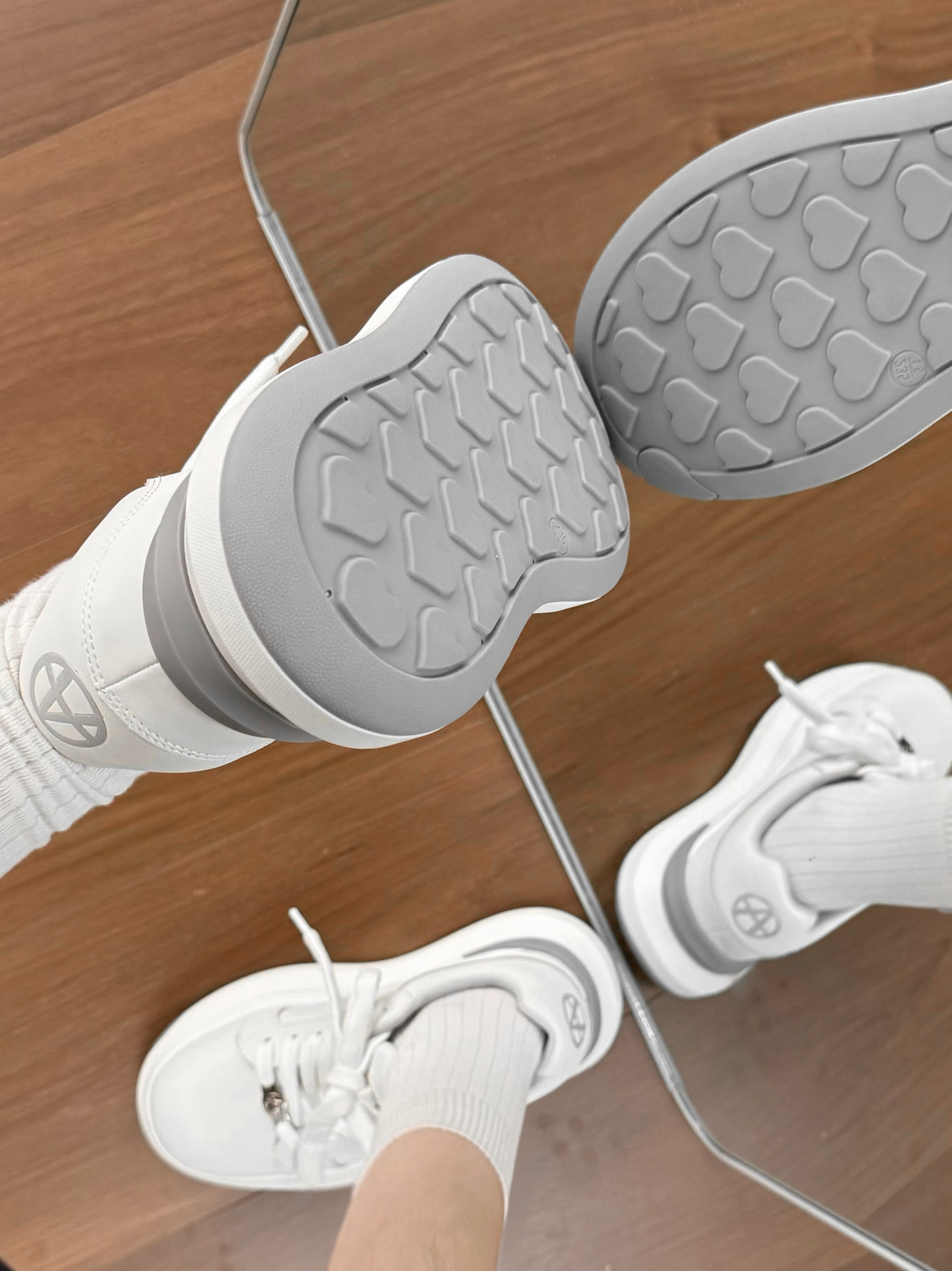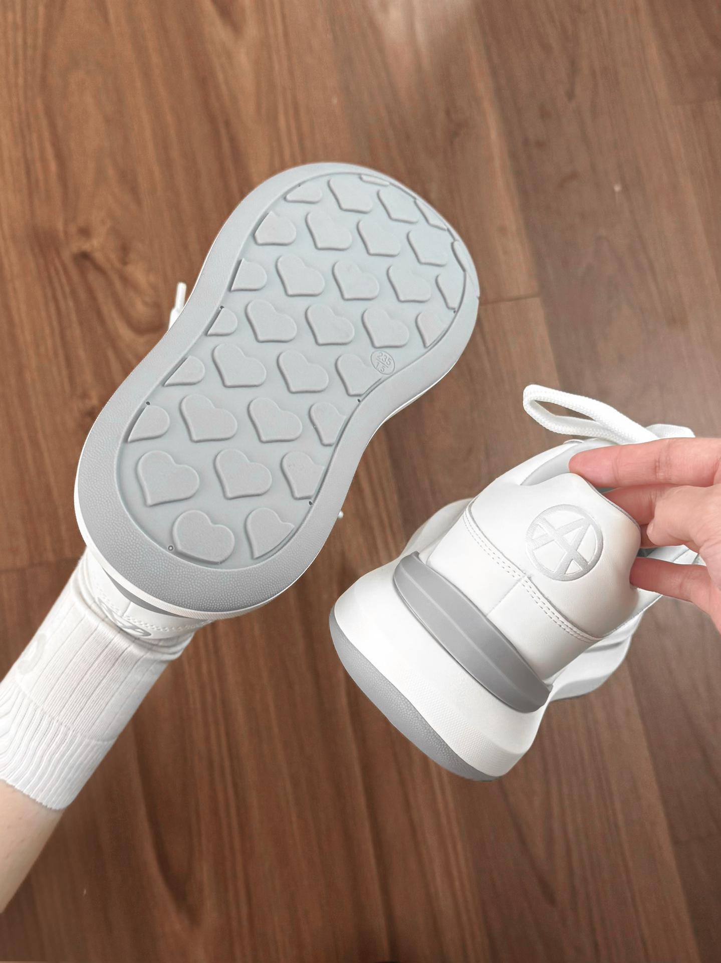 这不是一双简单的小白鞋耶 它踩进去有种踩气垫的感觉!! 鞋底的爱心好满足我的少女心 胖胖的鞋头真的老可爱了 厚底增高大概有个4-5cm的感觉 日常通勤穿 下班逛街也都OK 穿出去玩其实也hin好康嘟