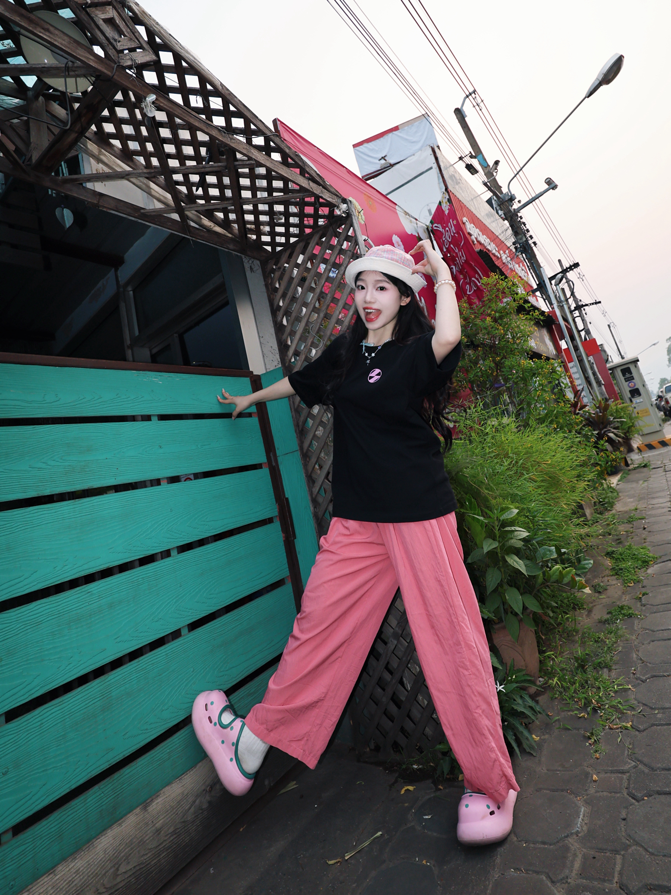 我真的泰喜欢清迈的街头啦 每个街角都超有氛围感 今天穿的T恤➕长裤,很松弛的街头穿搭 衣服透气性很好,上身不会觉得闷热 还是明星同款,尊滴好喜欢 加上这边的天气其实也是那种蛮舒服的 不会太热,感觉这么穿出去citywalk真的太舒服啦 好看还舒适!下次还要来度假!