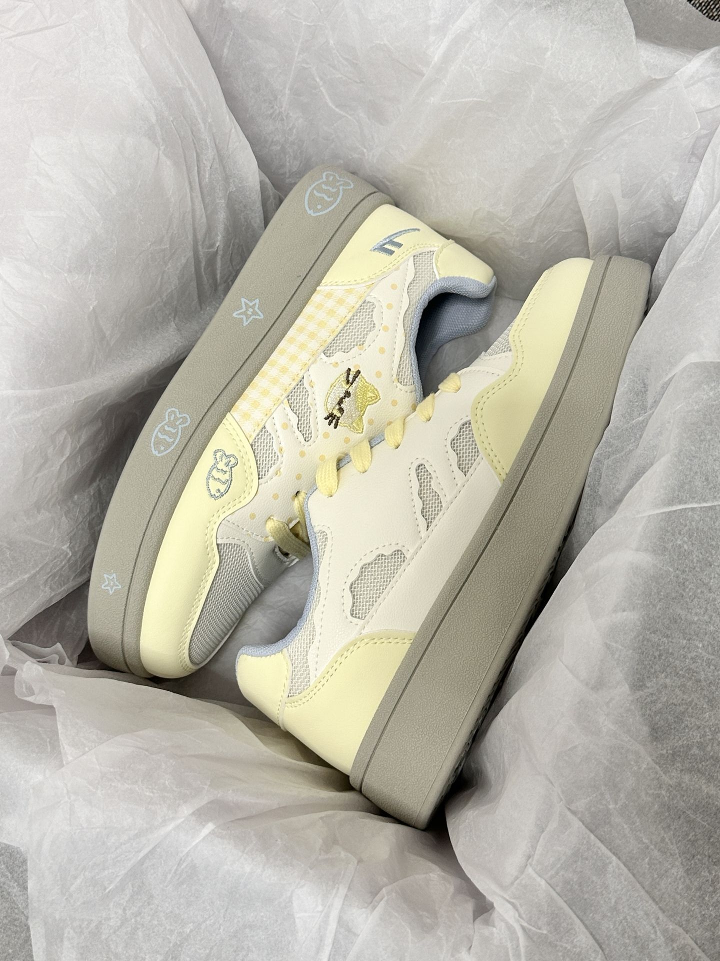 我挖到了一双好看的多巴胺板鞋✨ 奶呼呼的奶油黄配色 鞋型是网面材质透气又清爽 夏天穿脚脚不闷汗哦! 鞋身的小猫刺绣软萌萌哒 波点和格纹设计敲有少女感 穿起来鞋底软软的!