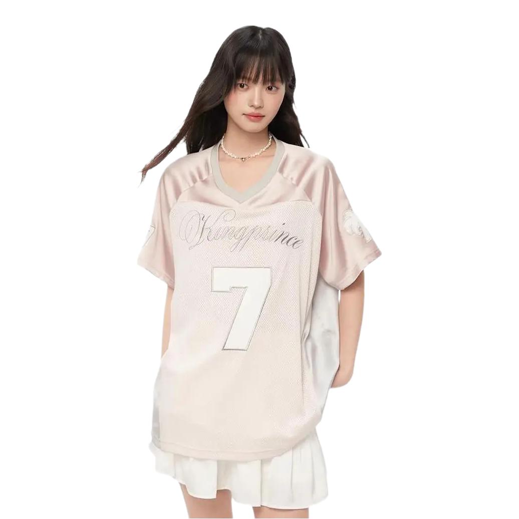 特调樱花粉撞银灰拼接,搭配醒目数字7印花,自带美式复古松弛感。网眼透气面料清爽不闷汗,oversize版型藏肉显瘦,既能搭短裤玩下衣失踪,也能配leggings走辣妹运动风,黄黑皮也能轻松驾驭,是日常出街、公园拍照、运动通勤都适配的百搭款,穿上秒变元气甜酷少女!