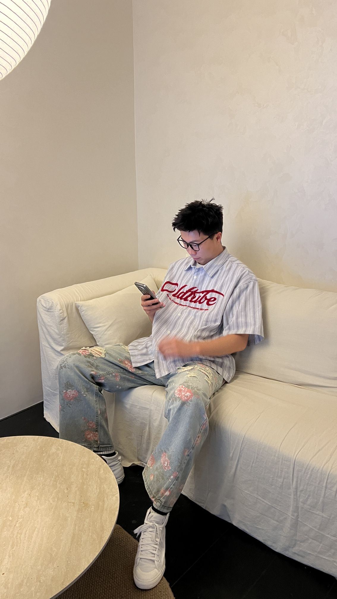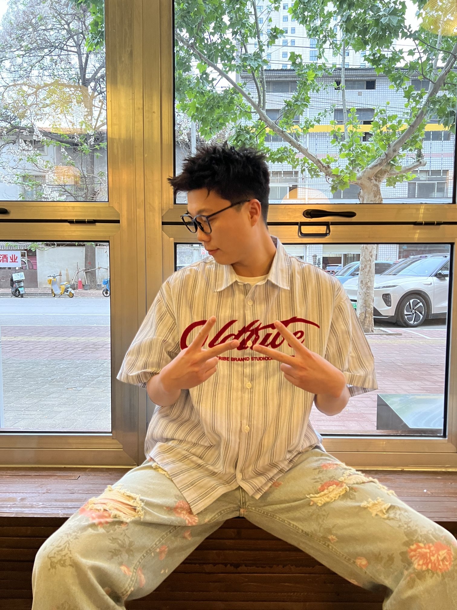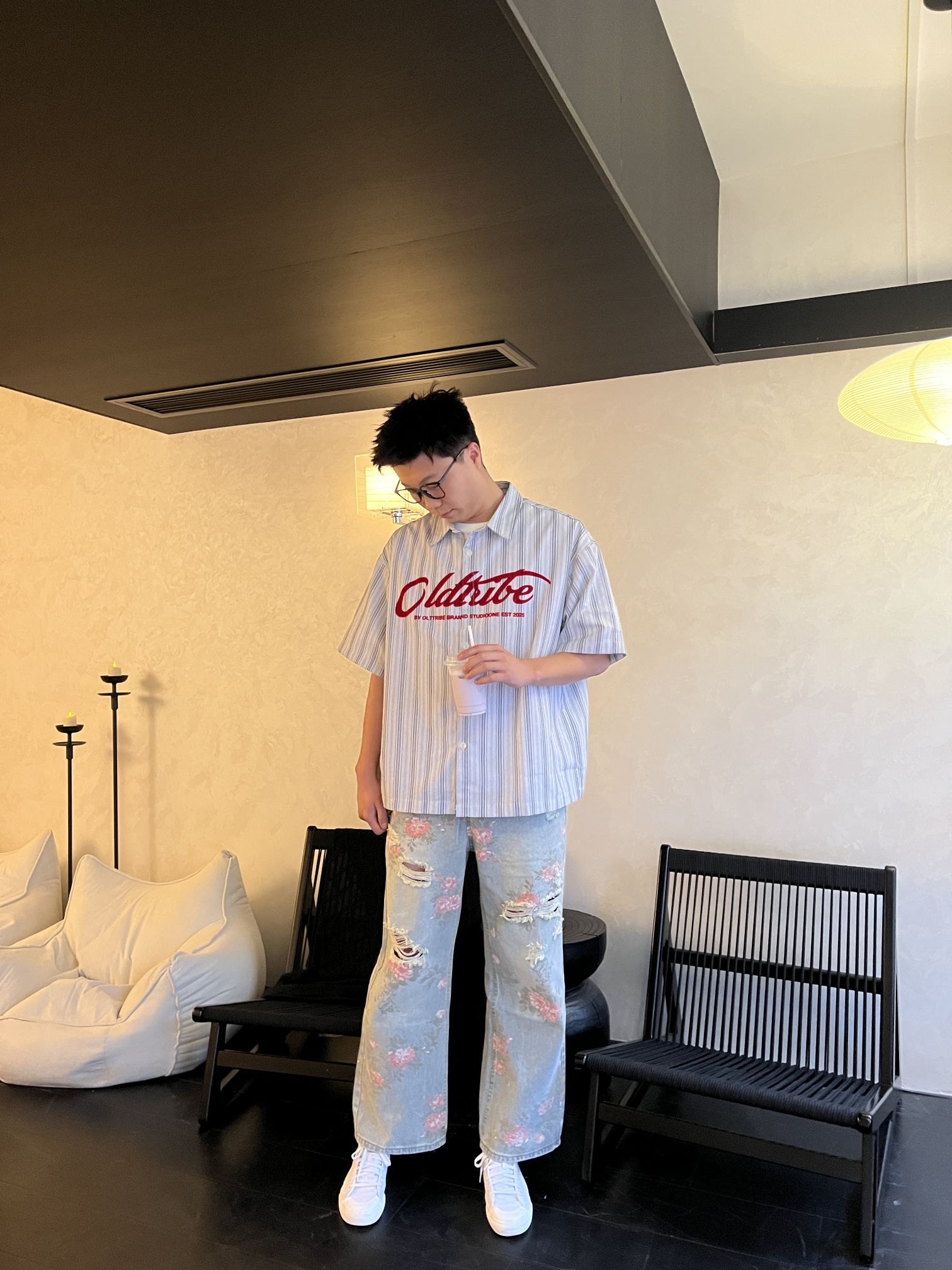 夏天就该穿这种清清爽爽的蓝白调! - 衬衫是oversize条纹款,红字母印花一下打破单调,美式复古味拿捏 - 裤子真的是亮点!破洞+玫瑰刺绣的设计,甜酷平衡得刚刚好,水洗蓝也超有质感 - 白鞋收尾,整体松弛又不邋遢,日常出门或者和朋友喝咖啡都很合适 谁懂啊,这种干净又带点小心机的穿搭真的很戳!