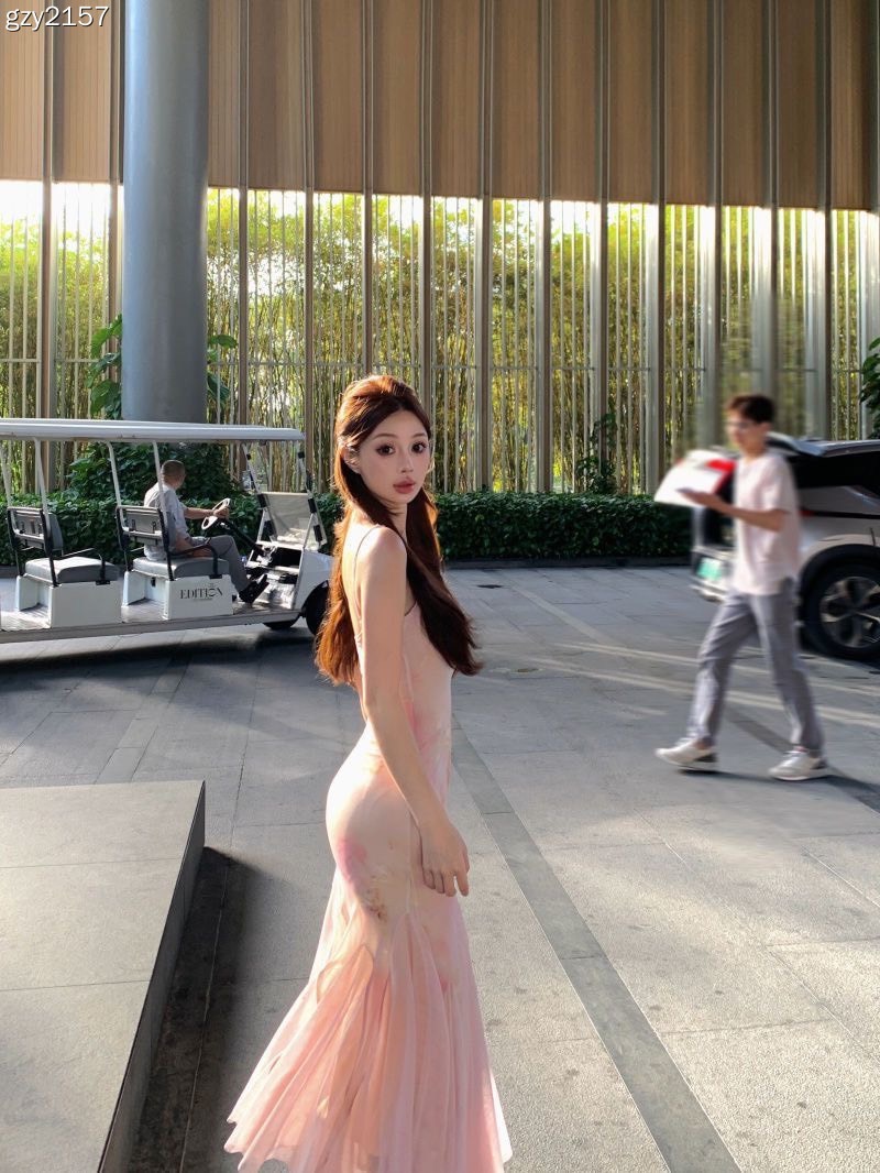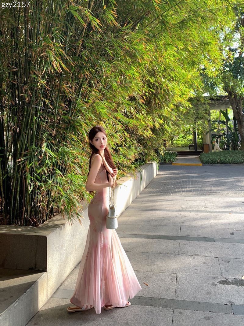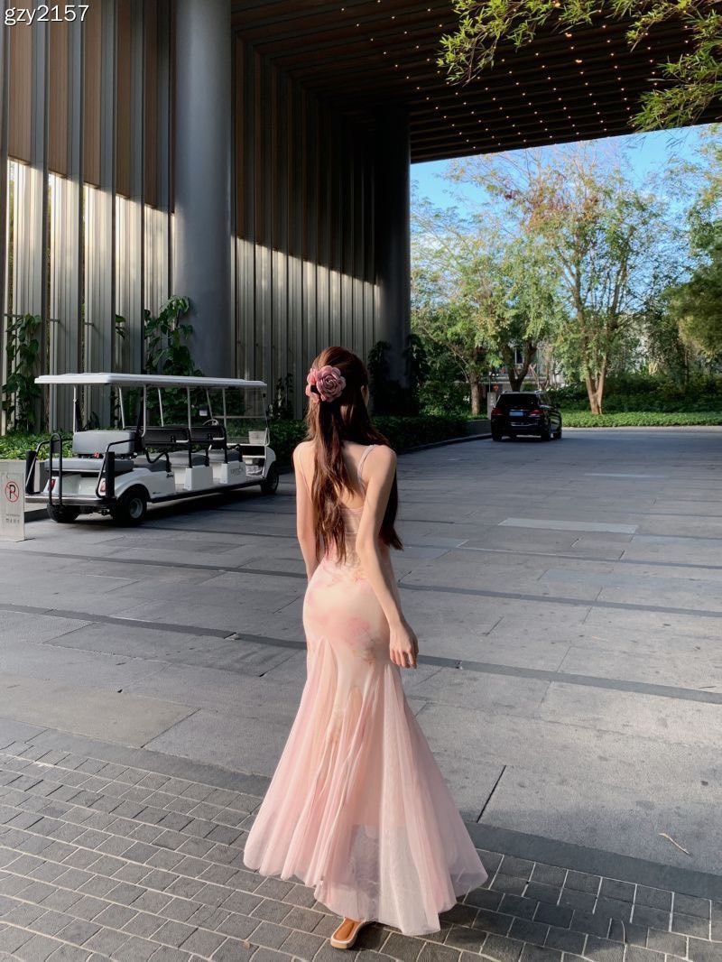 新粉色网纱吊带长裙,M码,夏天穿很仙,海边度假拍照超好看!鱼尾裙摆,收腰显身材,面料轻盈不透,细节图可以私聊发 包邮