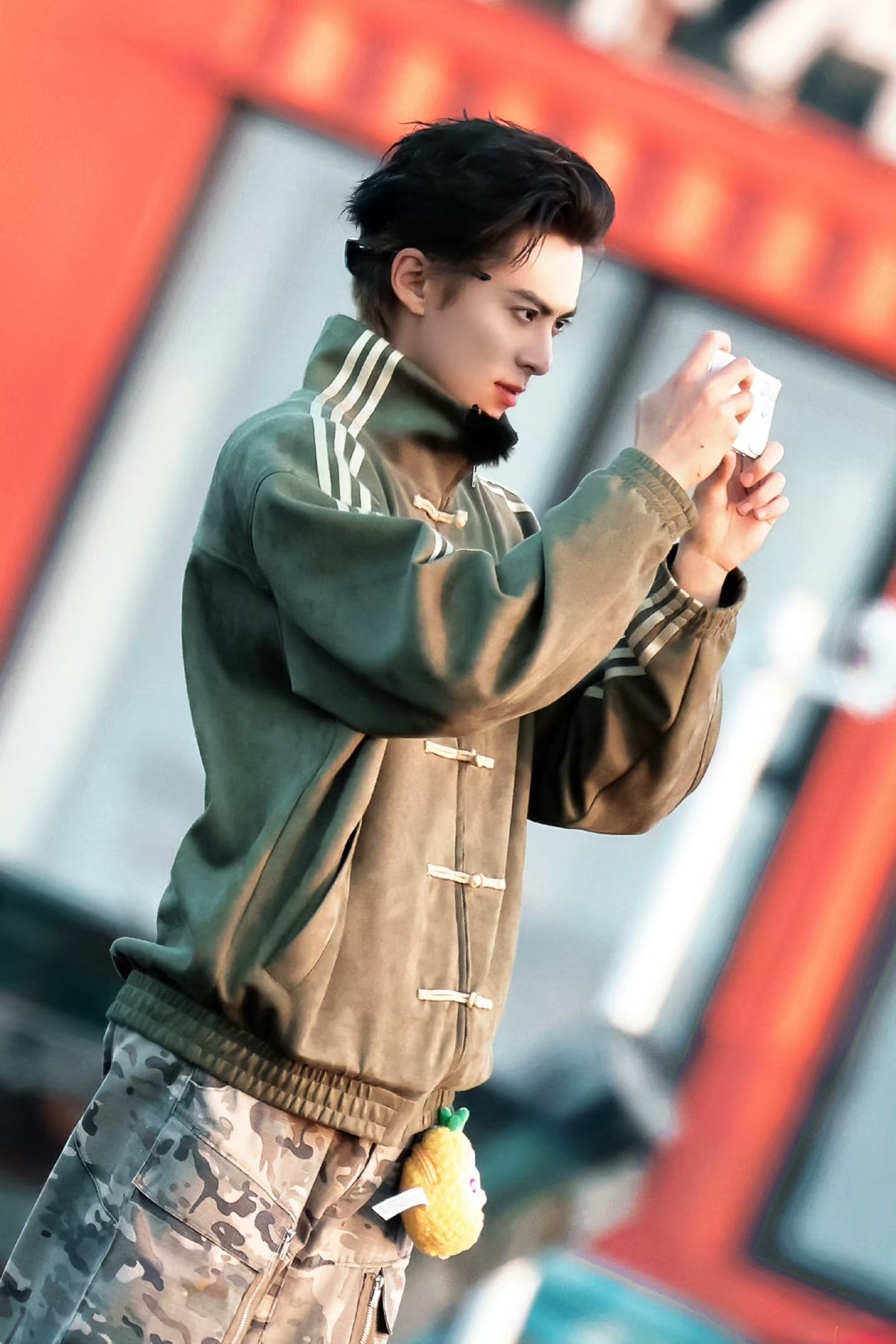 橄榄绿麂皮感新中式外套+经典三条纹,盘扣设计撞运动版型,东方腔调直接和街头酷感狠狠锁死🔒 下身迷彩工装裤自带松弛感,海边石头上一站,随手拿相机的样子像极了那种又拽又会拍的少年感帅哥,连腰上挂的小菠萝挂件都在戳我心巴🥹 国潮和运动风的碰撞被他玩明白了,日常出街直接抄作业都不翻车! 这一身既有国风的独特韵味,又带着少年的不羁随性,难怪被粉丝说“帅到失语”,棣棣的穿搭审美真的没话说✨