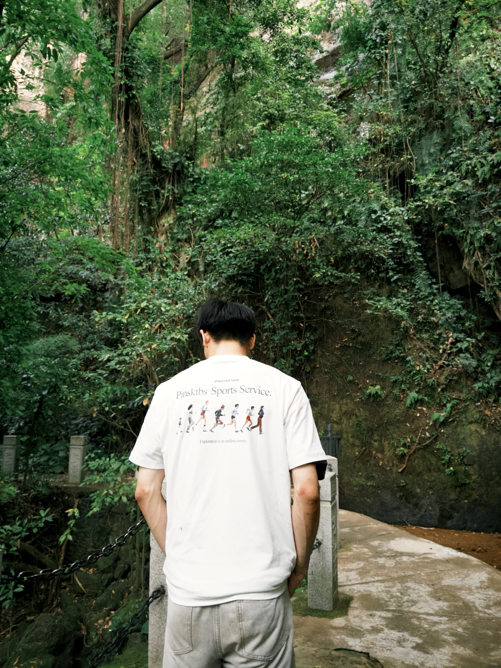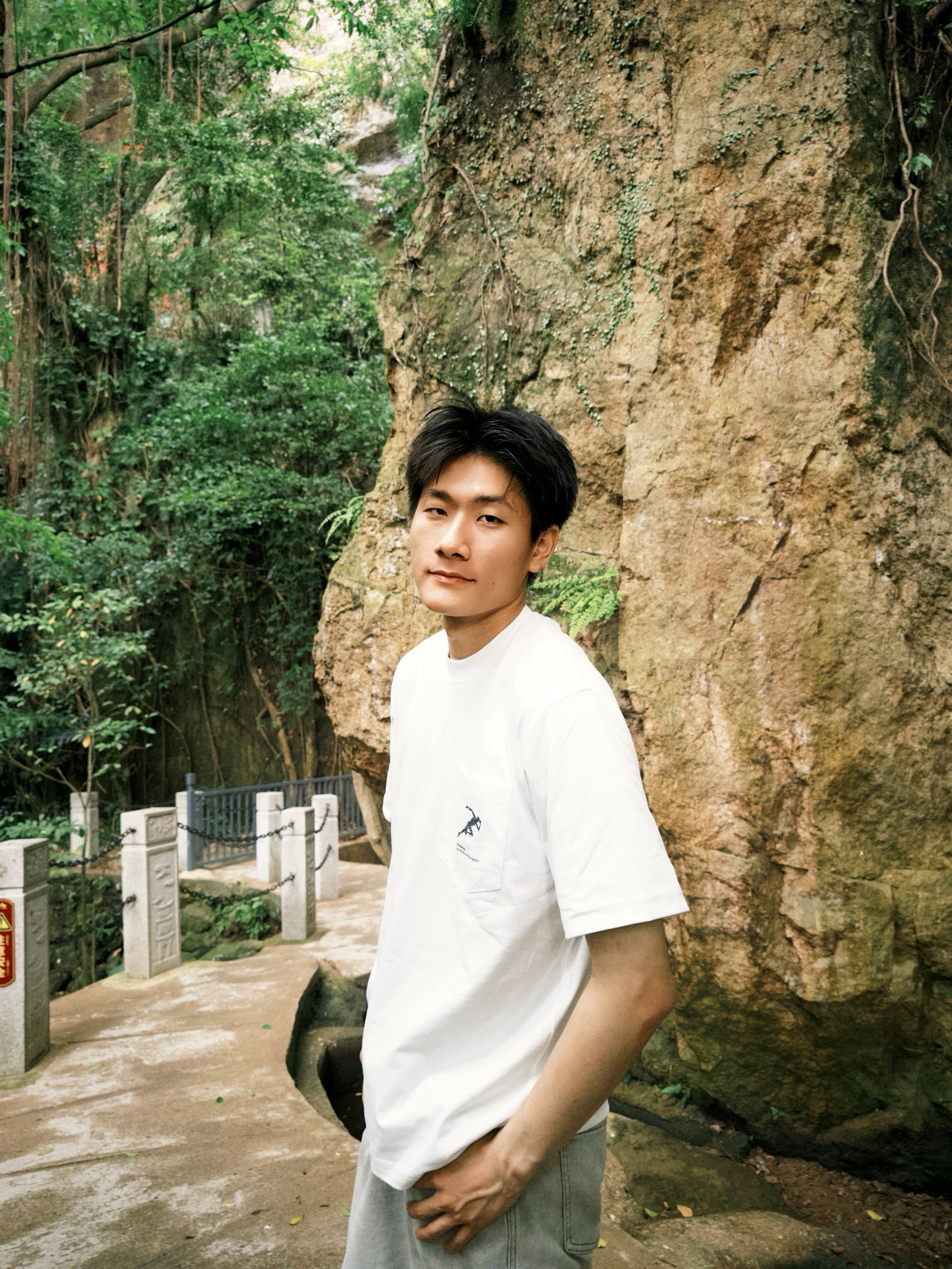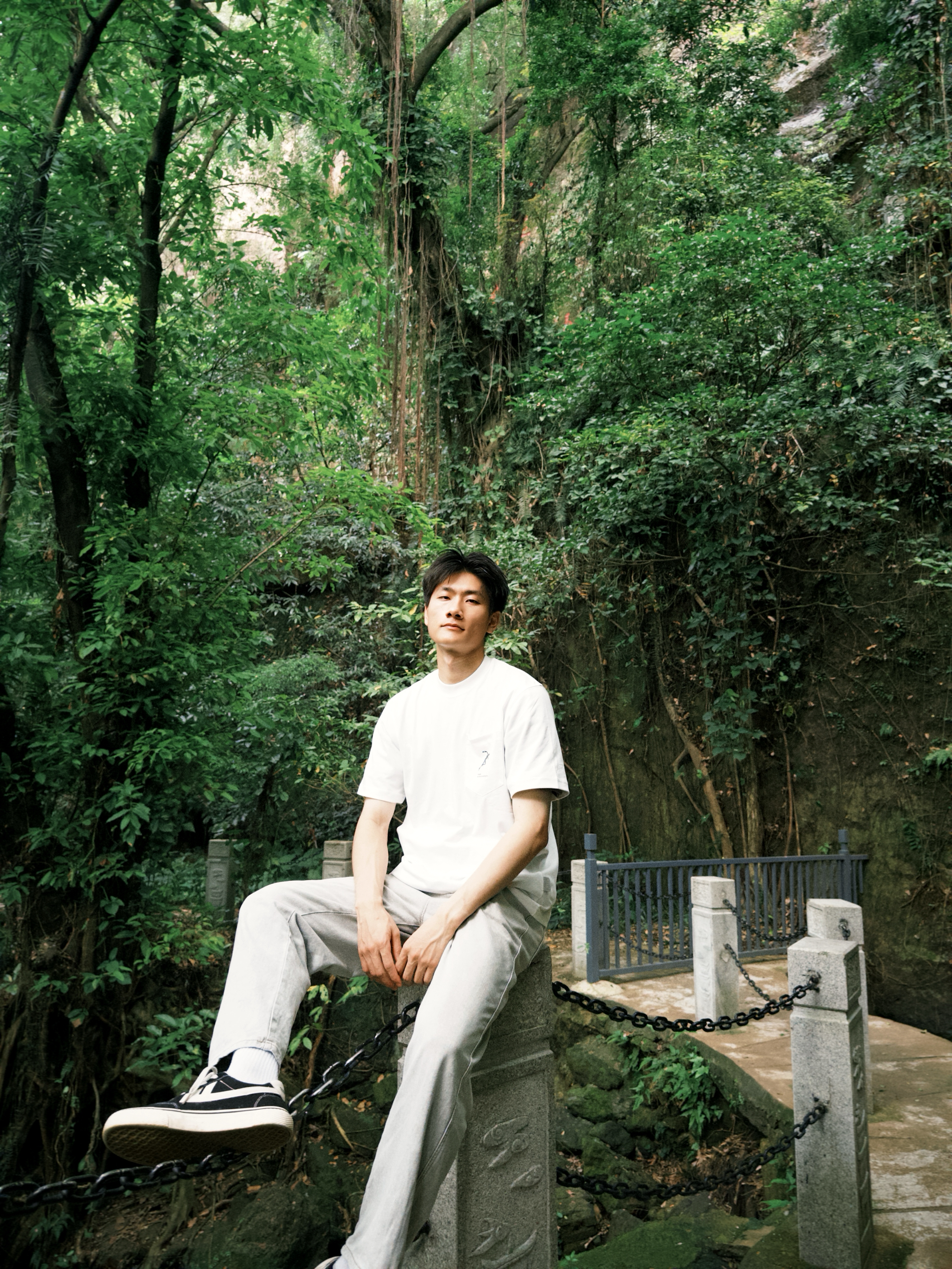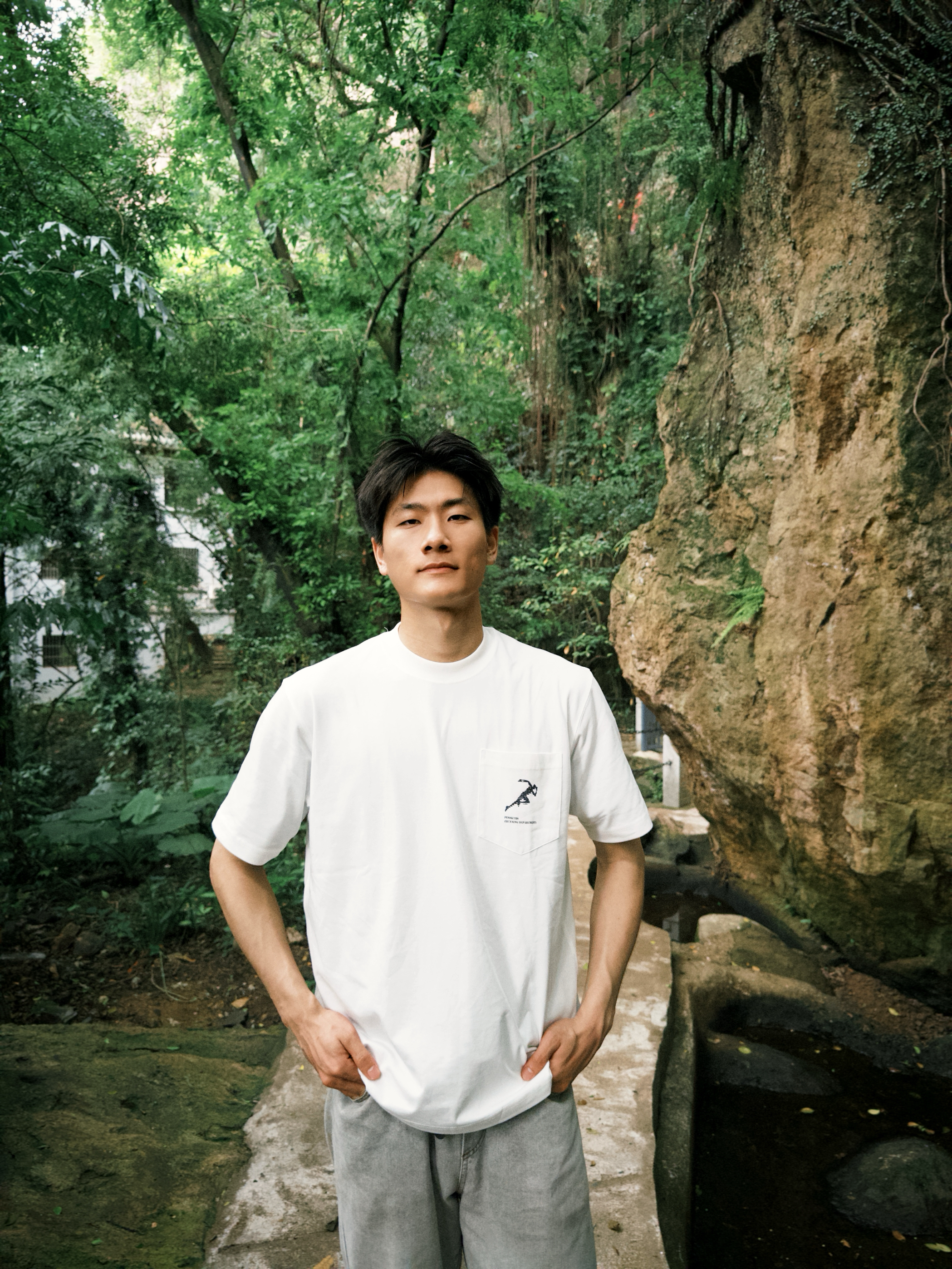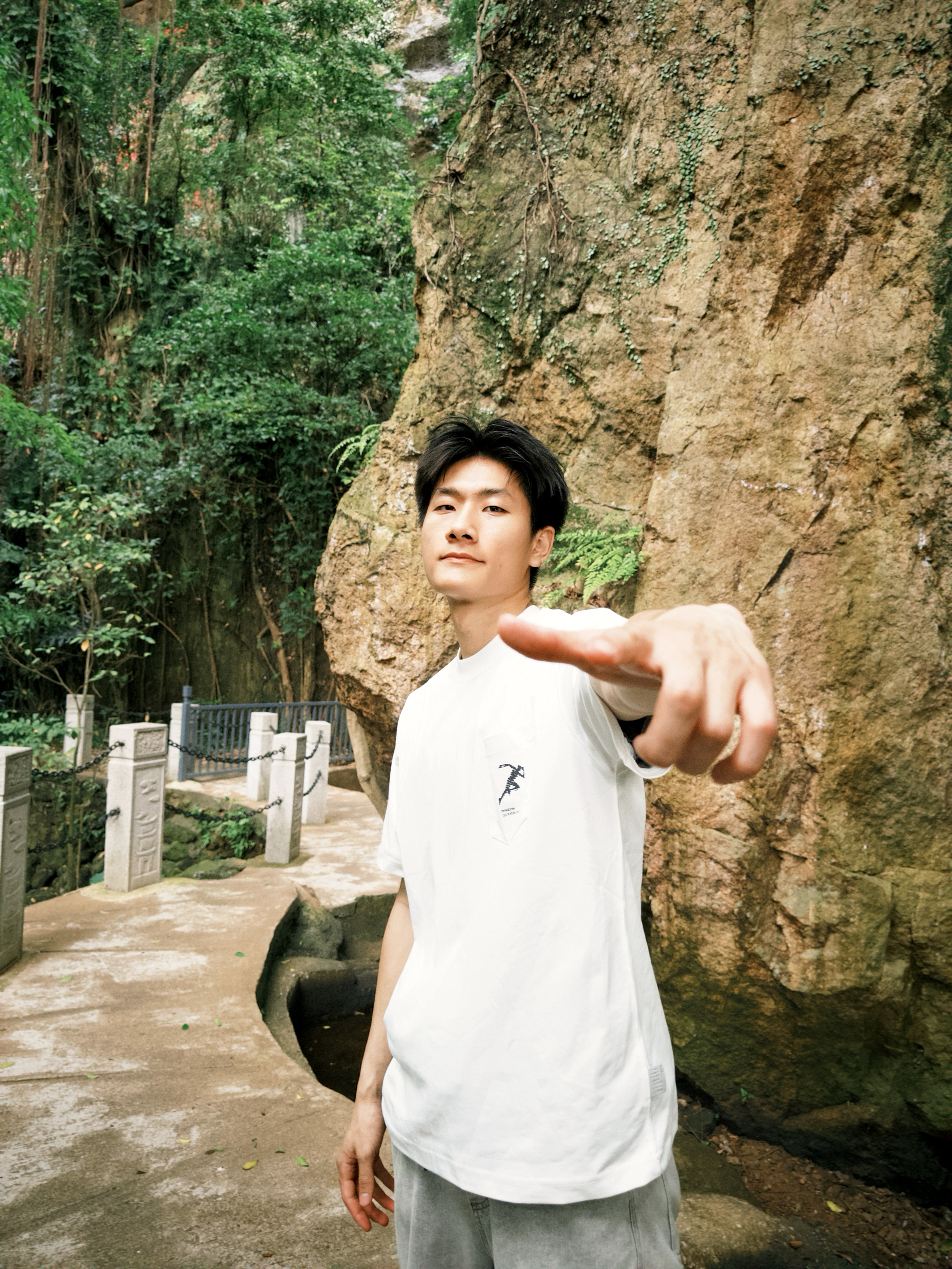 白简约T+浅灰休闲裤 跑进山林里,这套穿搭太适配了!白色T恤简简单单,特别显干净,面料透气又舒服。浅灰休闲裤一搭,走路逛景点完全没束缚。在这种充满绿意的环境里拍照,松弛感直接拉满,舒服又上镜~