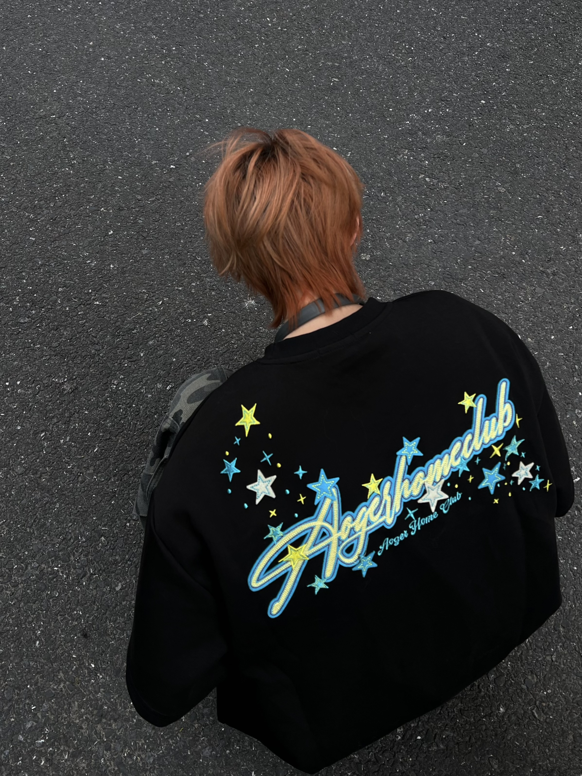 男生夏天的本命短袖终于被我挖到了✨ 本来只是被星星涂鸦吸引,到手才发现质感超出预期 刺绣是那种立体的,摸起来很有分量,不是那种廉价印花🤩 黄蓝配色的星星和手写字体,黑底穿起来超显白 前后呼应的设计,正面低调,背面出门就是回头率密码 面料是偏挺括的,不会软塌塌的,夏天穿也不闷 搭迷彩裤、牛仔裤都好看,衣柜里终于有件不单调的黑T了 夏天随便一套都自带少年气,懒人穿搭直接抄作业💯