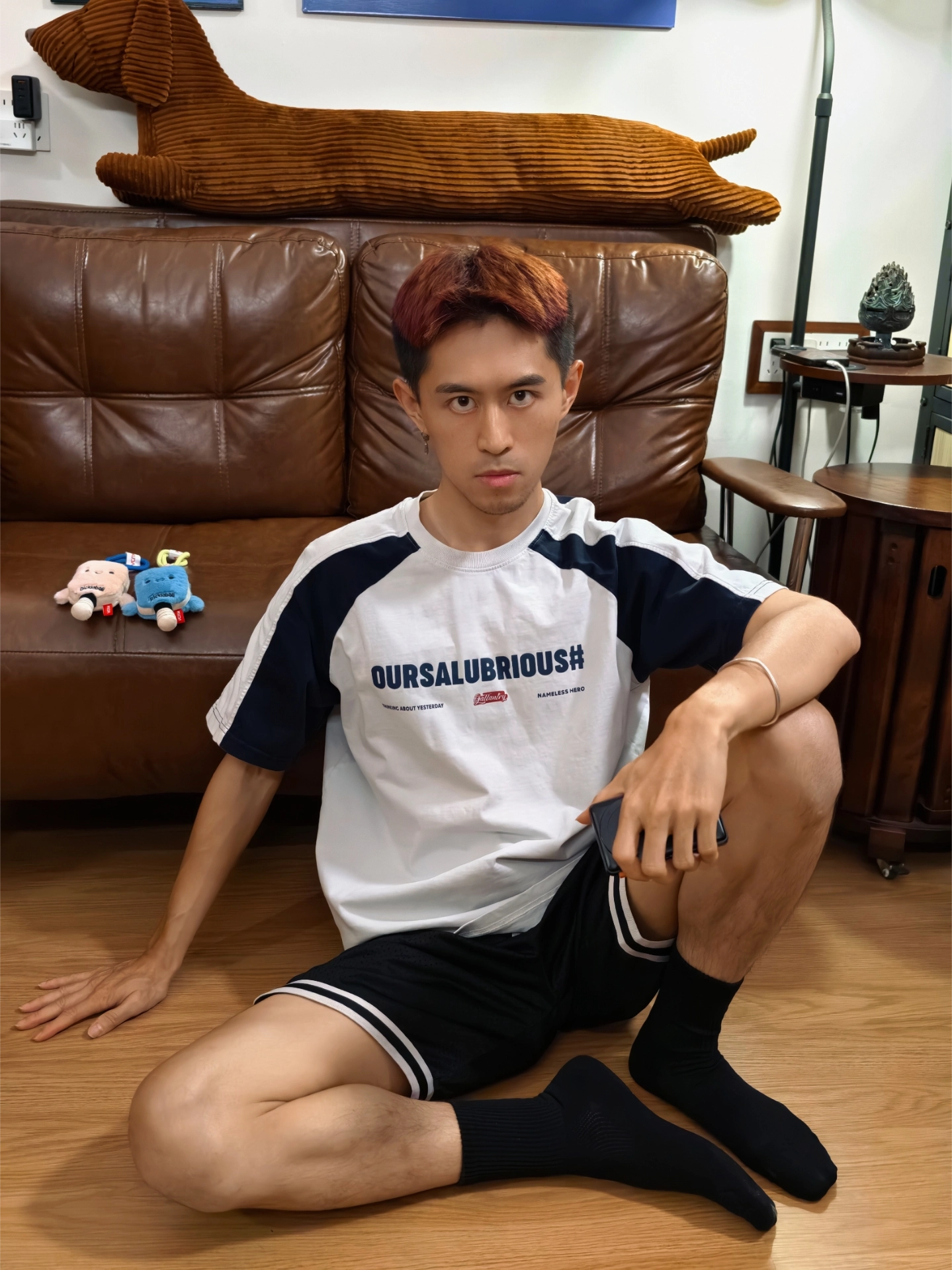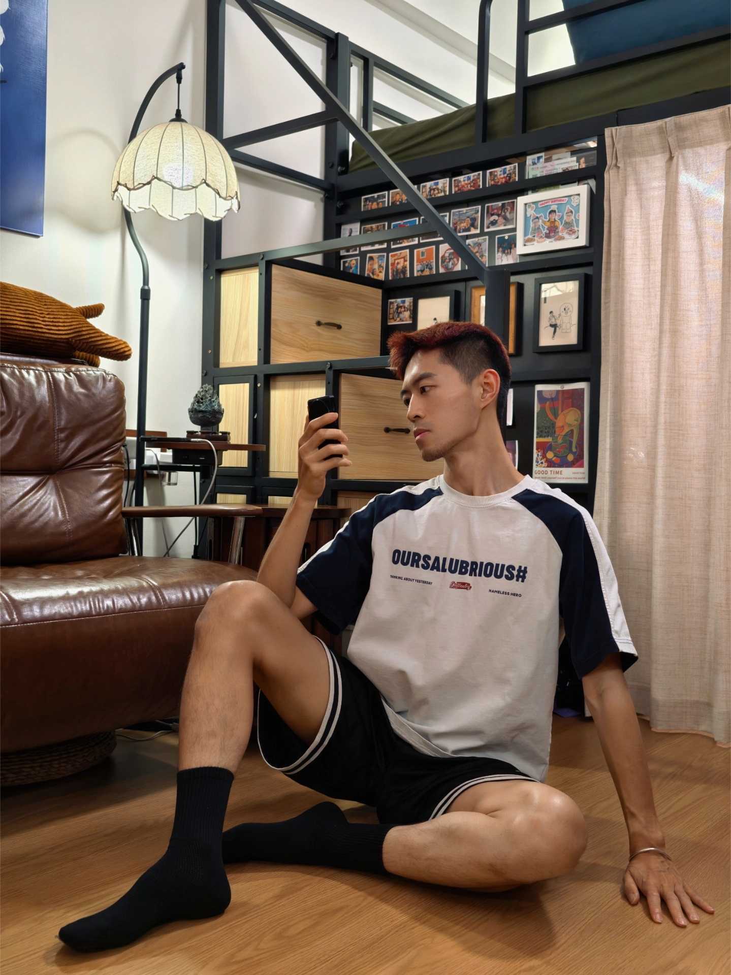 👕白蓝拼色T恤版型松垮舒服,胸前字母印花带点随性劲儿,清爽又不挑人,贴身穿也不闷。 🩳黑边运动短裤利落显腿直,侧边白条和上衣的配色刚好呼应,动起来也没束缚,少年感一下就稳了。 🧦这双黑中筒袜真的挖到宝了!透气不闷脚,吸湿排汗巨能打,穿久了也不臭脚,弹力够大不勒脚踝,搭啥鞋都合适,懒人直接闭眼冲。 -
