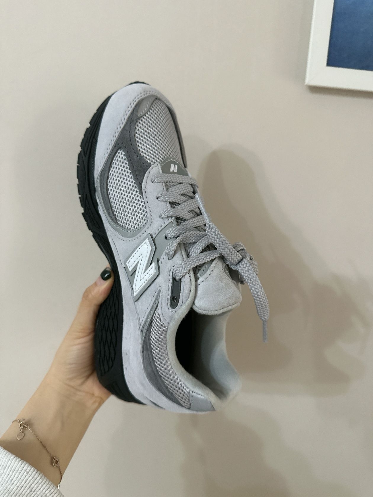 最近通勤天天蹬这双2002r云雾灰👟,真的越穿越爱!鞋面是织物+合成革组合,透气还带点质感,日常搭浅色系衣服就很有活力🌱~上周穿它配白色休闲服去操场散步,朋友说我整个人清爽又时尚😎!走大半天脚也不酸,舒服到不想脱! 不过要注意⚠️:浅色鞋面容易沾灰,白色部分用橡皮擦就能擦干净🧼~尺码正常,我宽脚穿平时码刚好✅!