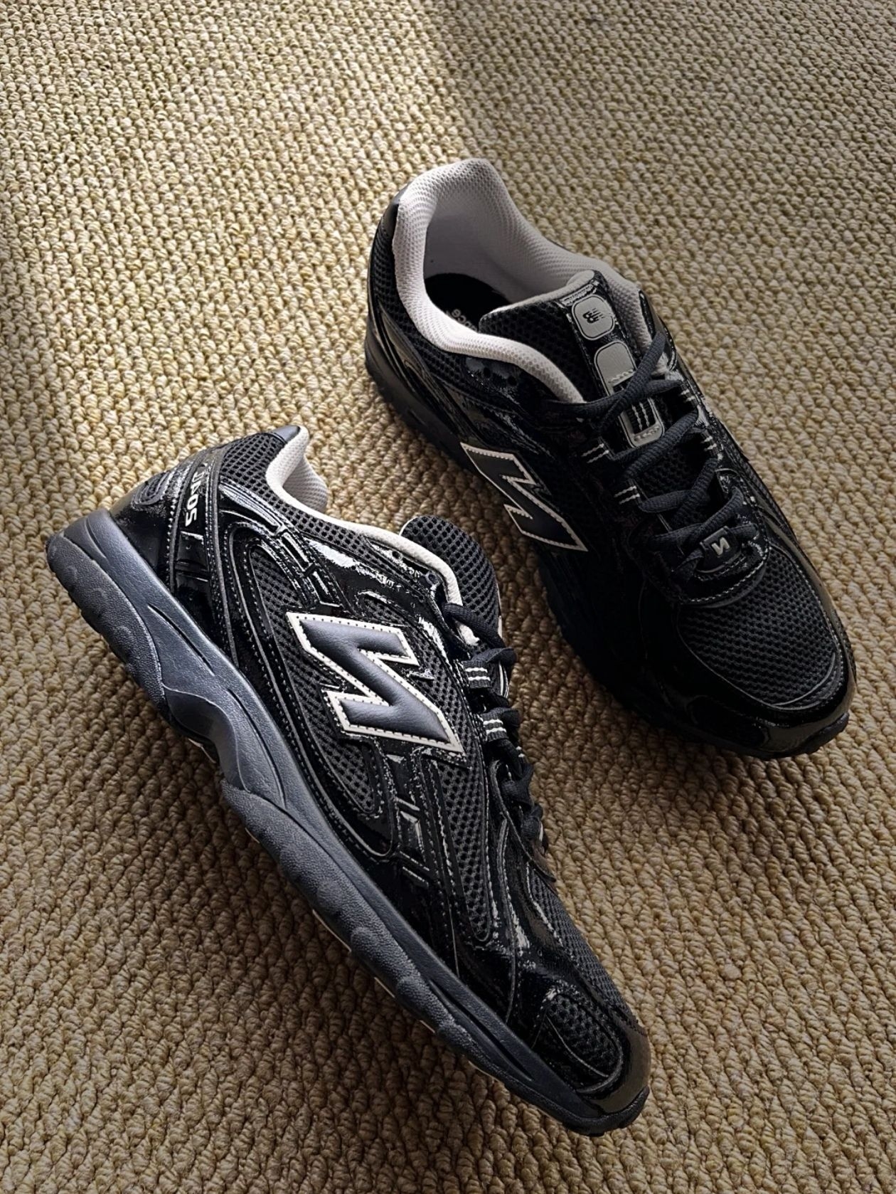 刚上脚这双 NB 1000 系列,亮面黑革和网眼的拼接太有千禧那味儿了。漆皮在光下泛着冷调光泽,白边 N 字标刚好提亮,鞋舌的小细节。配做旧牛仔或束脚工装裤都很顺,软弹不压脚,逛一下午也舒服,低调里带着点复古狠劲,日常出街或通勤都能穿,越看越耐看