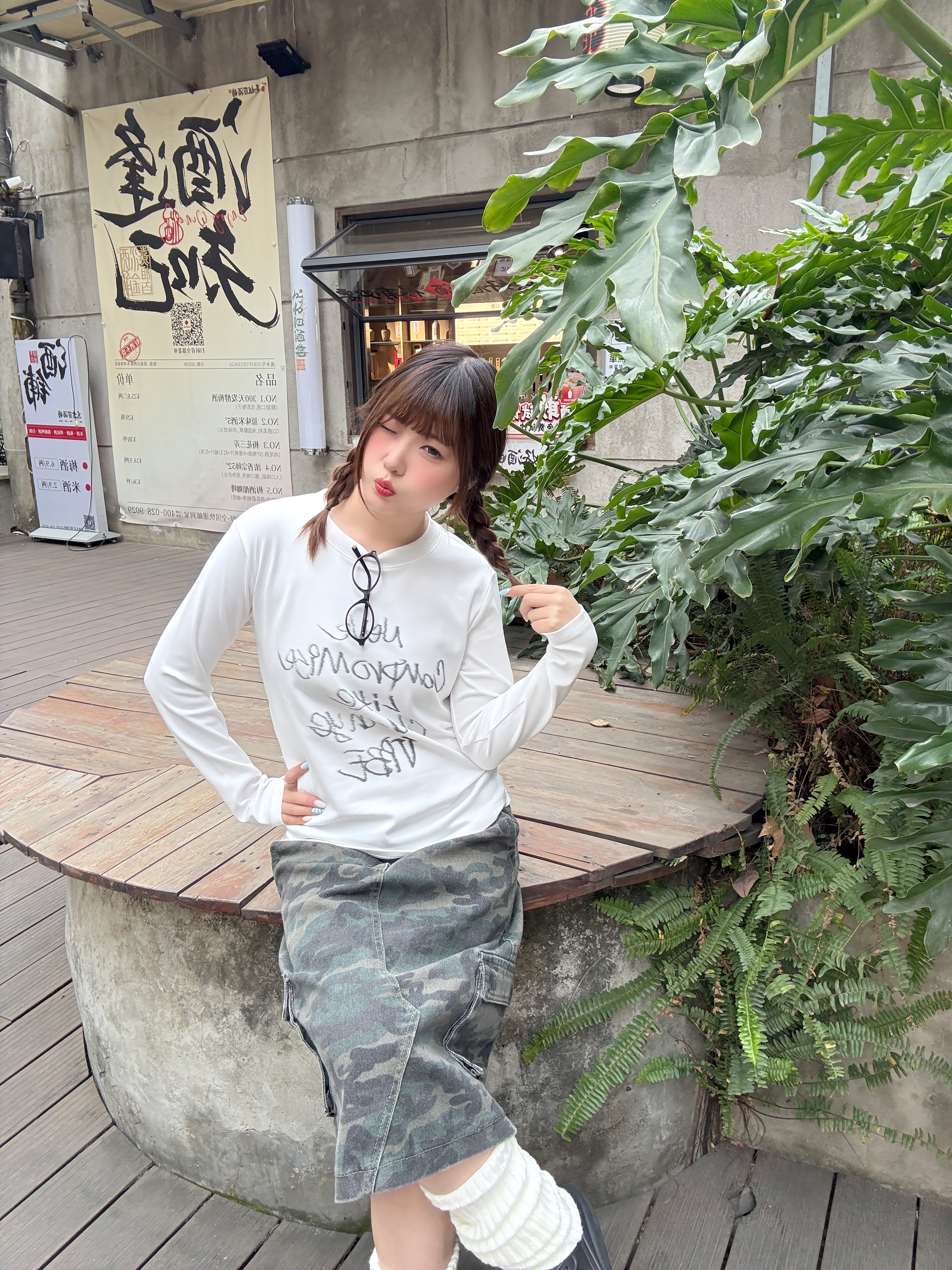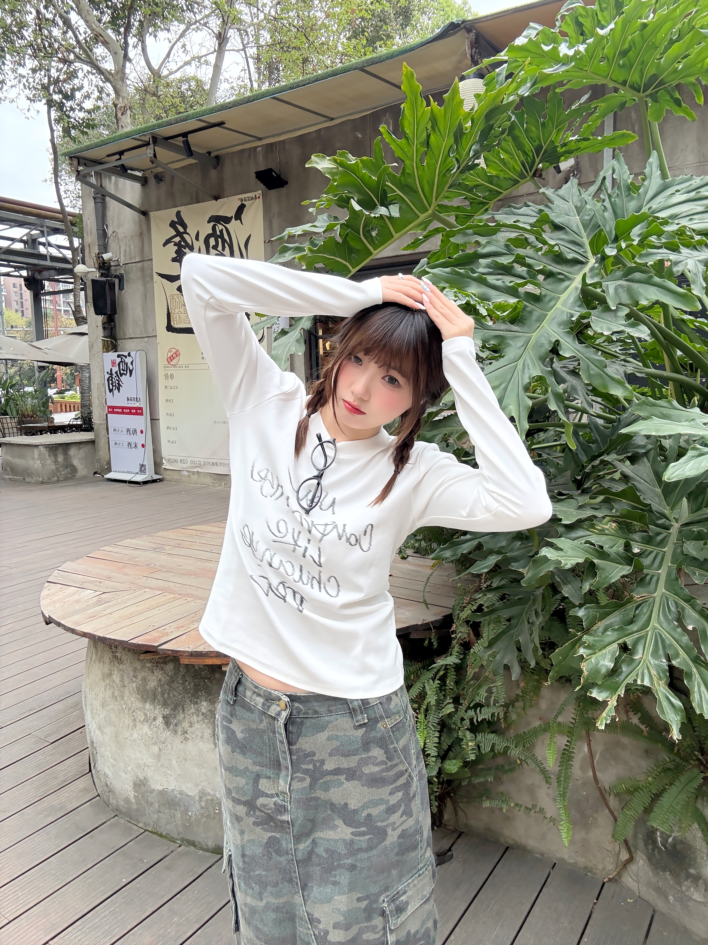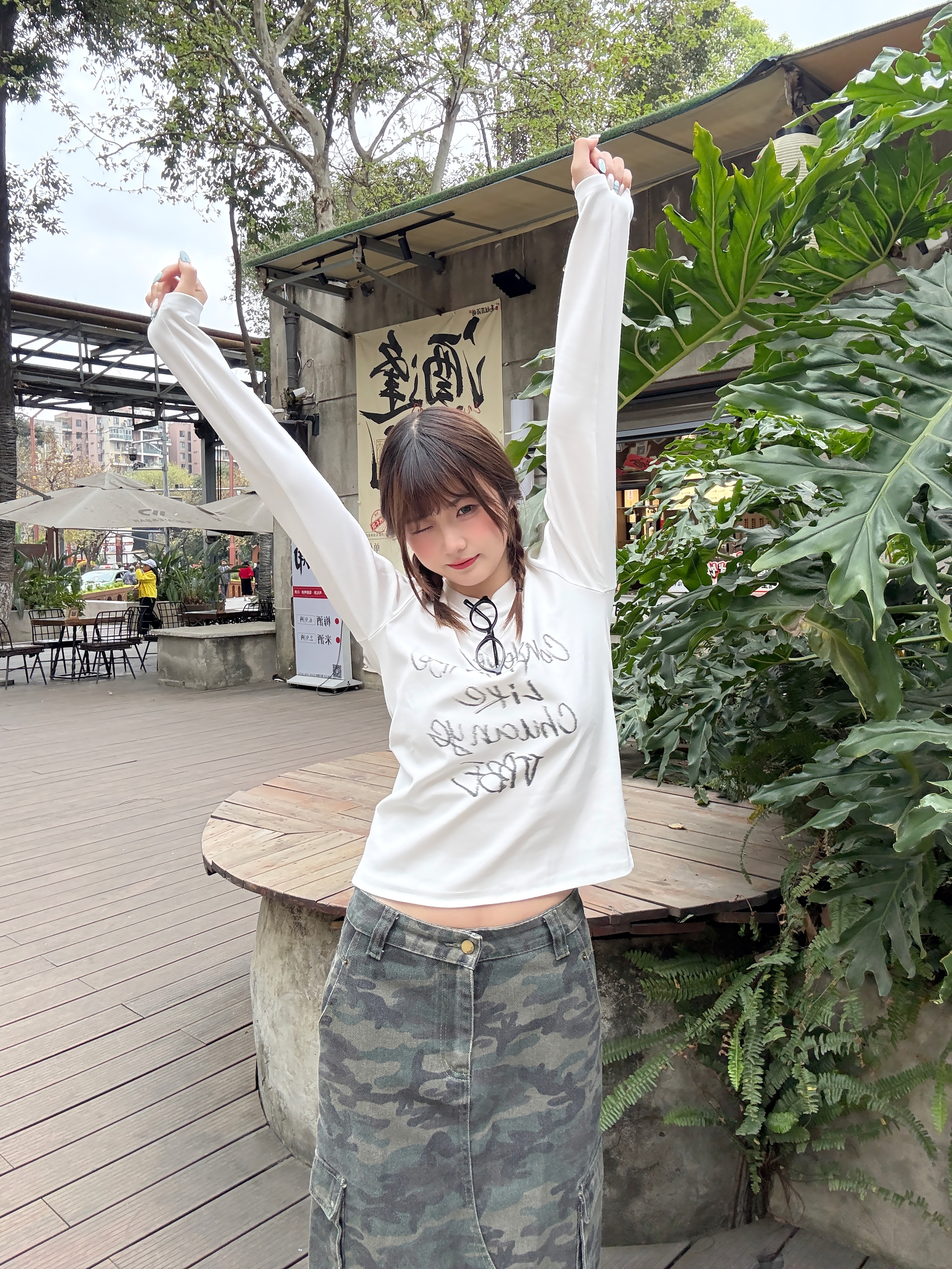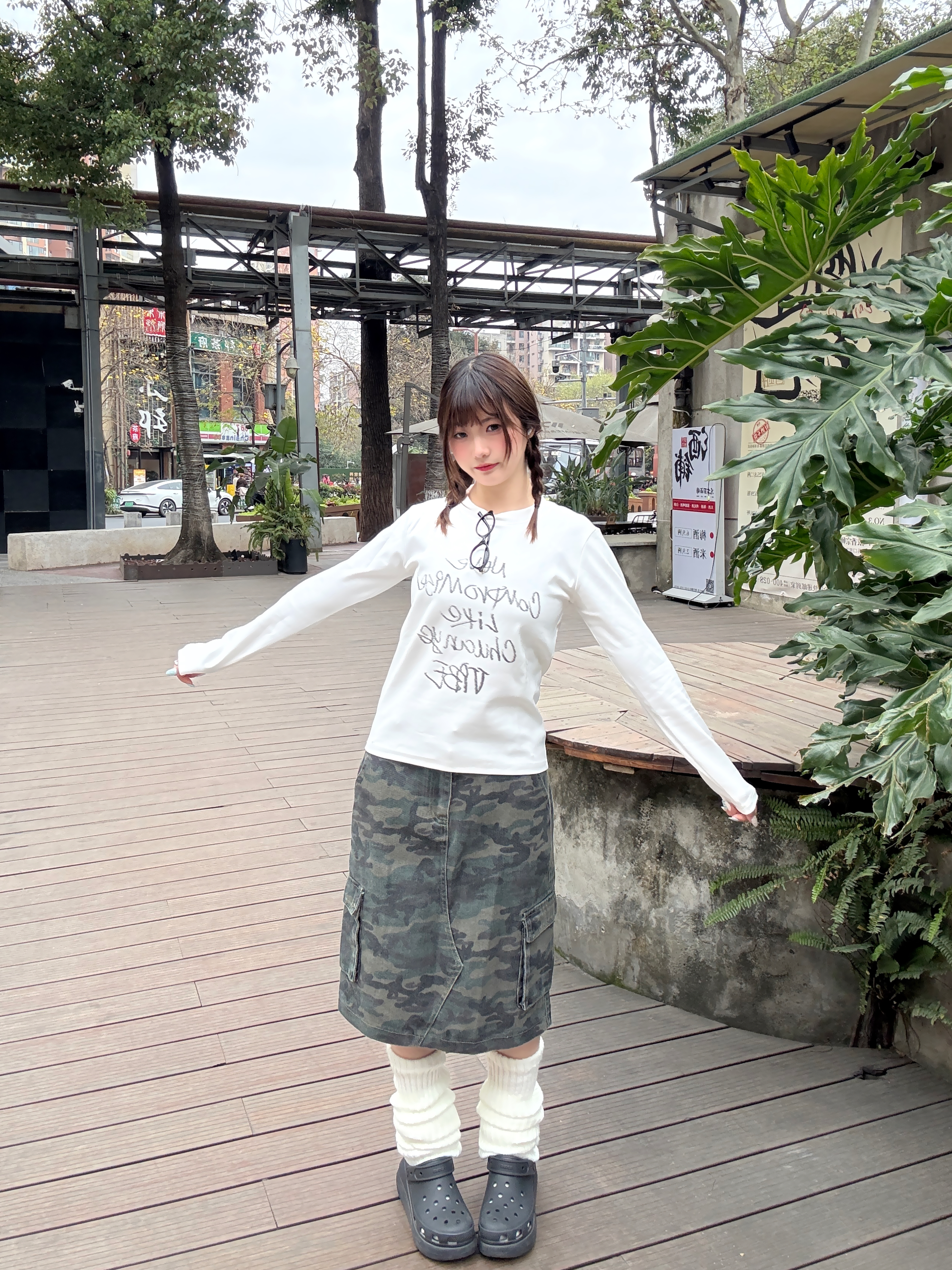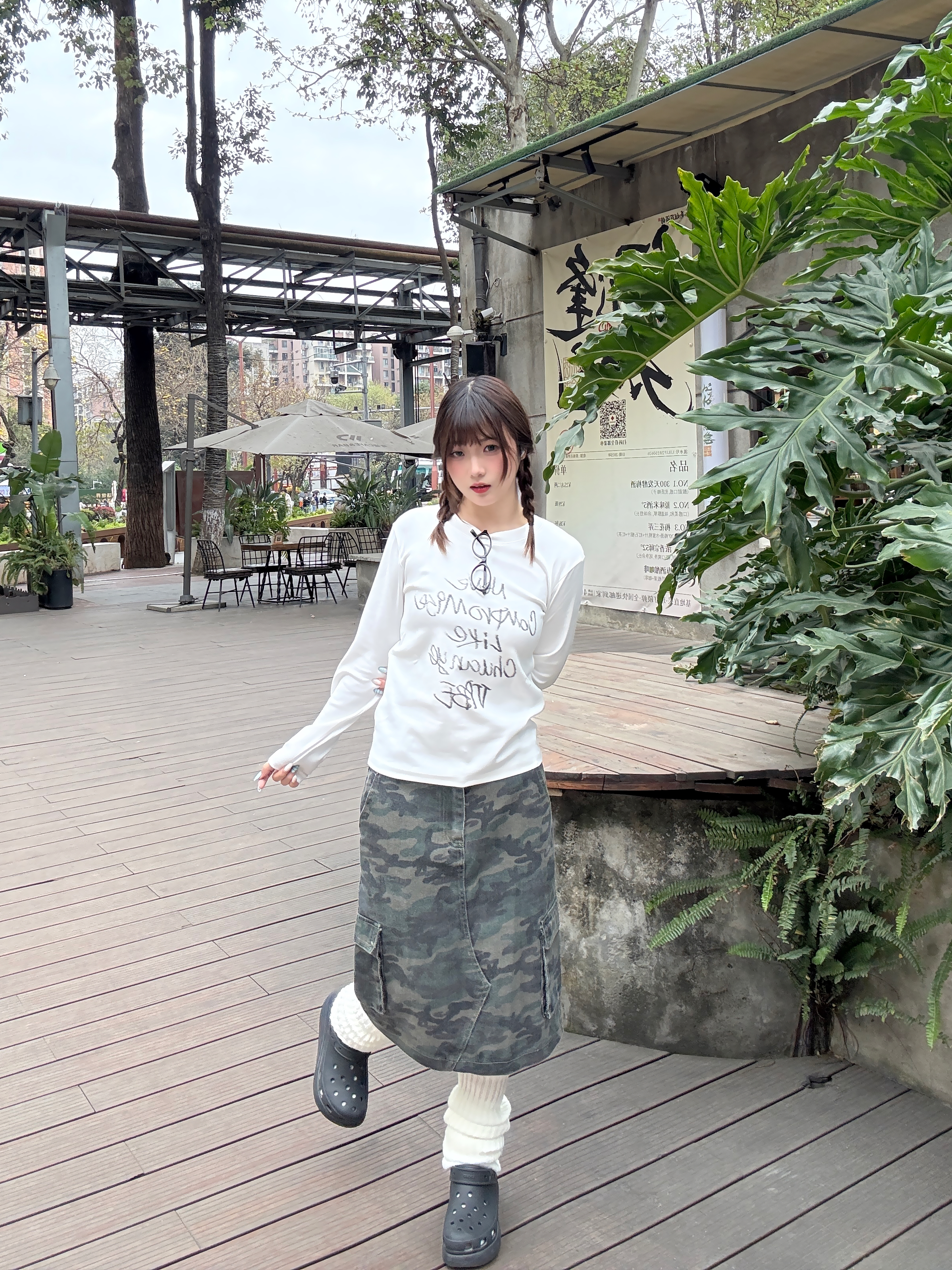 春天不费力的甜酷公式✨ 正肩白T长袖+迷彩工装半裙,搭配堆堆袜和洞洞鞋,把慵懒和个性焊在身上