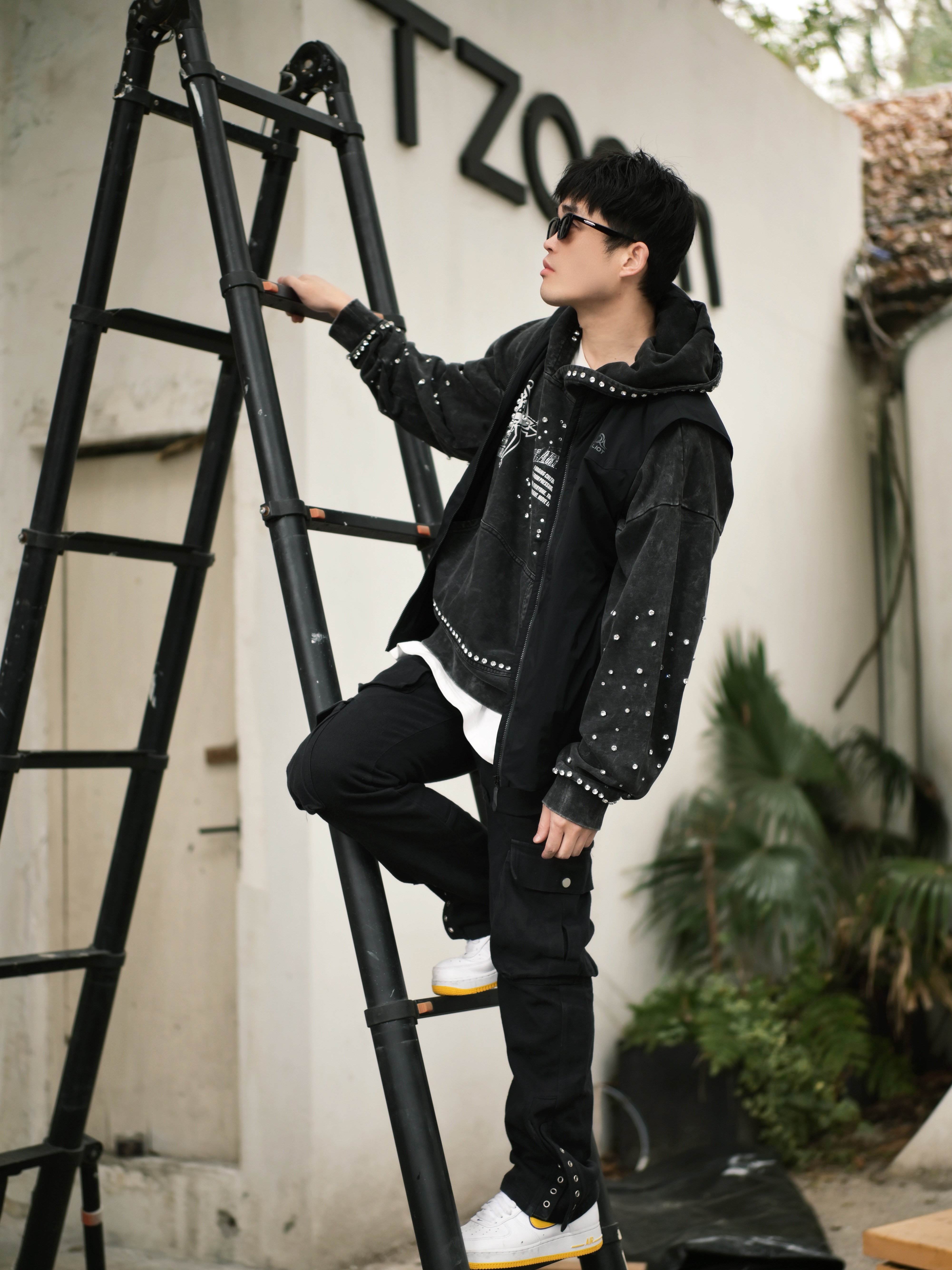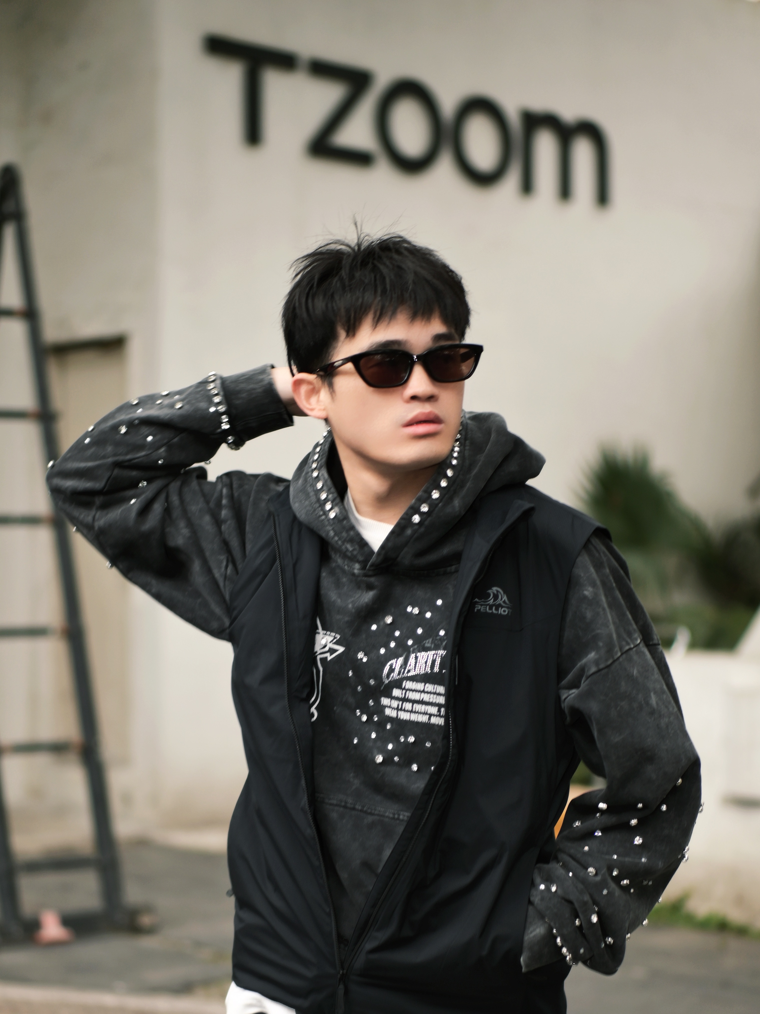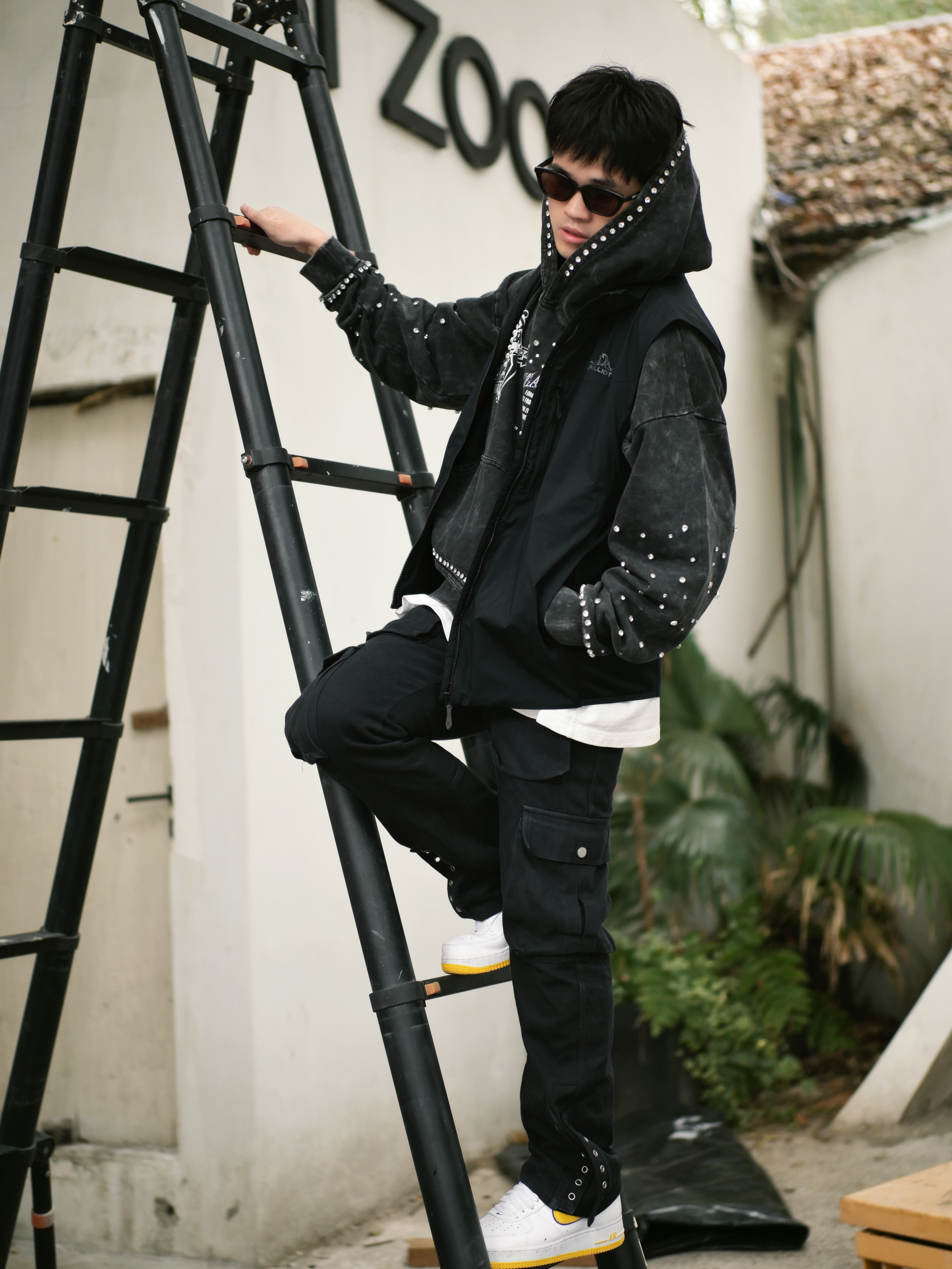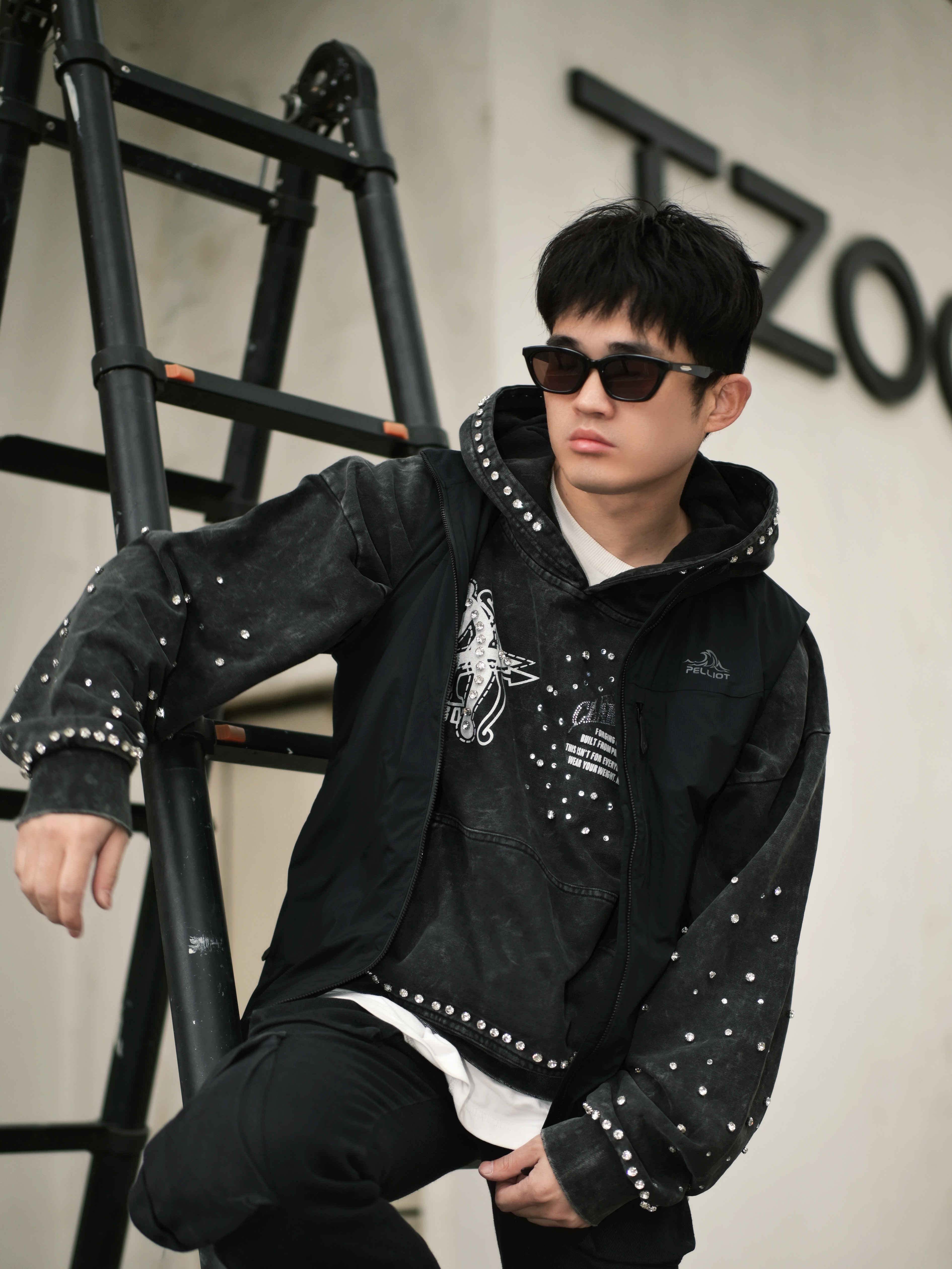 黑色是基础,但质感是关键。选择一件带有银色铆钉、做旧处理或拼接设计的卫衣。铆钉的冷感金属光泽能让黑色瞬间跳出层次,做旧工艺则增加街头的不羁氛围,避免穿搭显得太“新”和刻意。