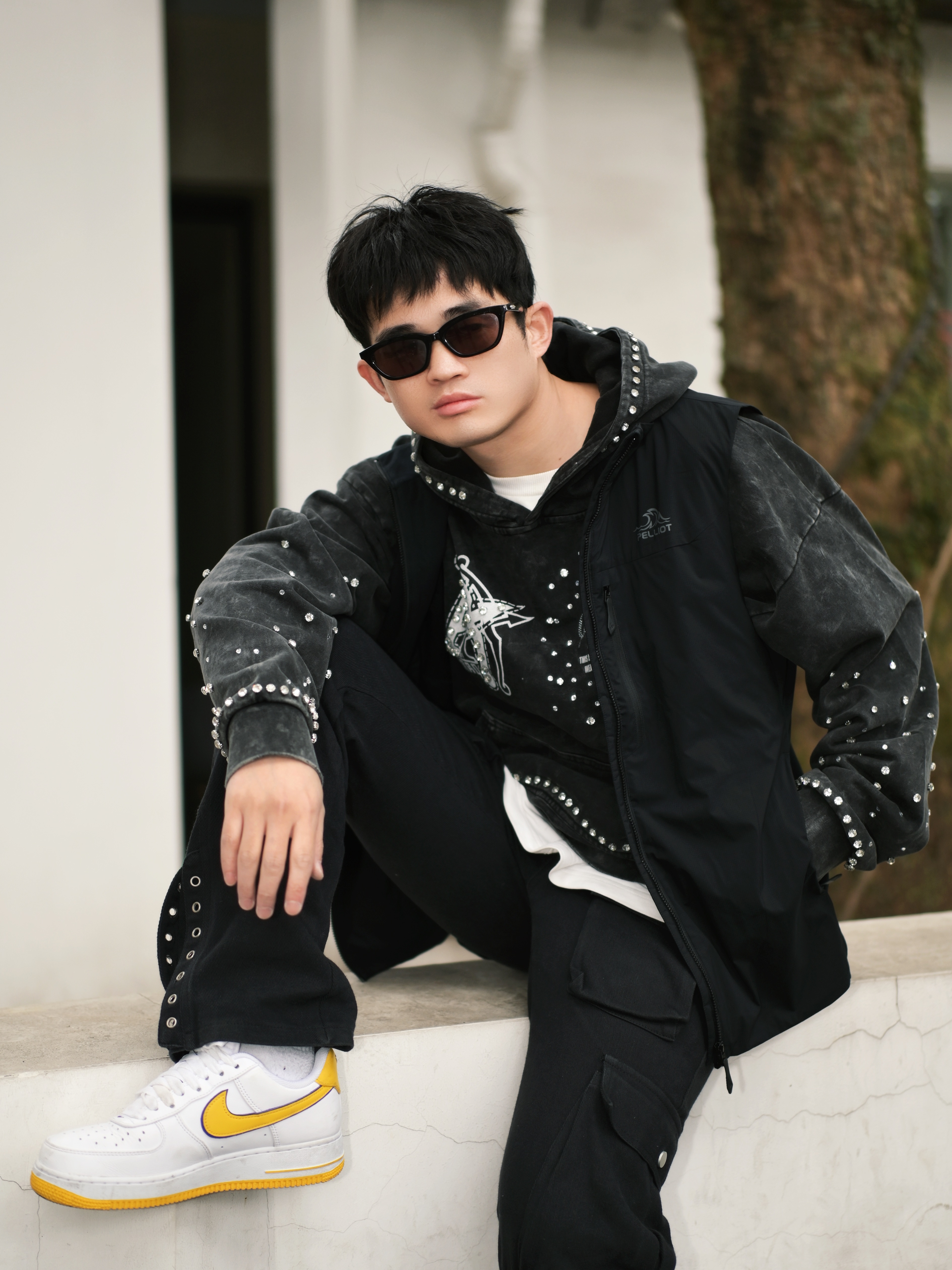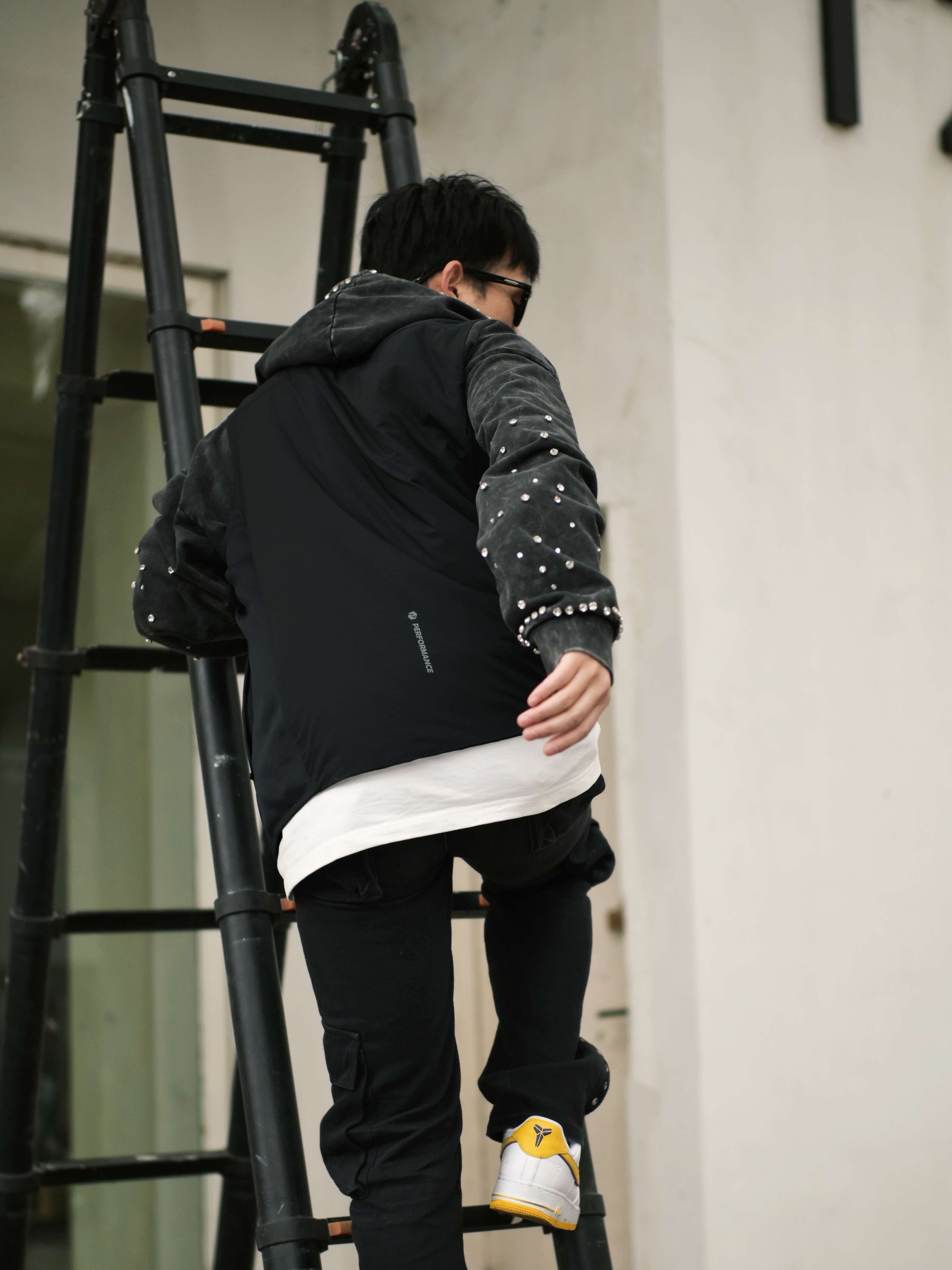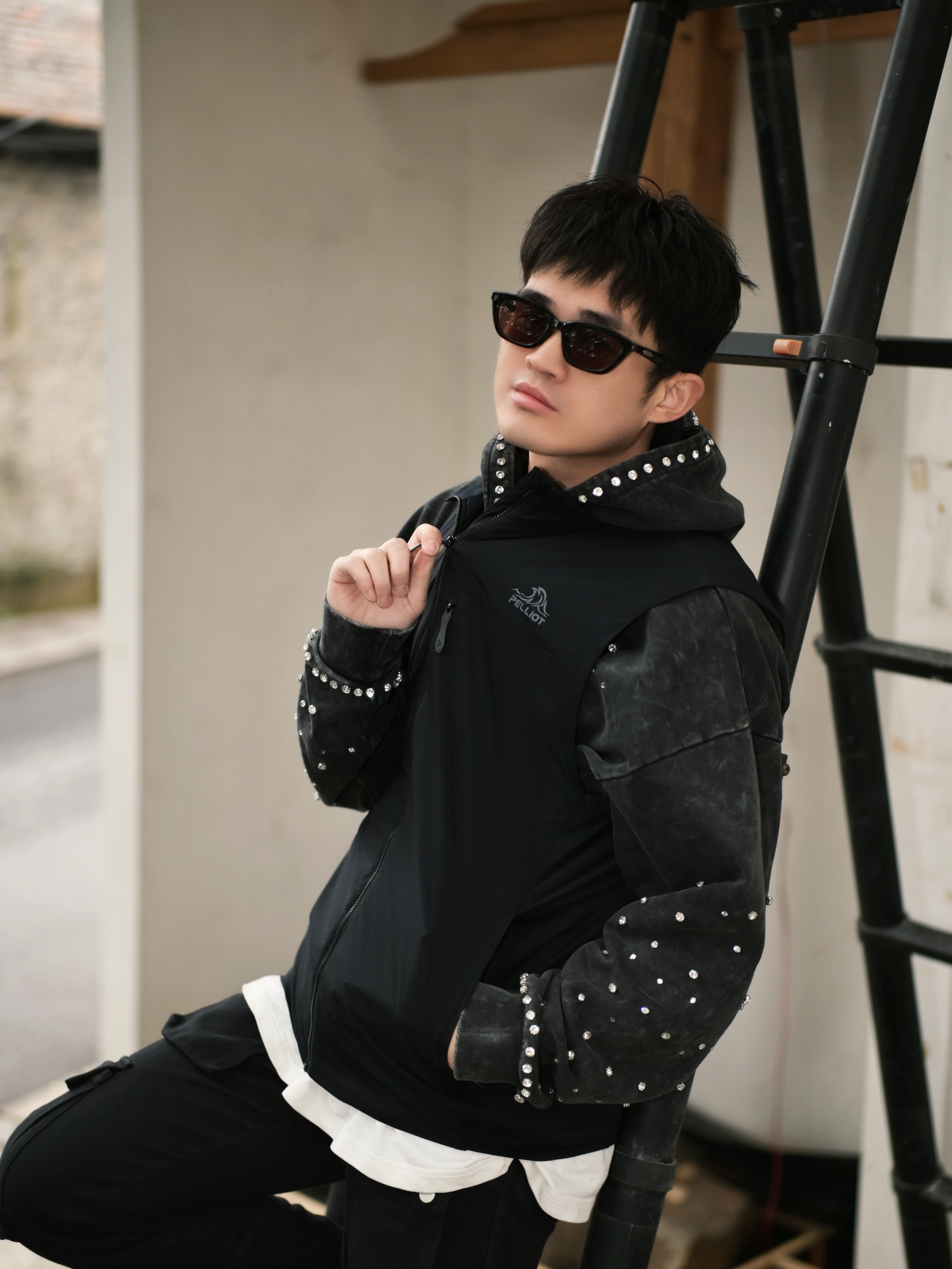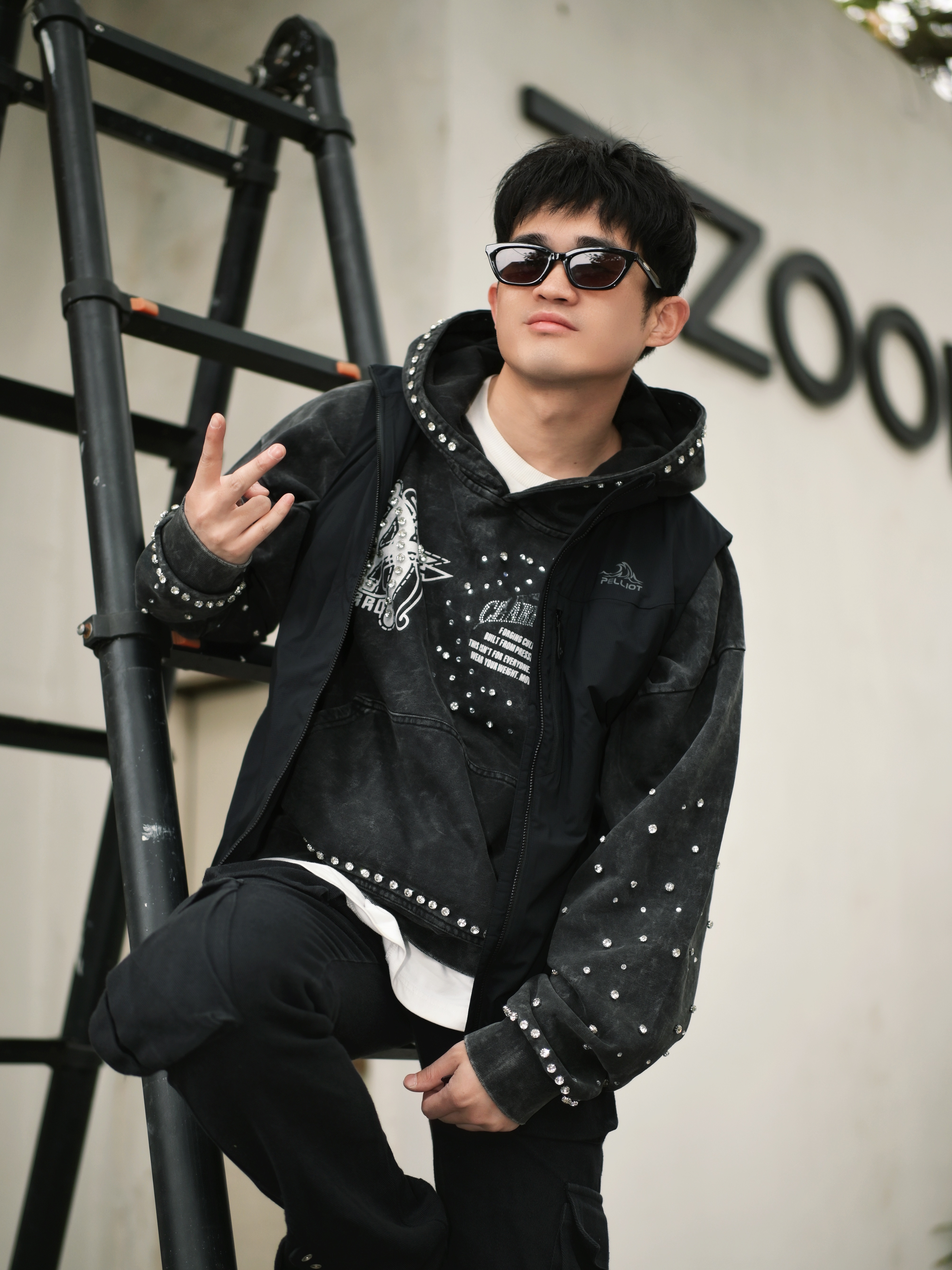 黑色是基础,但质感是关键。选择一件带有银色铆钉、做旧处理或拼接设计的卫衣。铆钉的冷感金属光泽能让黑色瞬间跳出层次,做旧工艺则增加街头的不羁氛围,避免穿搭显得太“新”和刻意。