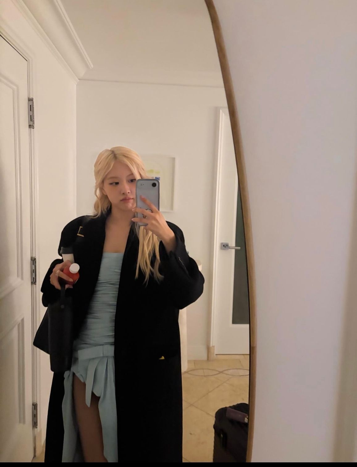 救命!Rosé这套对镜自拍真的把早春大衣公式刻在DNA里了🖤 黑色长款大衣配雾霾蓝抹胸裙,外长内短一穿,直接把"韩系清冷感"拉满!就是说这种外松内紧真的很显身材又很高级啊啊啊 ▪️单品拆解: 大衣:黑色长款翻领大衣(oversized版型,衣长过膝,西装式翻领,左胸金色小胸针点缀) 抹胸裙:雾霾蓝/浅蓝色抹胸褶皱连衣裙(紧身包身,腰部褶皱设计遮小肚子,裙摆不规则开衩,长度大腿中部) 饮品:红色瓶装...