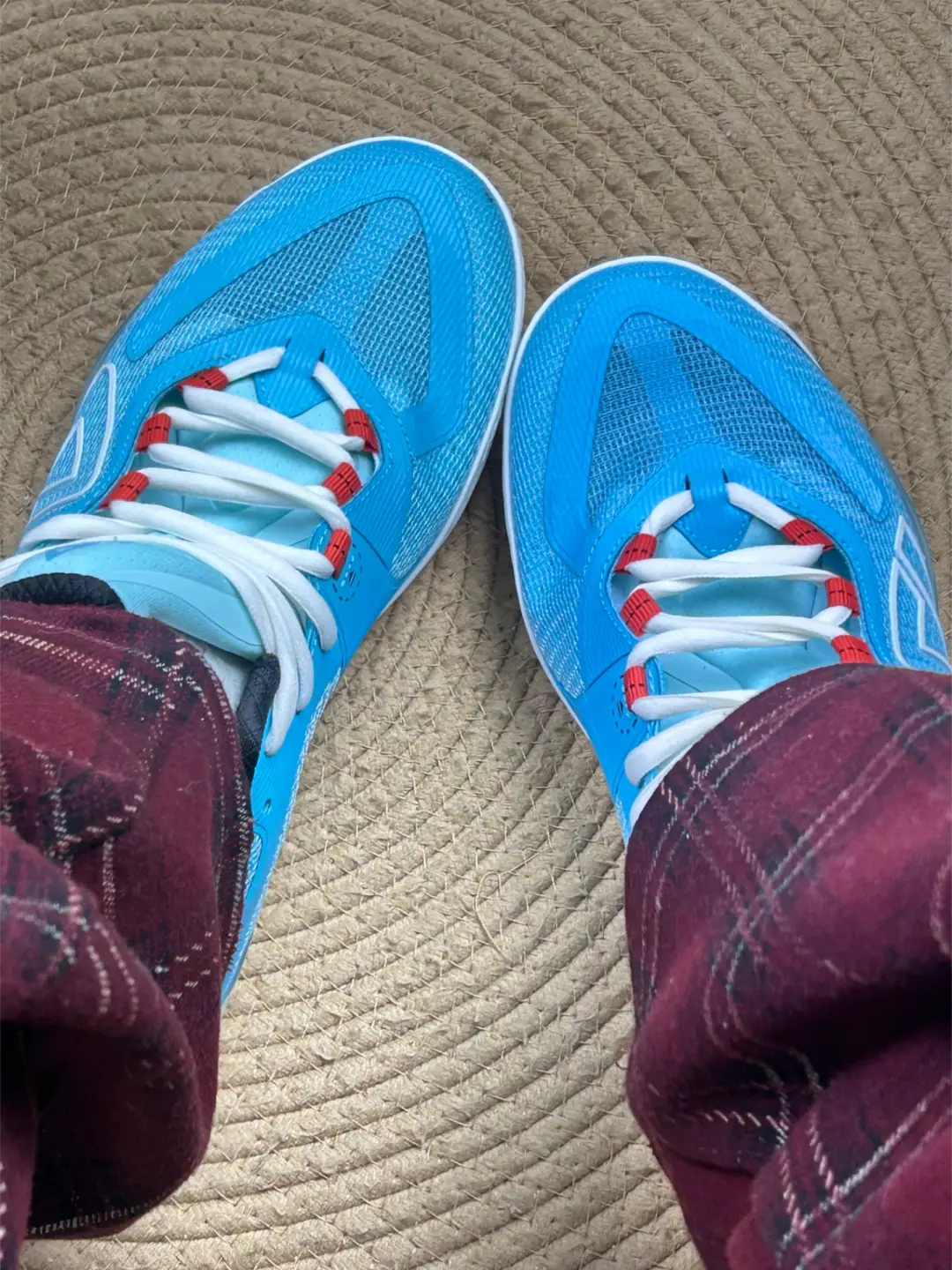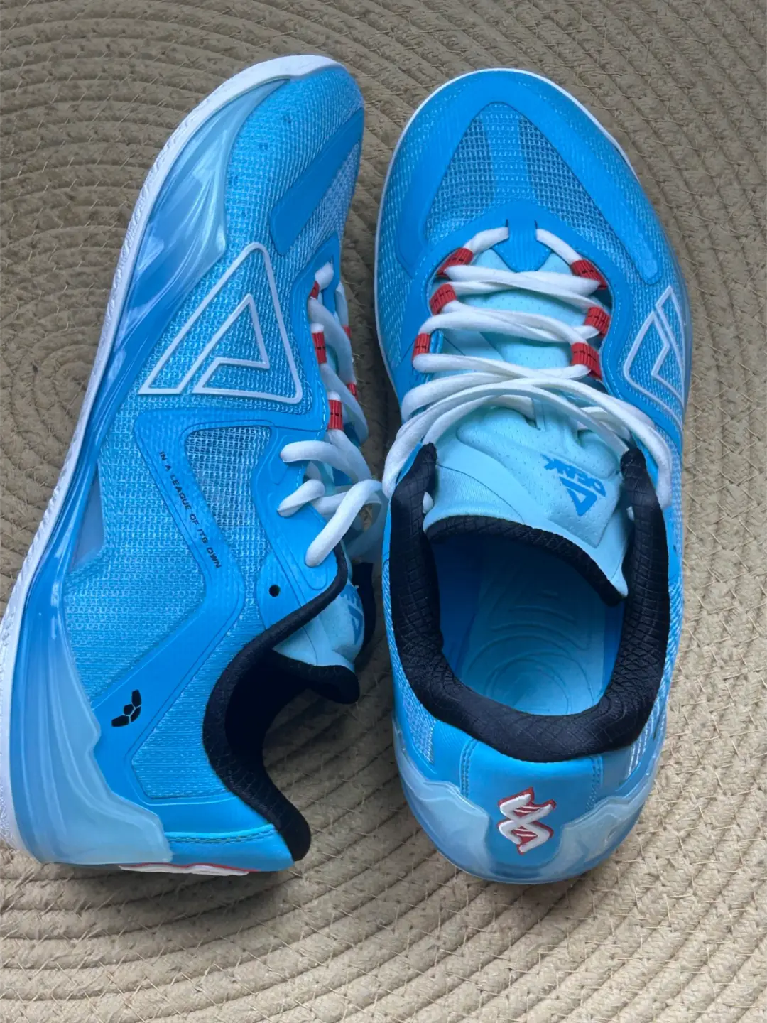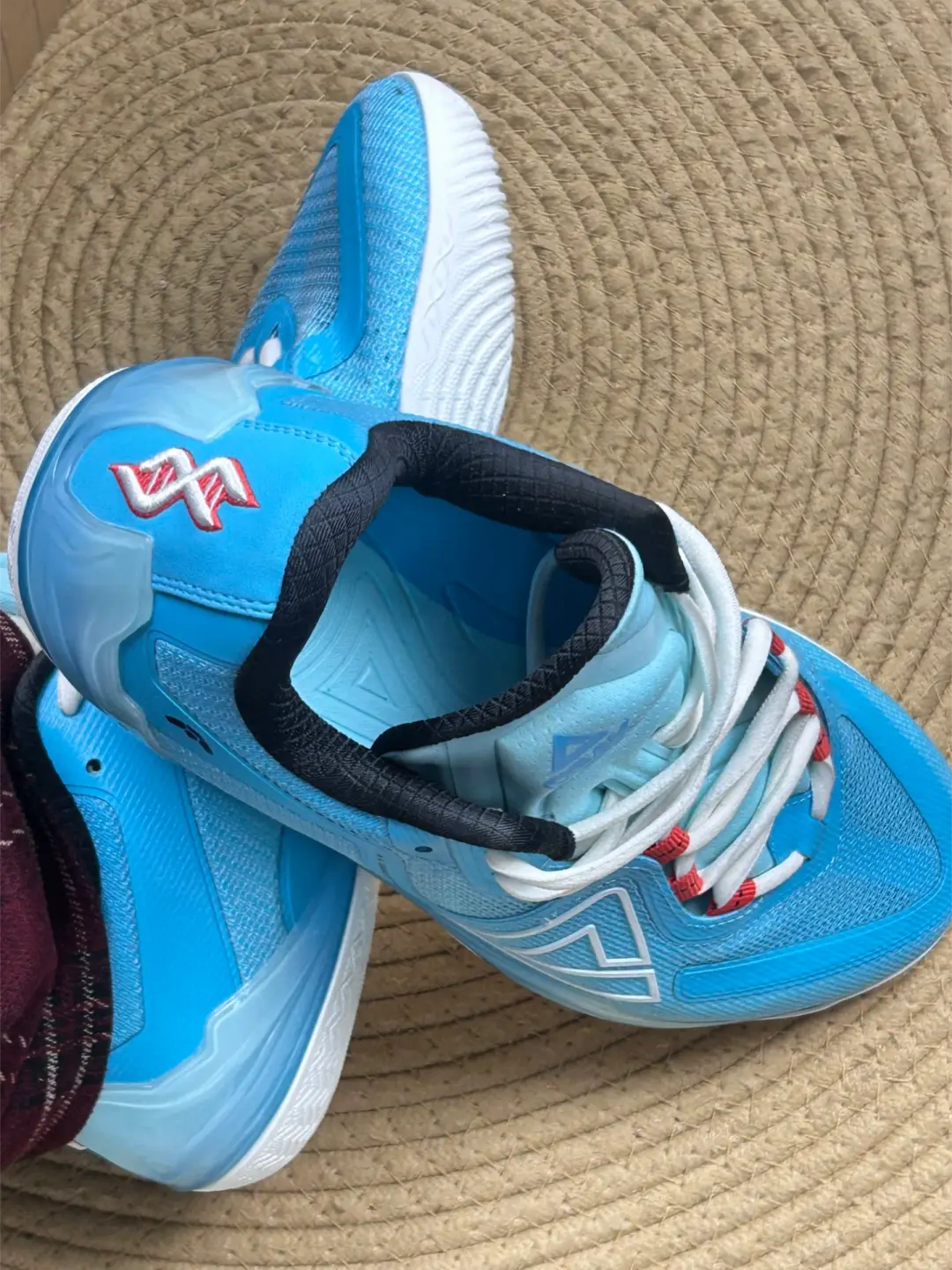 这双匹克无双的冰蓝配色,真的太清爽了,上脚像踩了块凉感果冻。 网面透气不闷脚,打一下午球也没觉得捂汗。缓震反馈够直接,变向起跳都很稳。 就是鞋型对宽脚不算太友好,瘦脚穿更贴合。日常搭运动裤也很吸睛,球场回头率稳了。