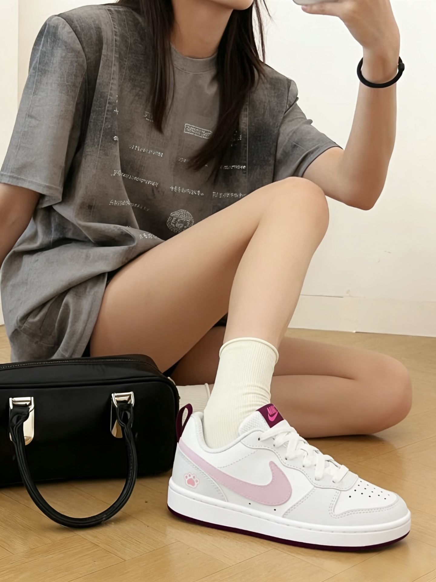 想要甜酷感的姐妹看过来!这双Nike粉勾板鞋真的太百搭了~ 白鞋身+淡粉勾+紫细节,甜妹和酷妹都能驾驭,搭配卫衣是元气少女,搭配牛仔裙是街头酷姐! 鞋底软弹不闷脚,增高效果超自然,通勤、上课、约会都能穿,颜值和舒适度双在线!