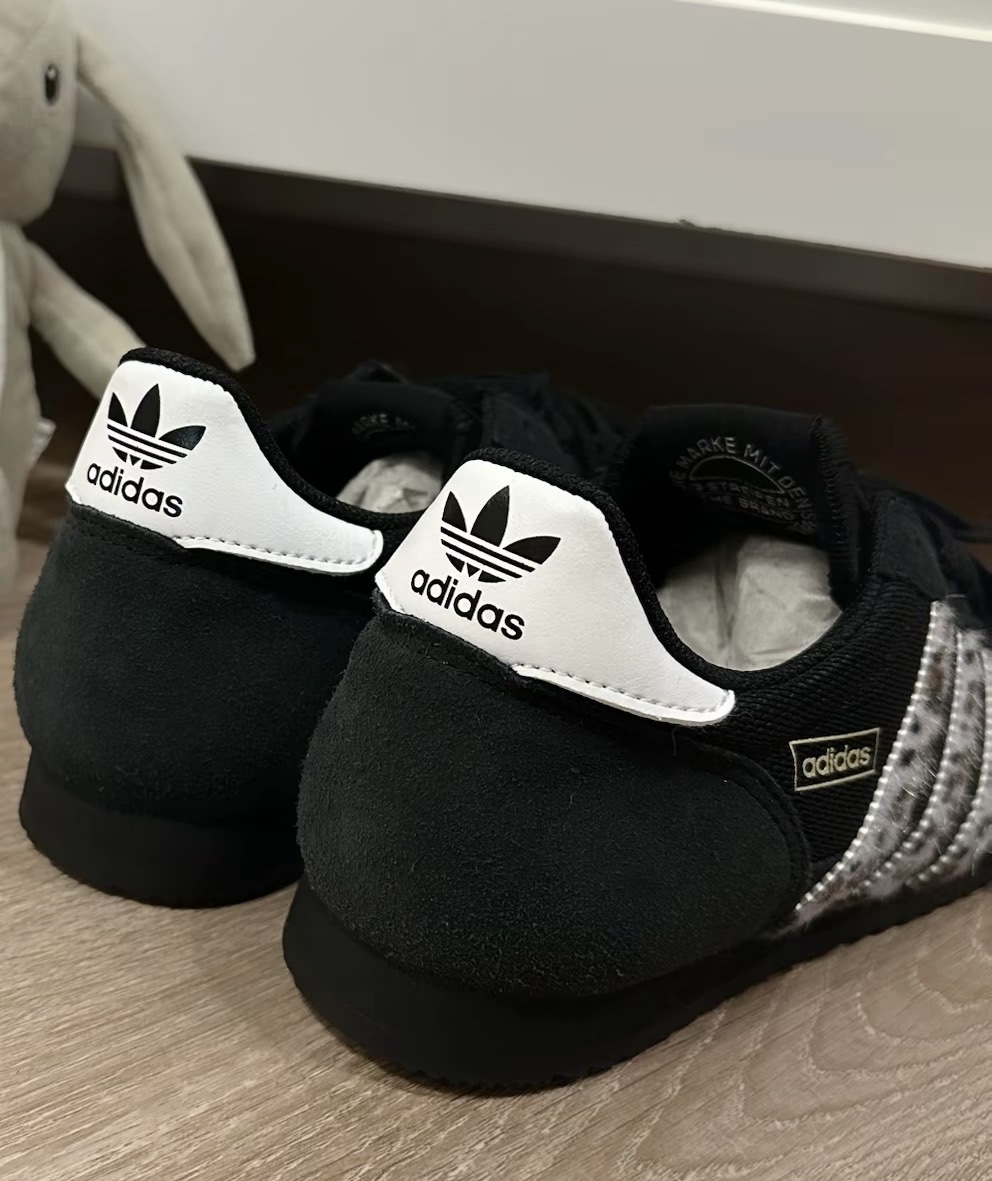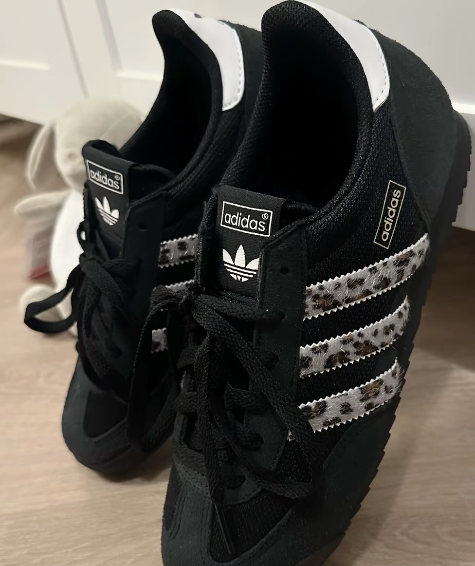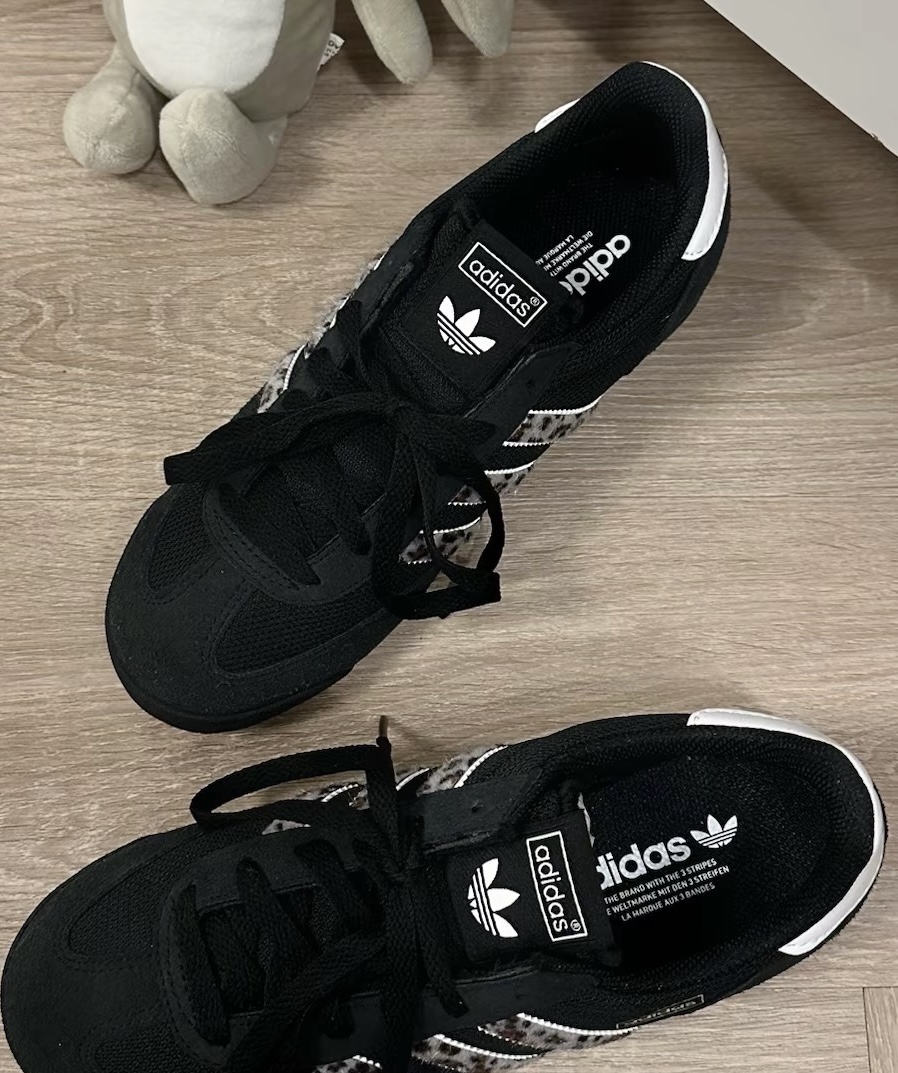 终于挖到这双宝藏复古鞋了! 全黑的鞋面超级百搭,不挑人不挑穿搭。 最绝的就是这对豹纹三条杠,在黑色的衬托下既甜又辣,很有辨识度。 搭配牛仔裤或百褶裙都超有氛围感,直接拿捏复古辣妹风! 属于那种一眼沦陷的小众款,必须冲!✨ #识货种草 #三叶草 #复古球鞋 #豹纹元素 #辣妹穿搭
