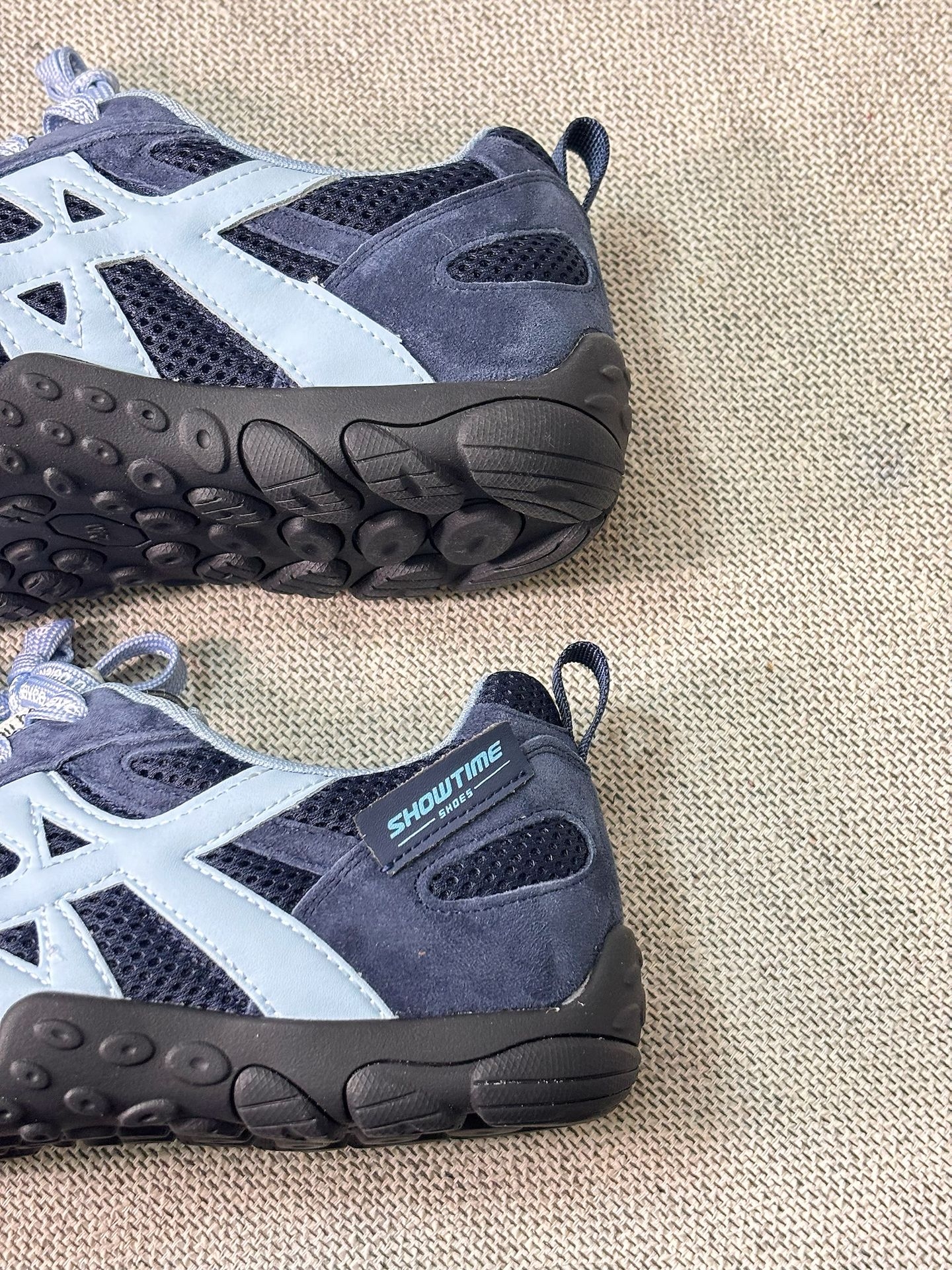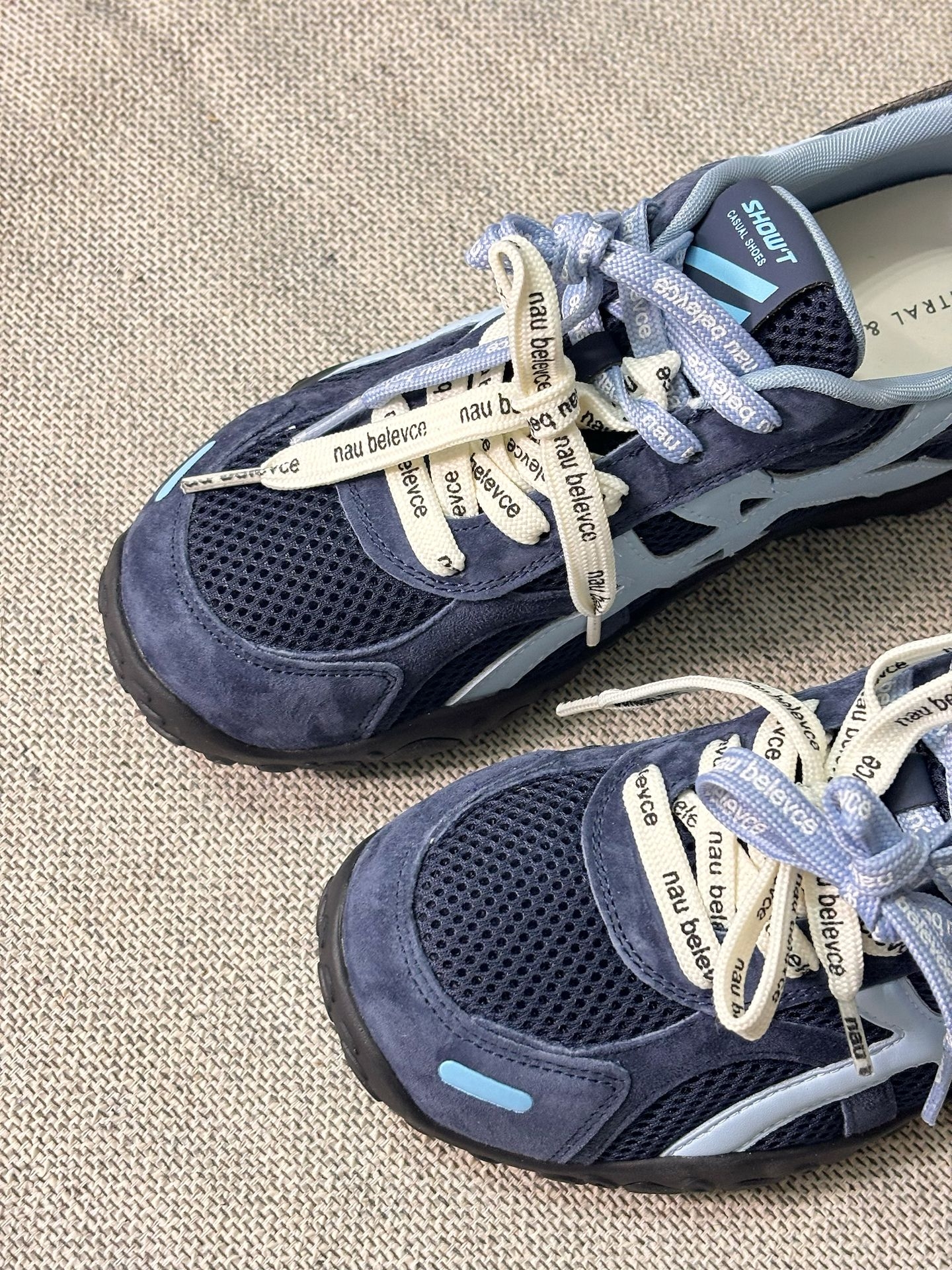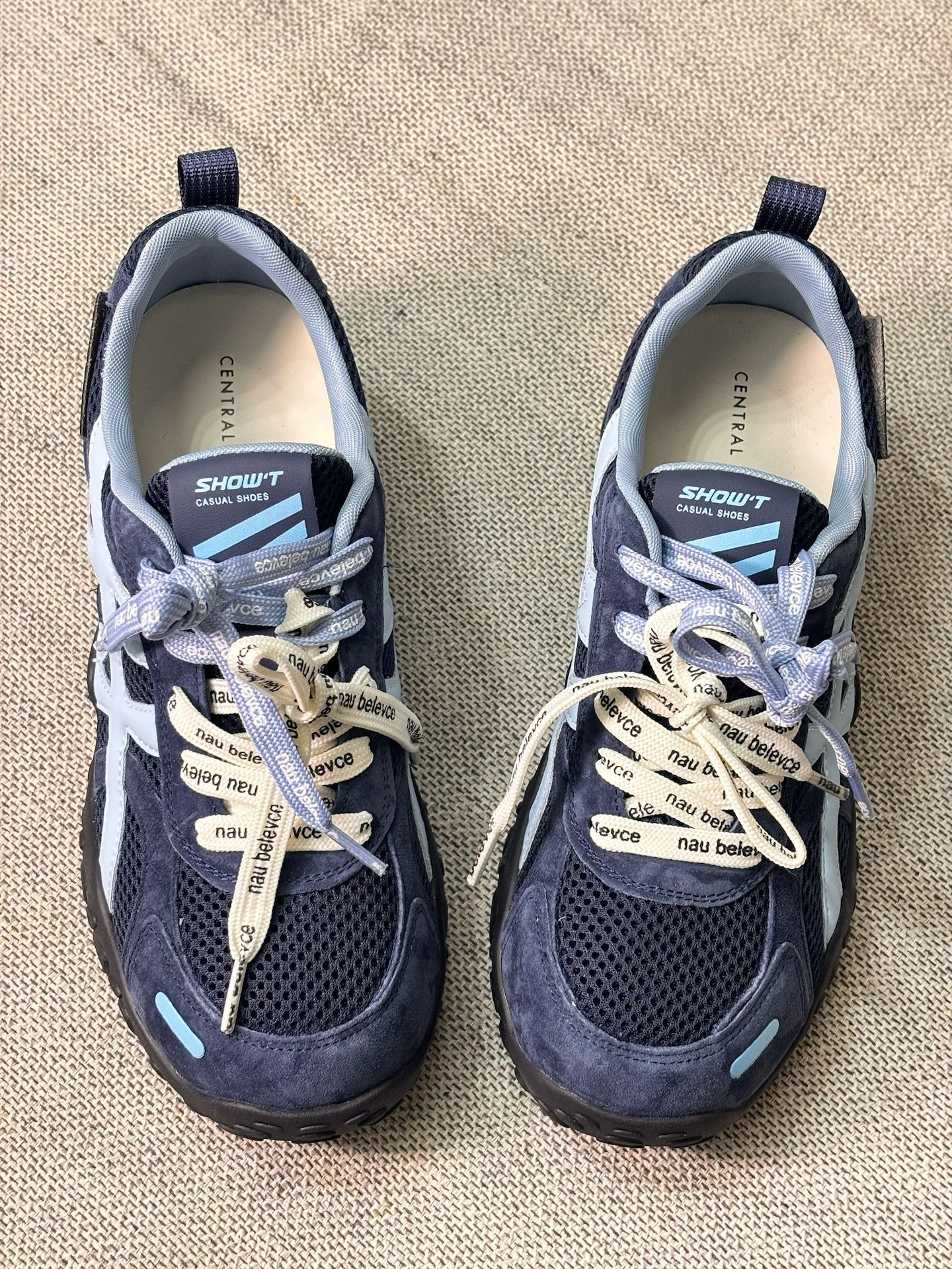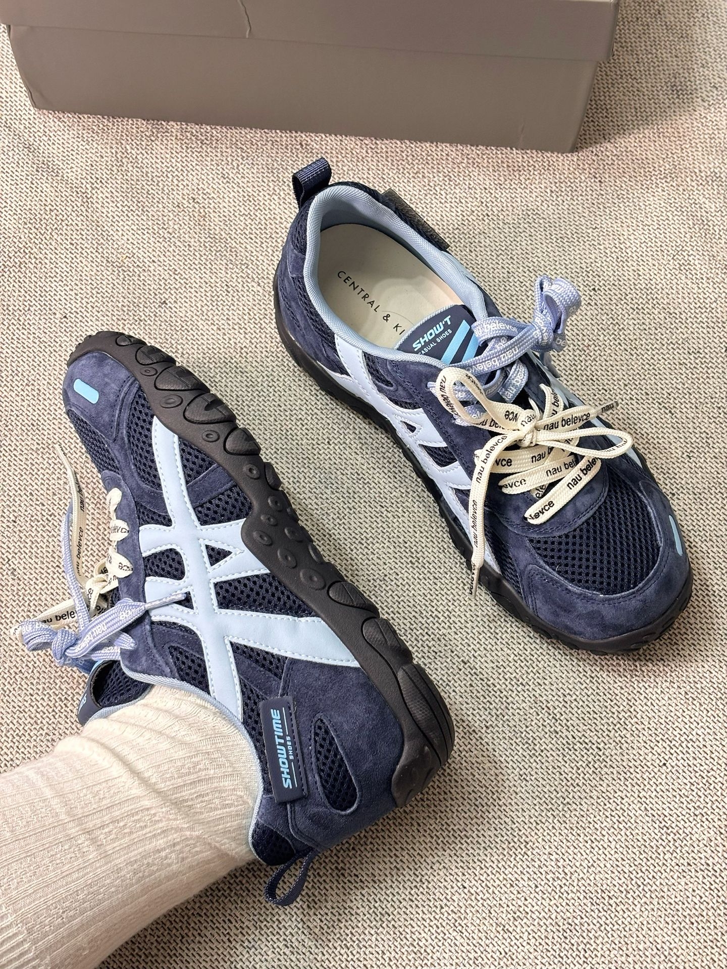 年度黑马机能风运动鞋|户外党直接闭眼入✅ 颜值与实力并存的一双宝藏鞋!复古山系登山鞋版型,小众设计拒绝烂大街。 撞色鞋带+交叉纹路设计,细节感满满,蓝黑配色酷飒又显脚小。 防滑耐磨厚底,支撑性超棒,日常出行、爬山遛弯都稳稳的。 网眼透气面料清爽不闷脚,上脚轻盈无负担,学生党、打工人日常刚需,百搭所有穿搭风格!