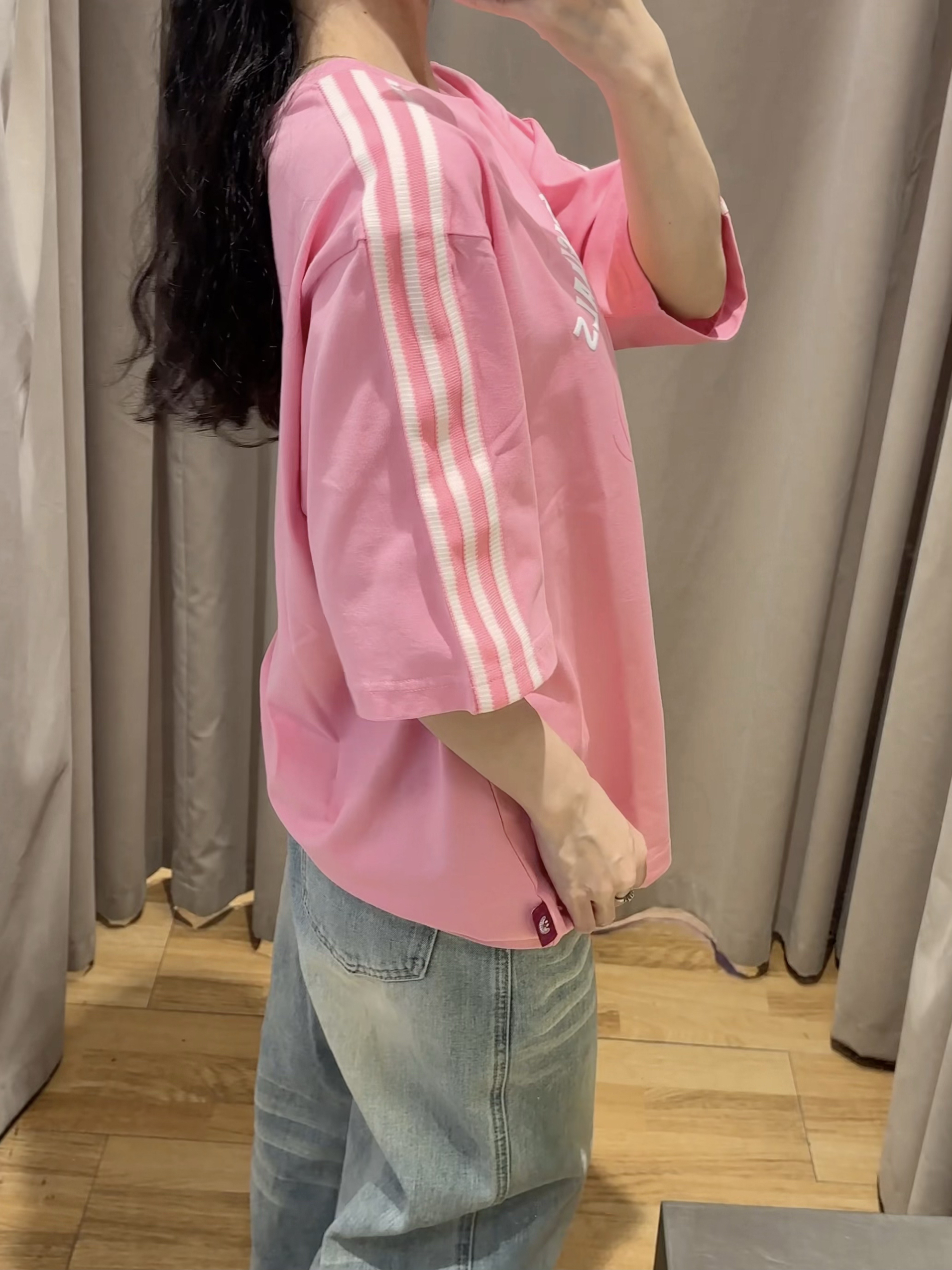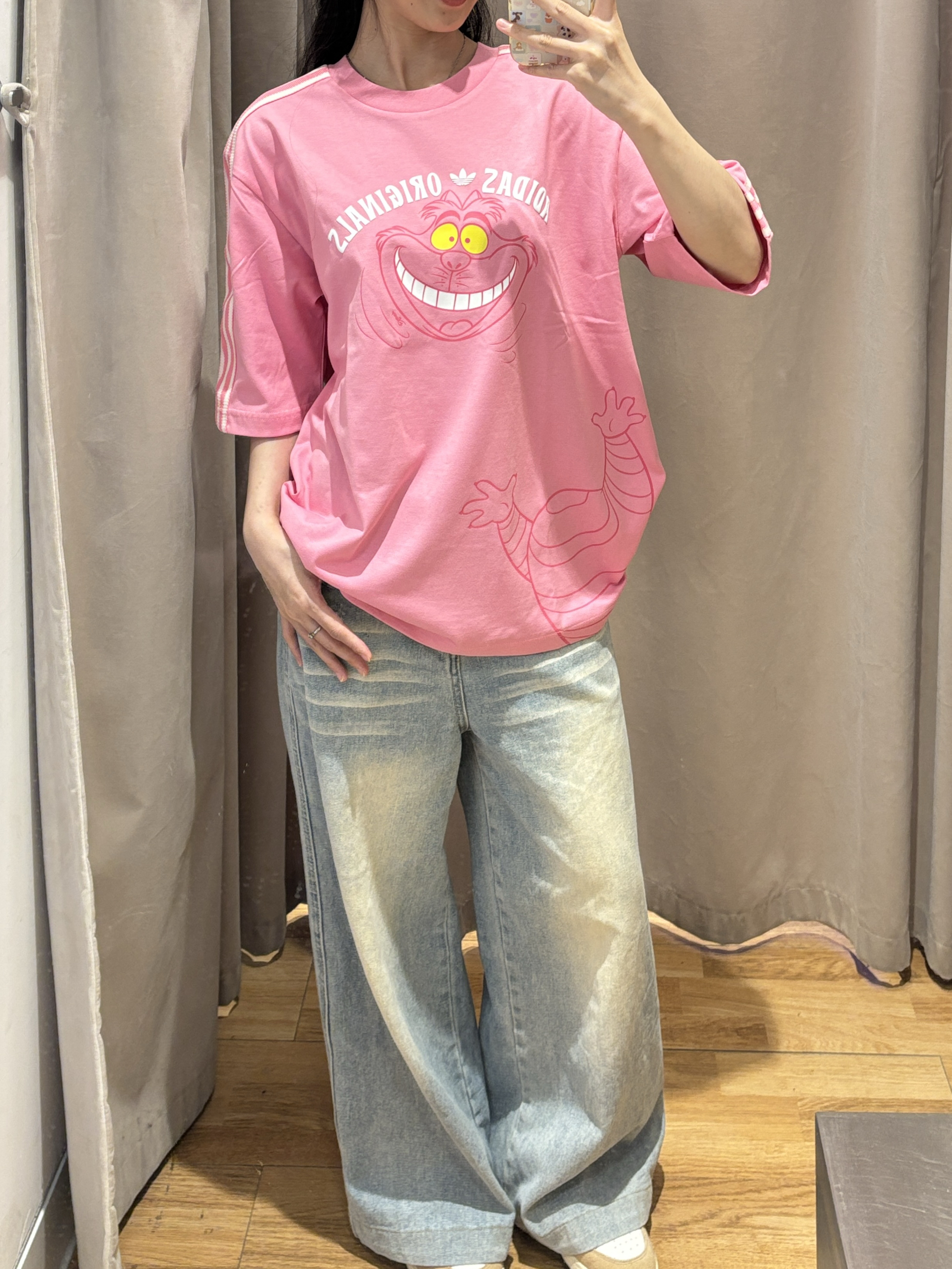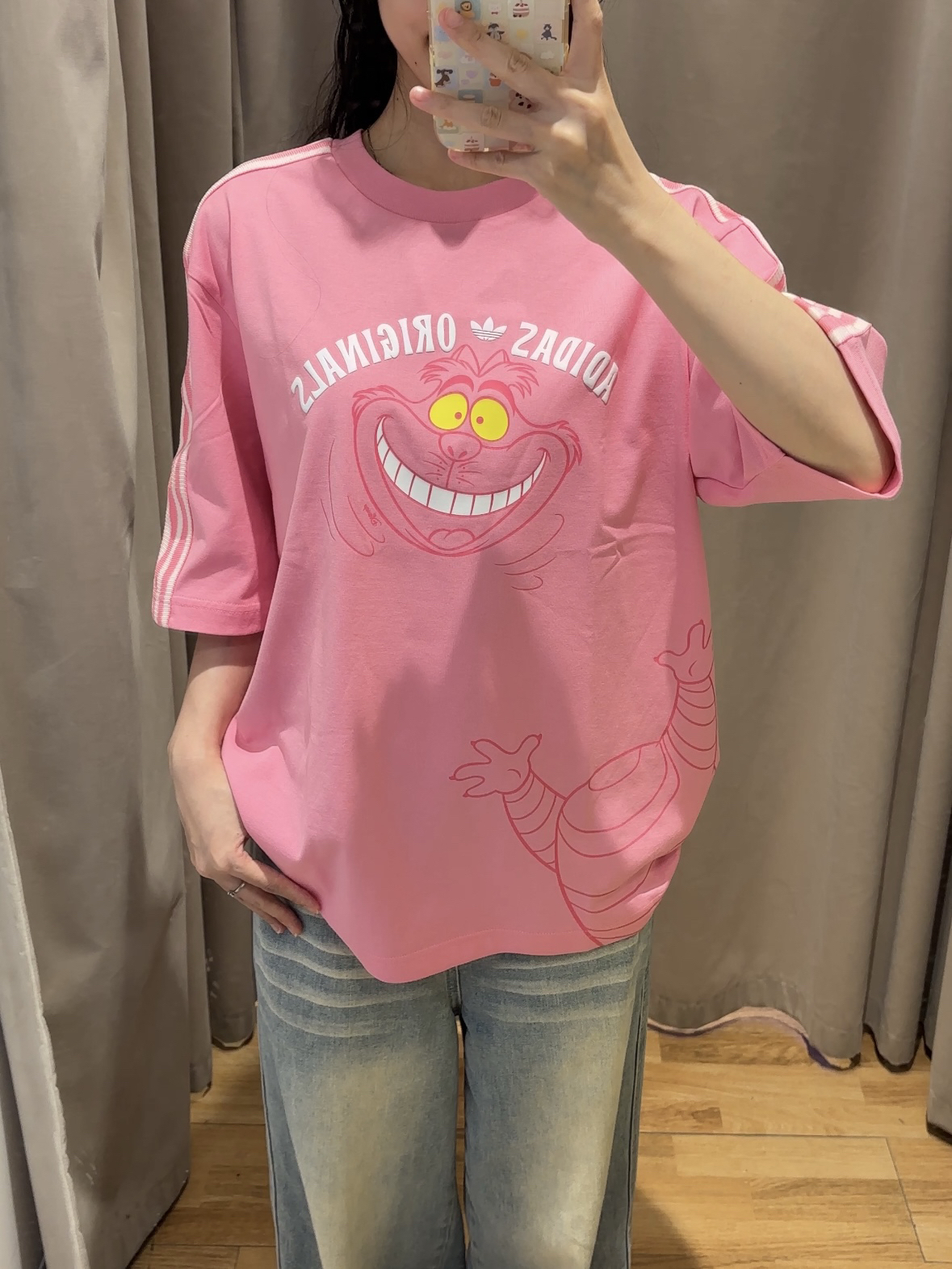 谁懂啊!这件adidas和迪士尼联名的柴郡猫T恤也太适合春夏了吧! oversize的版型对小个子超友好,宽松藏肉,搭配阔腿牛仔裤就是休闲又甜美的感觉, 粉粉的颜色超显白,印花也很有细节,夏天随便搭条裤子就能出门,懒人穿搭天花板!