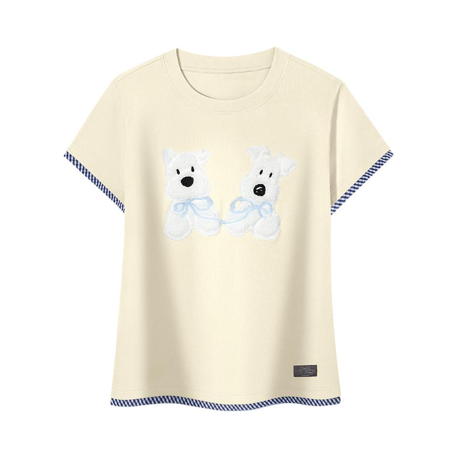 小狗T恤短袖尊滴好看! 奶fufu的奶黄底色+可爱狗狗印花都好治愈 显身材品瘦的紧身版型! 下装随便搭波点休闲裤都很减龄~ 瞬间解锁少女感,这件百搭T我能穿一整个夏天!