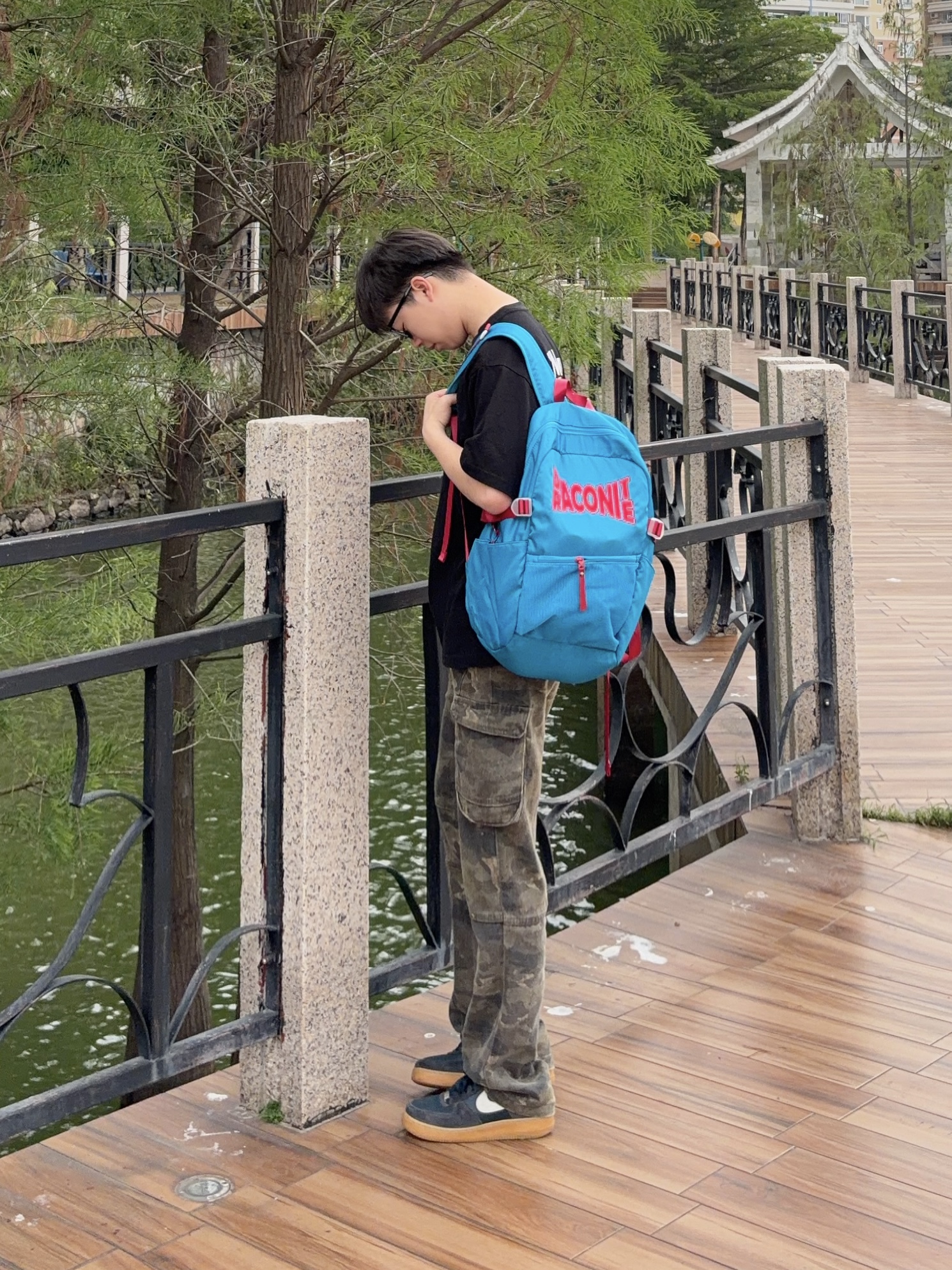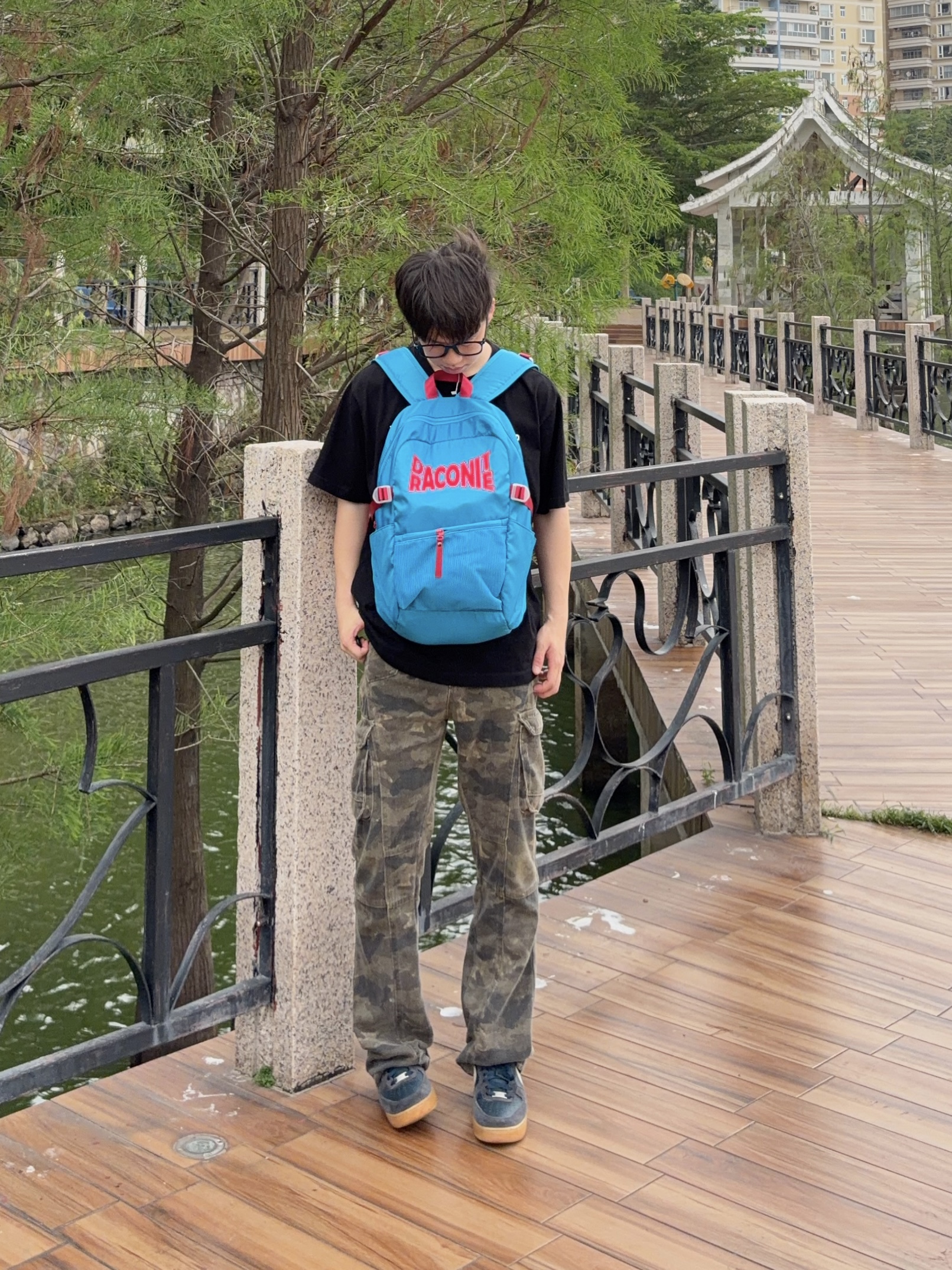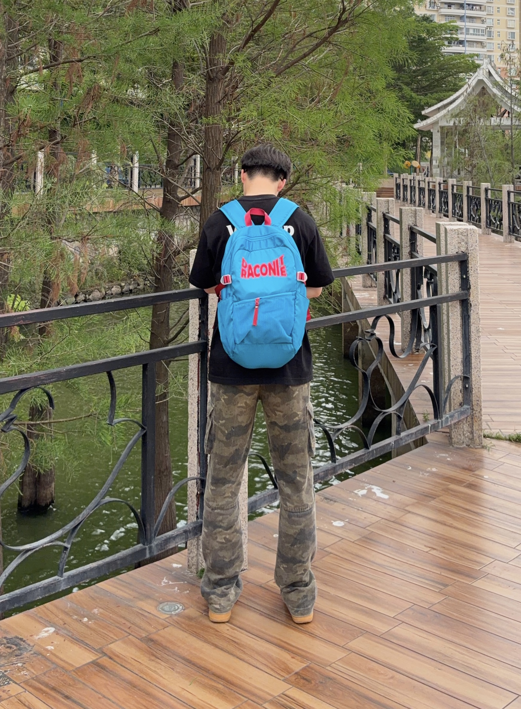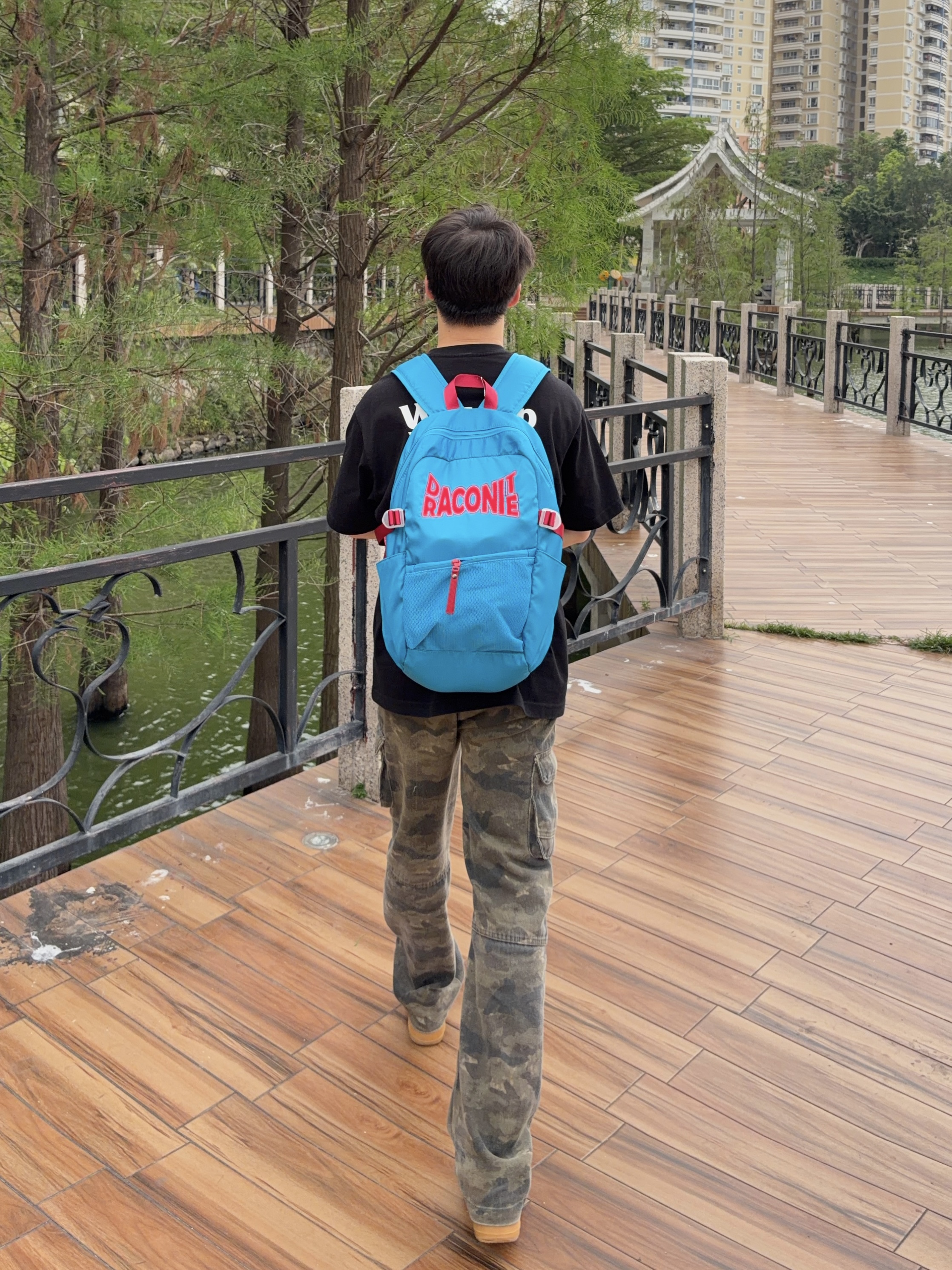 春日户外出行🚶 背上 DRACONITE 这款美式 复古双肩包太合适了🎒 湖蓝色主体拼红色刺绣字母街头感拉满🕶️ 涤纶面料轻便耐磨 质感十足🔥 大容量设计装下出行所需毫无压力🥰 搭配简单黑T👕和迷彩裤👖 日常通勤or校园使用都很适配🚶