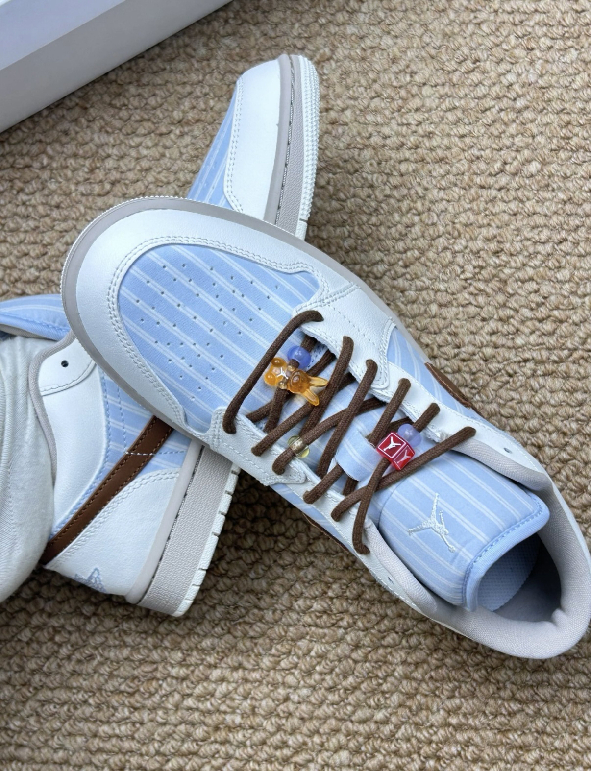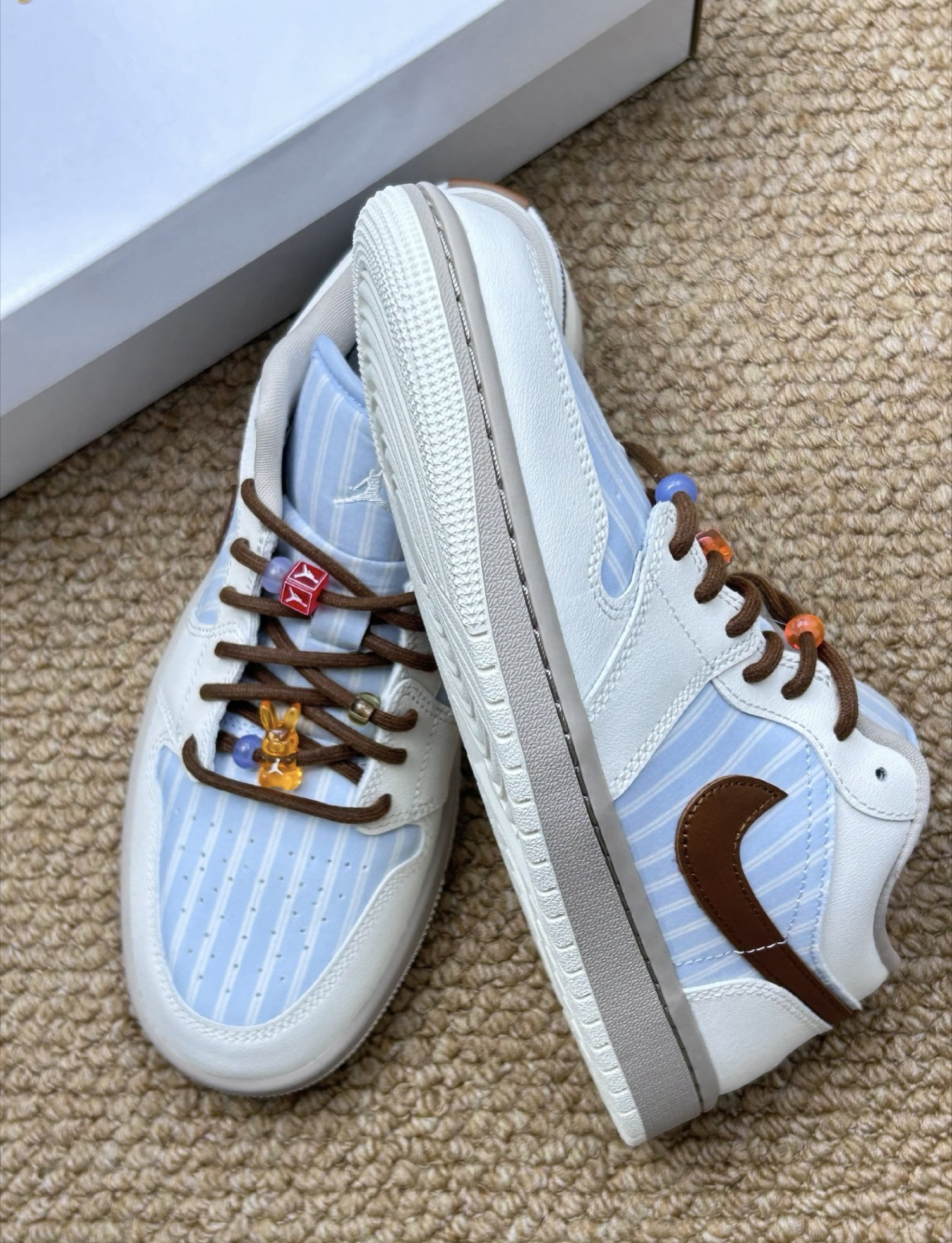 穿了快一周,来唠点实在的👟 选它完全是被浅蓝条纹+奶白的配色戳中,搭牛仔裤、浅色系裙装都不违和,鞋型比高帮款更贴脚,日常走路没那么压脚背。自己加了彩色串珠后,多了点不刻意的小心思,不容易撞款。 但也不是没槽点: 鞋头的条纹面料偏软,穿两次就有点皱,打理要费点心; 鞋底偏硬,长时间走路脚底板会有点酸;棕色鞋带容易脏,浅色鞋身也怕蹭到污渍,日常穿得小心点。 整体是颜值大于脚感的款,适合日常...