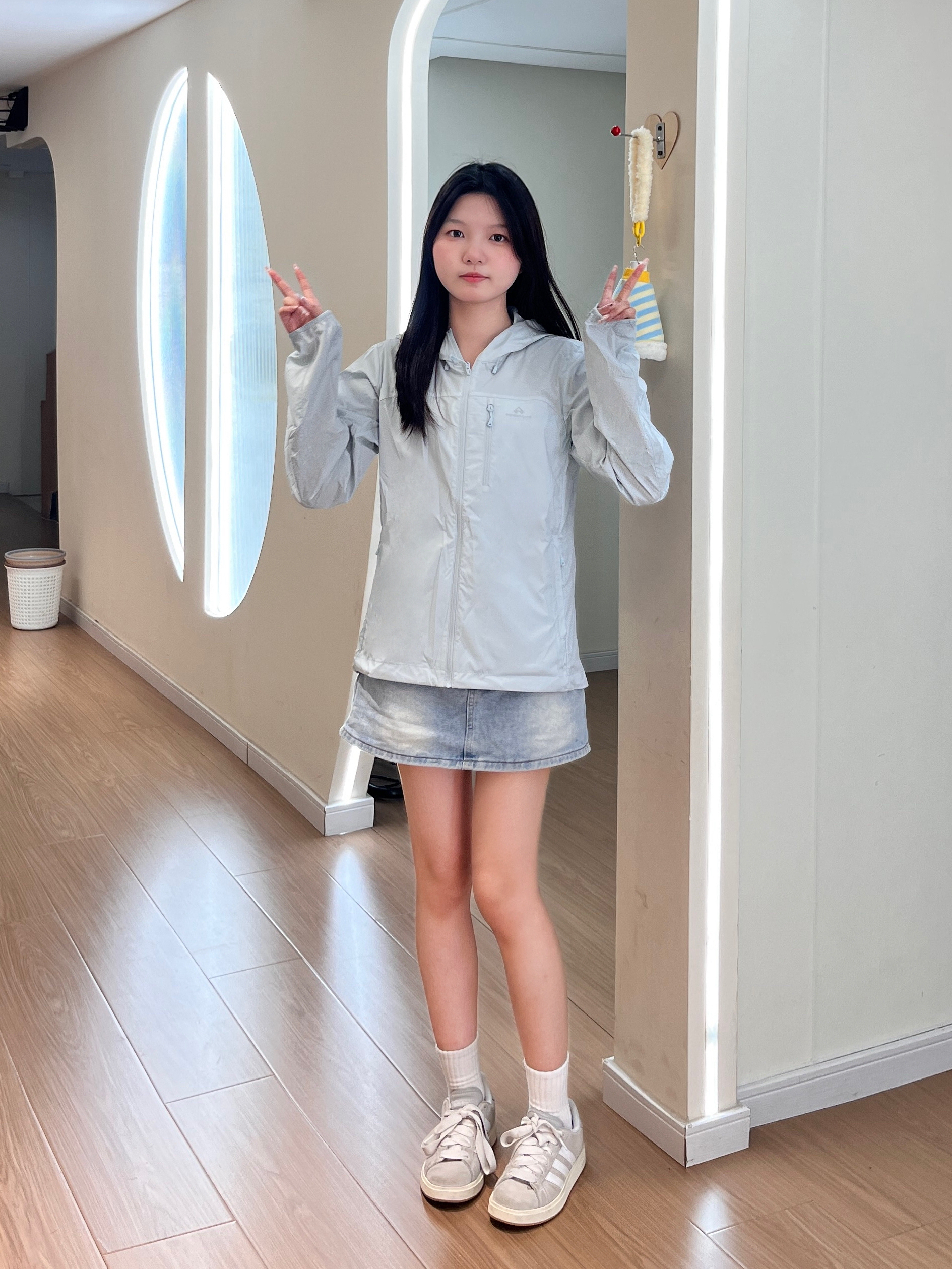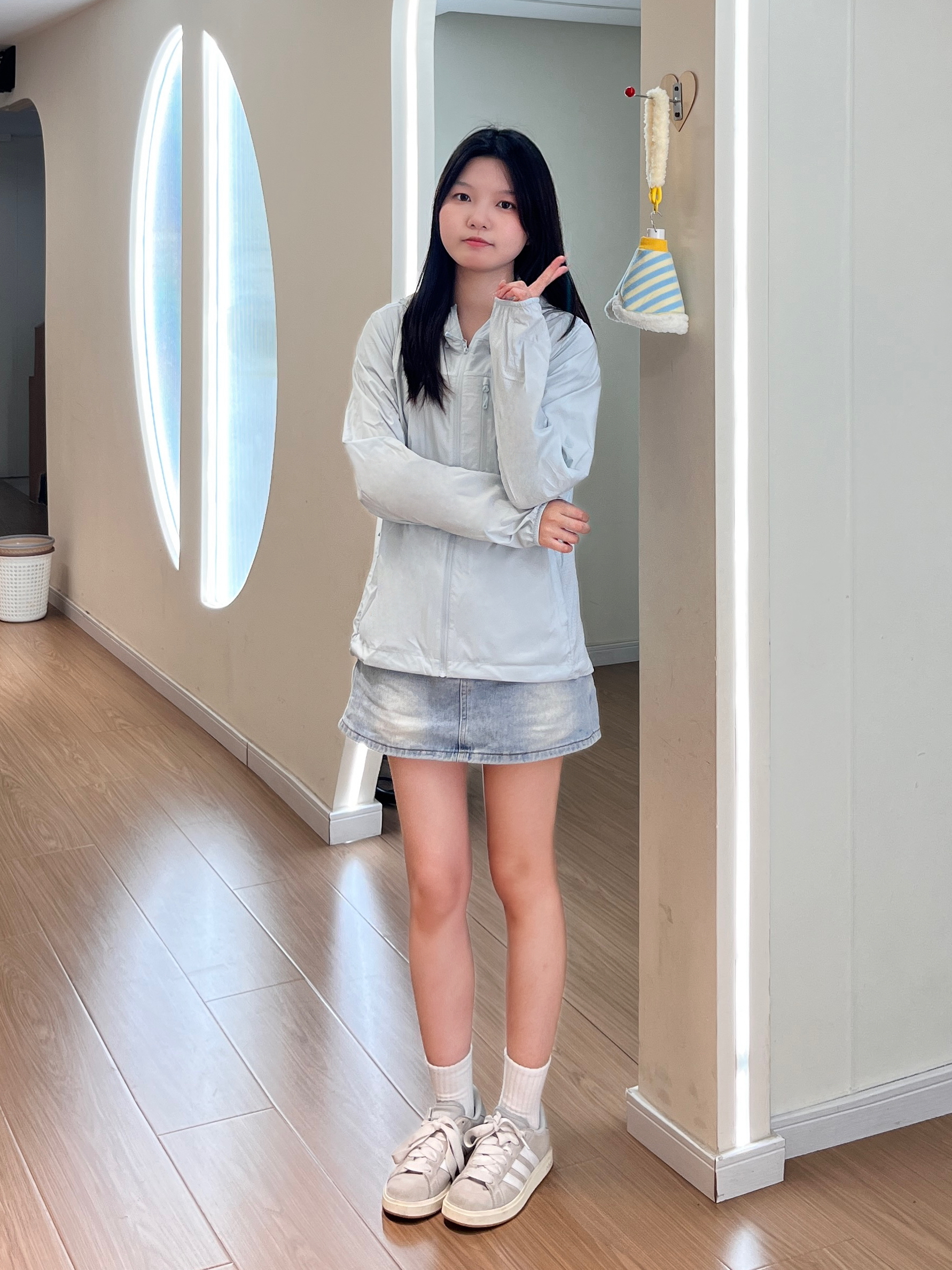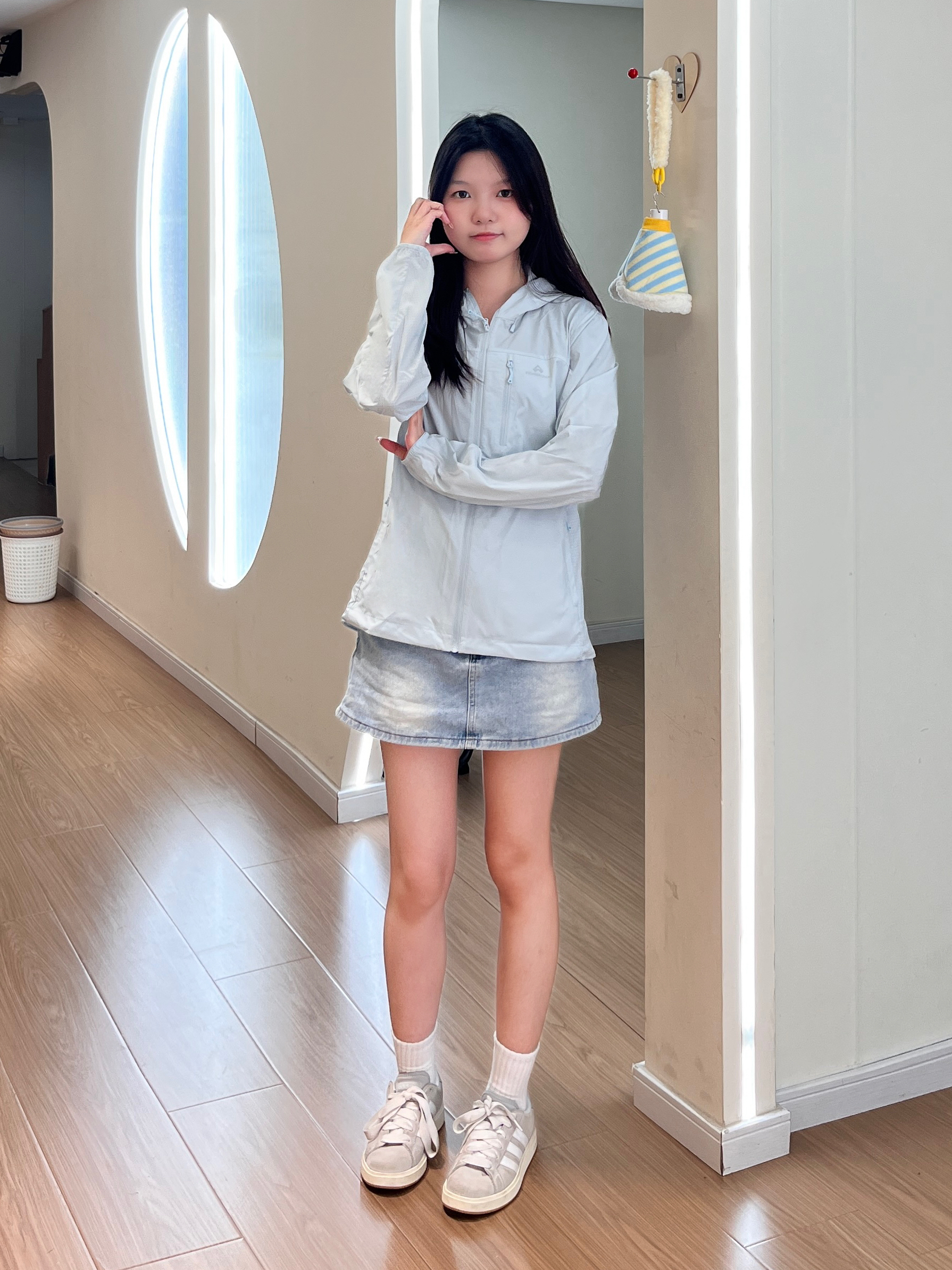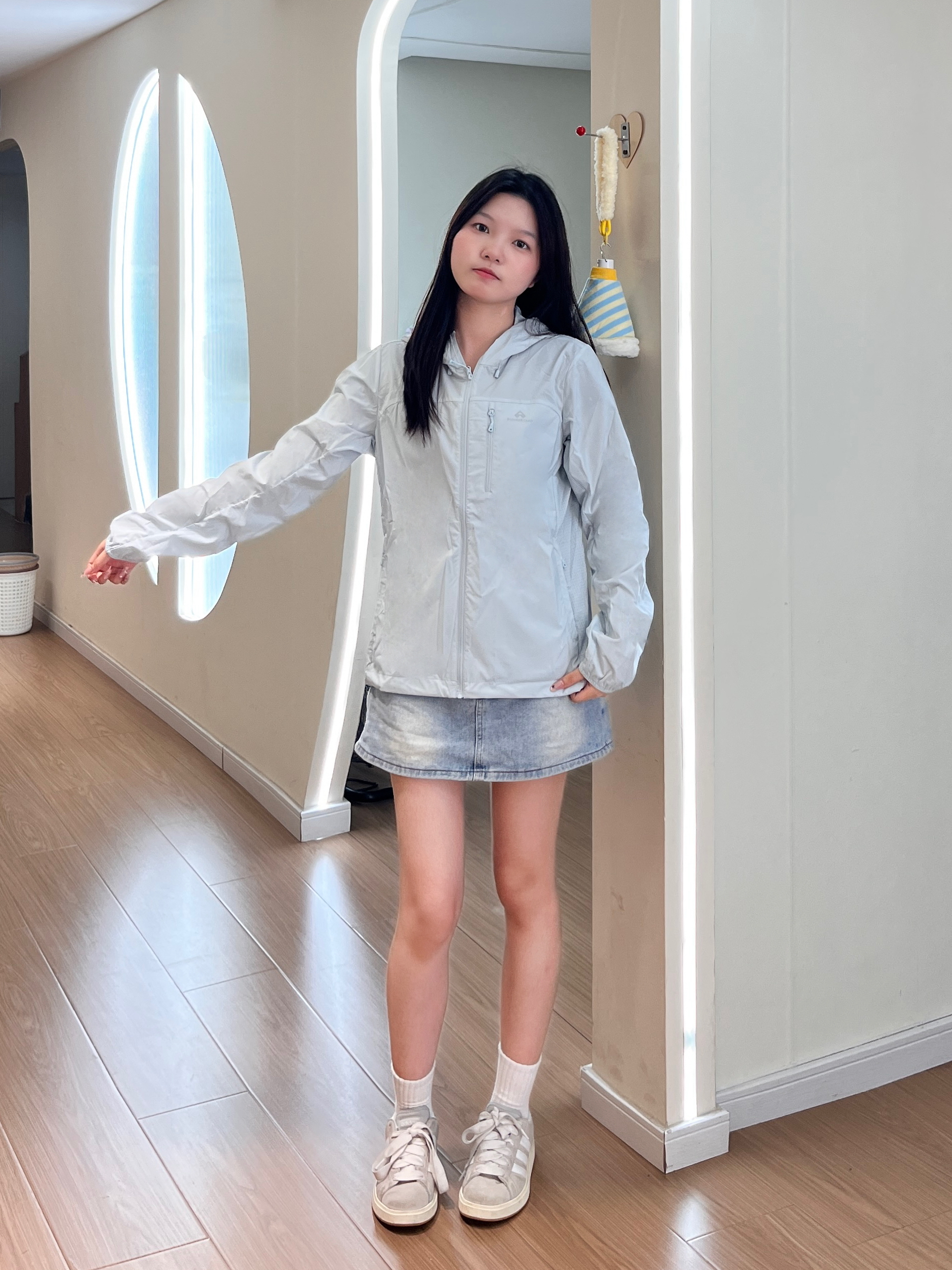 谁懂啊!夏天出门真的离不开防晒衣🥹 浅灰色巨显白,面料冰冰凉凉的,完全不闷汗~ 搭牛仔短裙+小白鞋,日常通勤、出门玩都超合适!版型不臃肿,小个子穿也完全不压个子,防晒又好看,夏天的安全感全靠它啦🌞