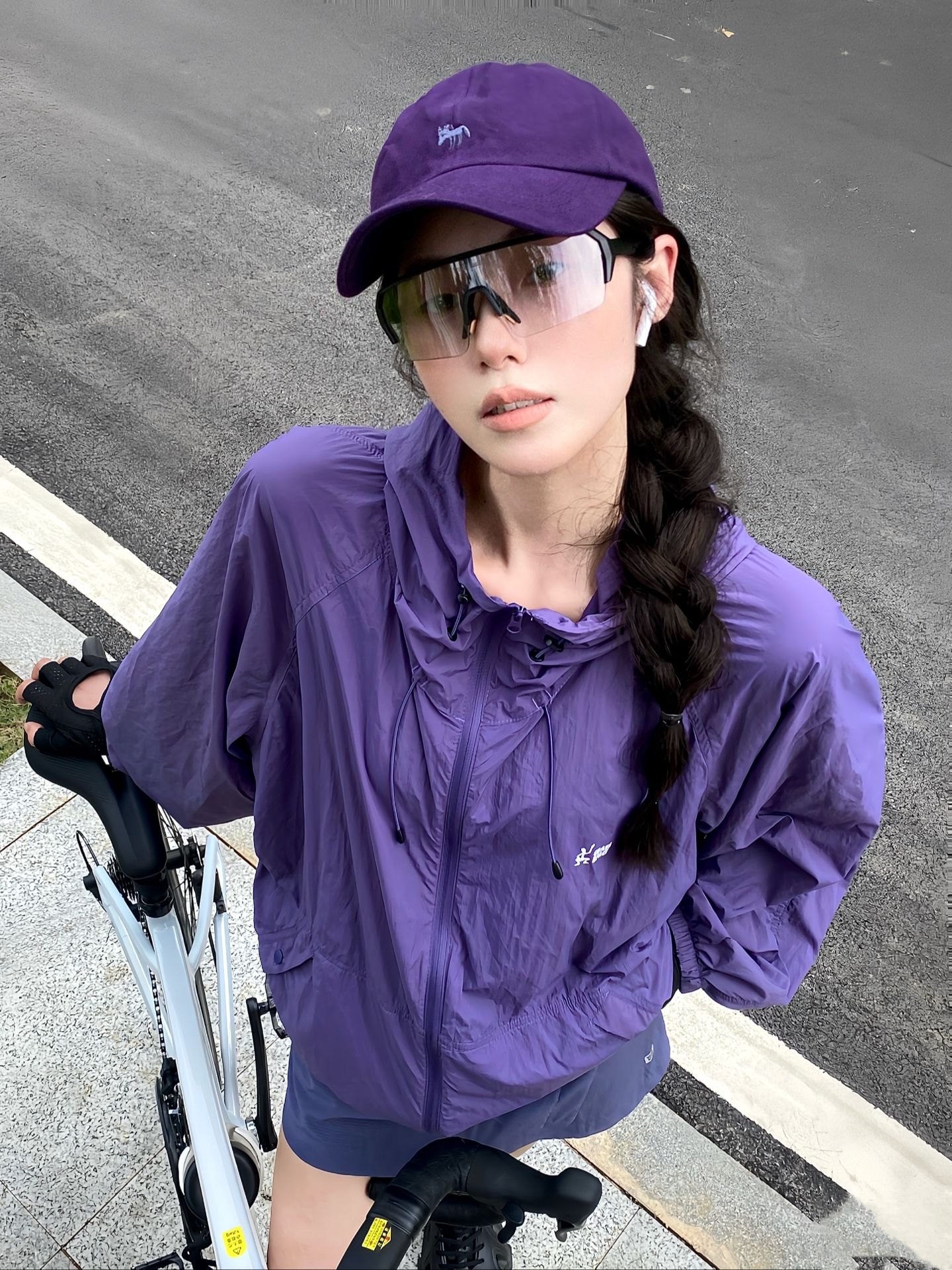 上身的紫色防晒外套面料轻薄透气,连帽款设计随性利落,袖口微微宽松,不影响抬手的动作,也不会有紧绷感。同色系的运动短裙版型利落,自带安全内衬,搭配起来利落又清爽,配色和湖边的绿意意外和谐。