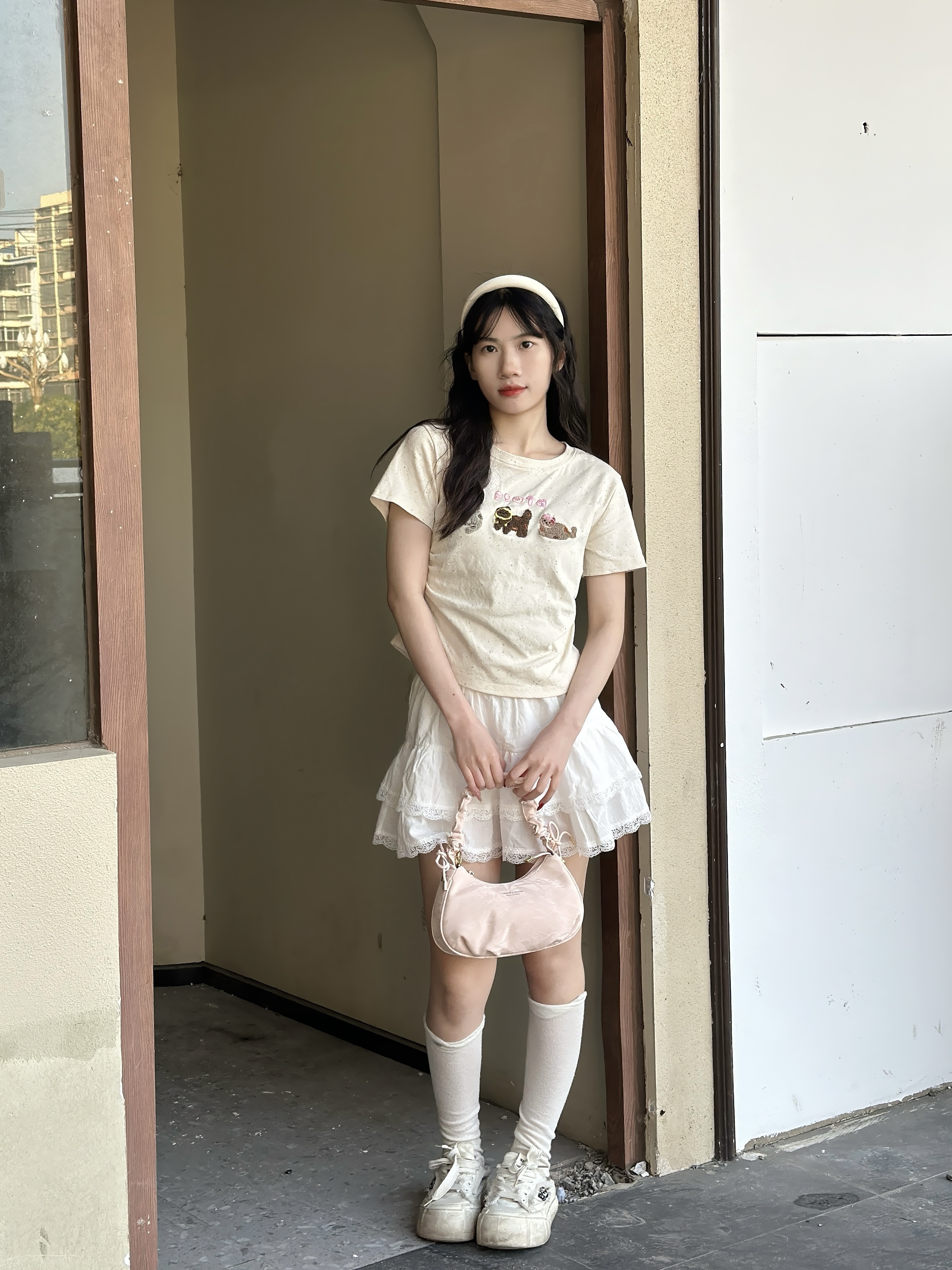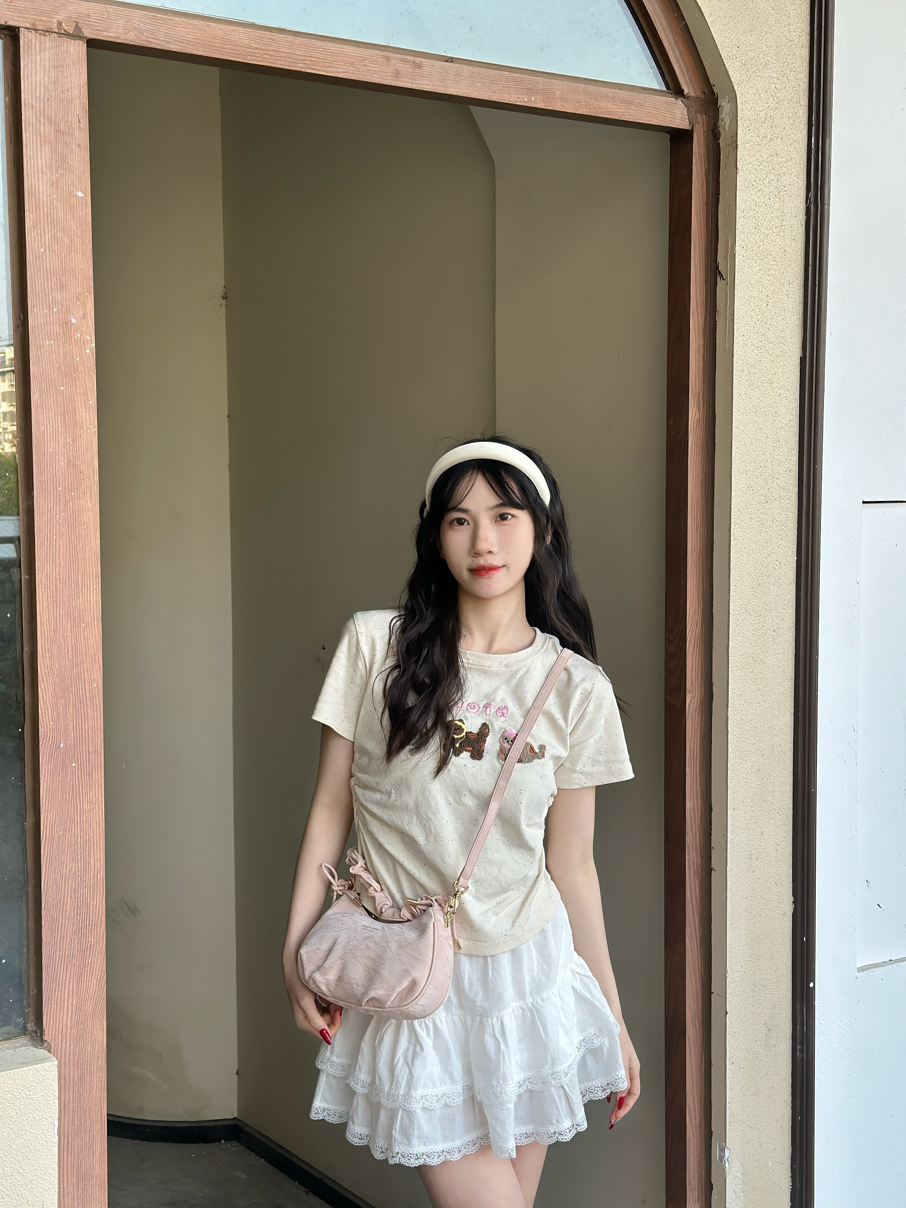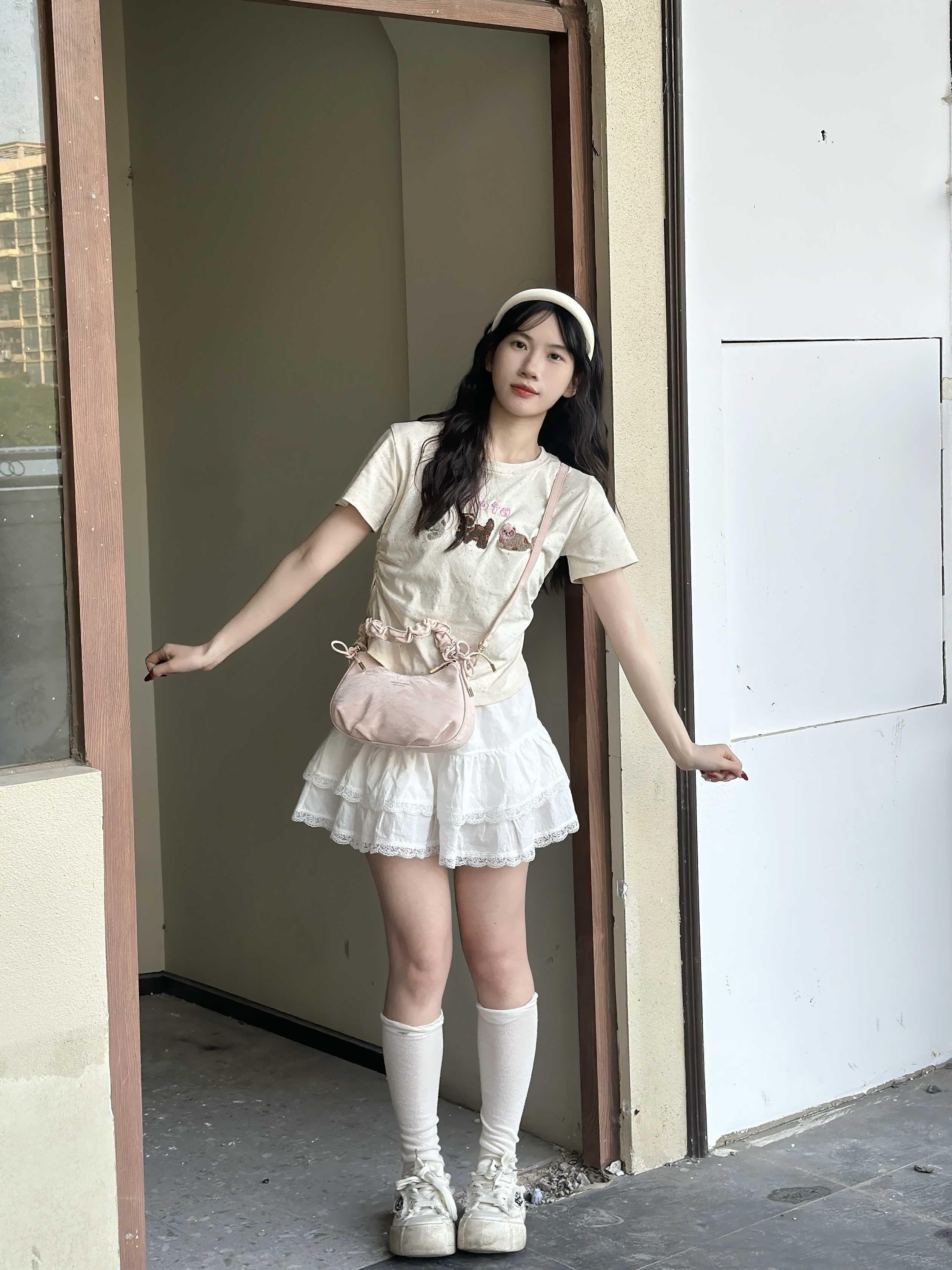 谁懂这套浅色系穿搭的温柔感✨ 软乎乎的浅杏印花短袖+蕾丝蛋糕短裙 妥妥元气减龄天花板 搭配同色系发箍、堆堆长袜 背上软萌云朵小包+百搭小白鞋 清爽又元气,日常出门、约会、逛街都超合适 不费力就能穿出干净清纯的少女氛围感,通勤上学都适配,懒人一套直接出门~