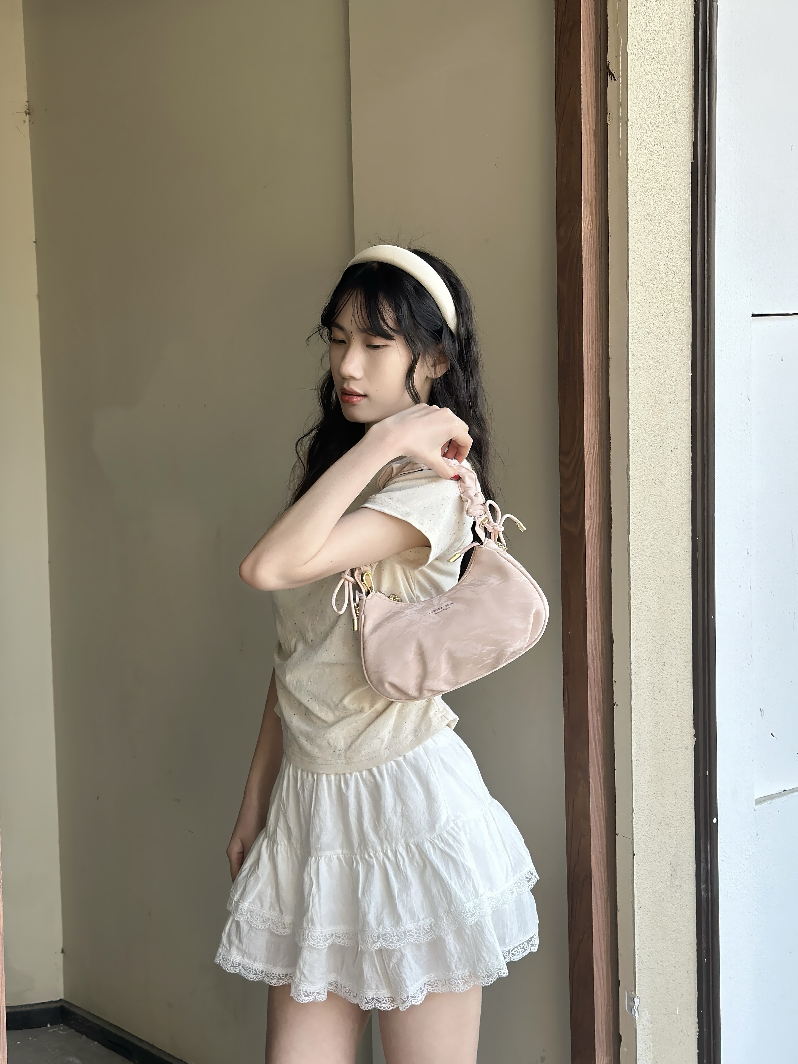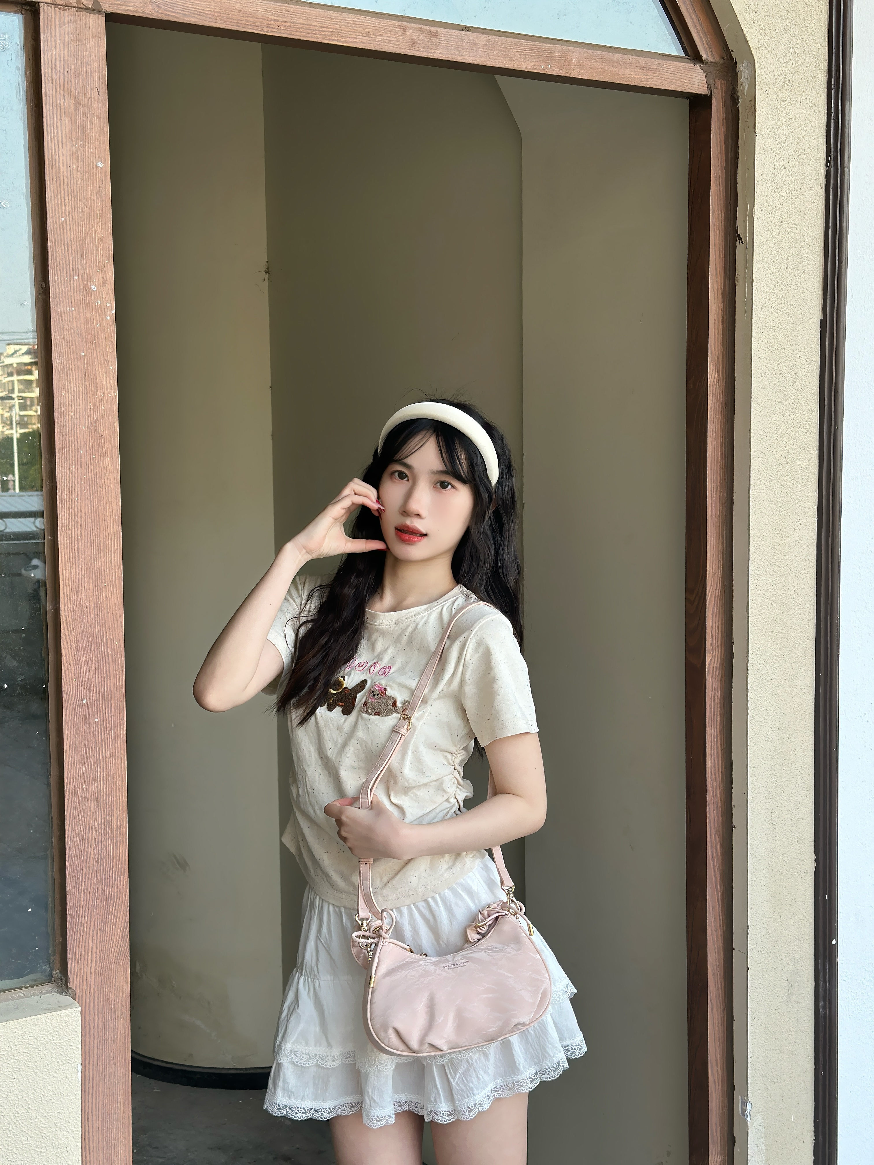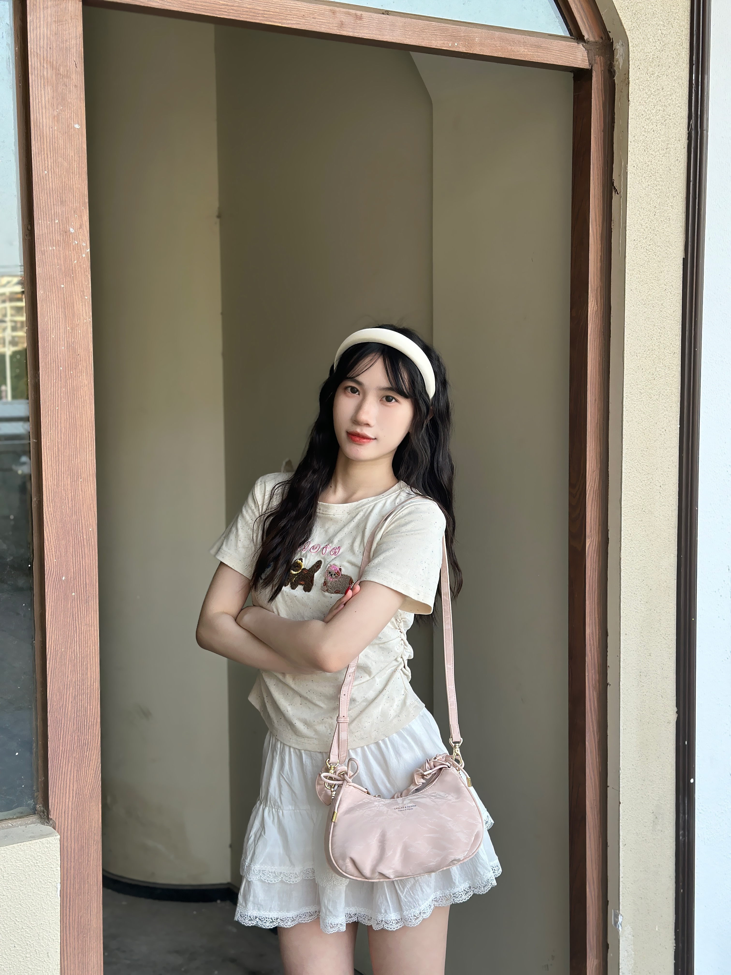 谁懂这套浅色系穿搭的温柔感✨ 软乎乎的浅杏印花短袖+蕾丝蛋糕短裙 妥妥元气减龄天花板 搭配同色系发箍、堆堆长袜 背上软萌云朵小包+百搭小白鞋 清爽又元气,日常出门、约会、逛街都超合适 不费力就能穿出干净清纯的少女氛围感,通勤上学都适配,懒人一套直接出门~