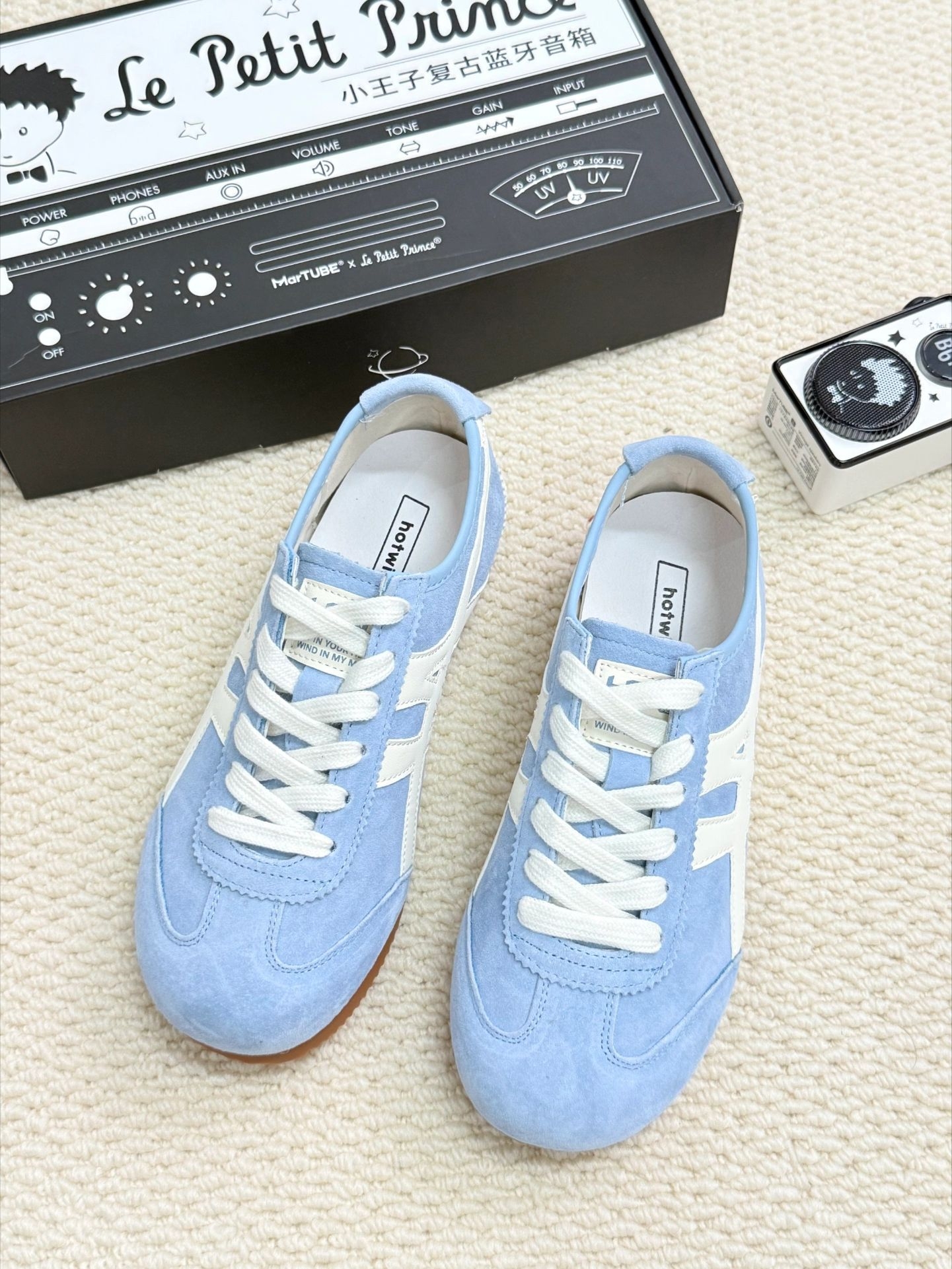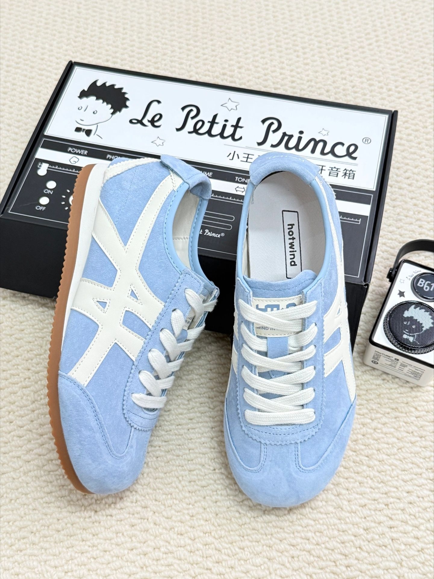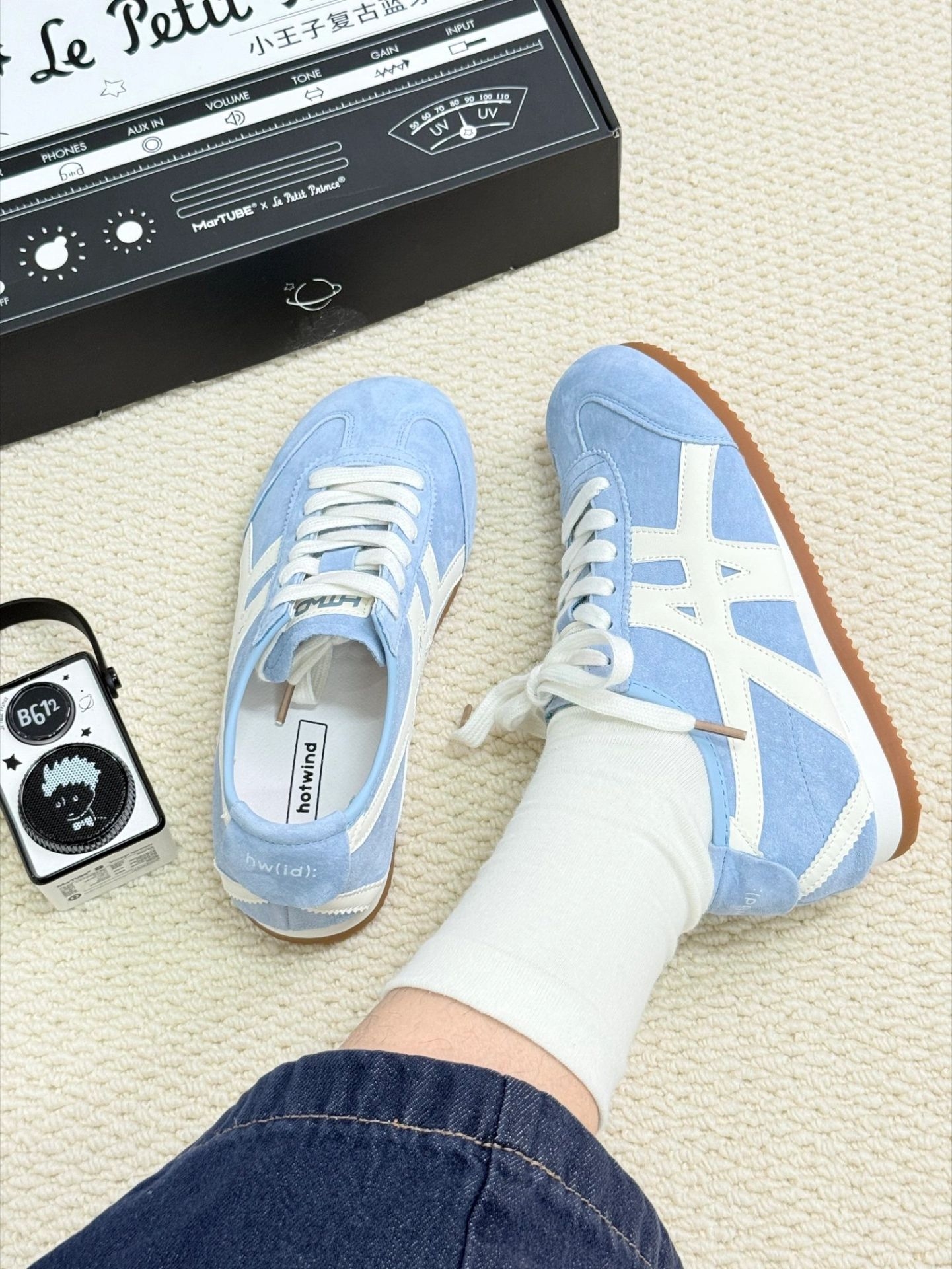 谁能拒绝一双干净又温柔的浅蓝德训鞋!! 热风这款复古阿甘鞋直接戳中审美,浅蓝拼接米白,配色清爽又治愈,自带春夏松弛感~ 磨砂皮质质感超棒,上脚软乎乎不磨脚,平底版型走路巨舒服。 百搭不挑穿搭,牛仔裤、半身裙、运动裤都能完美适配,日常通勤、逛街遛弯穿都合适,平价又耐看,温柔系女生闭眼冲💧