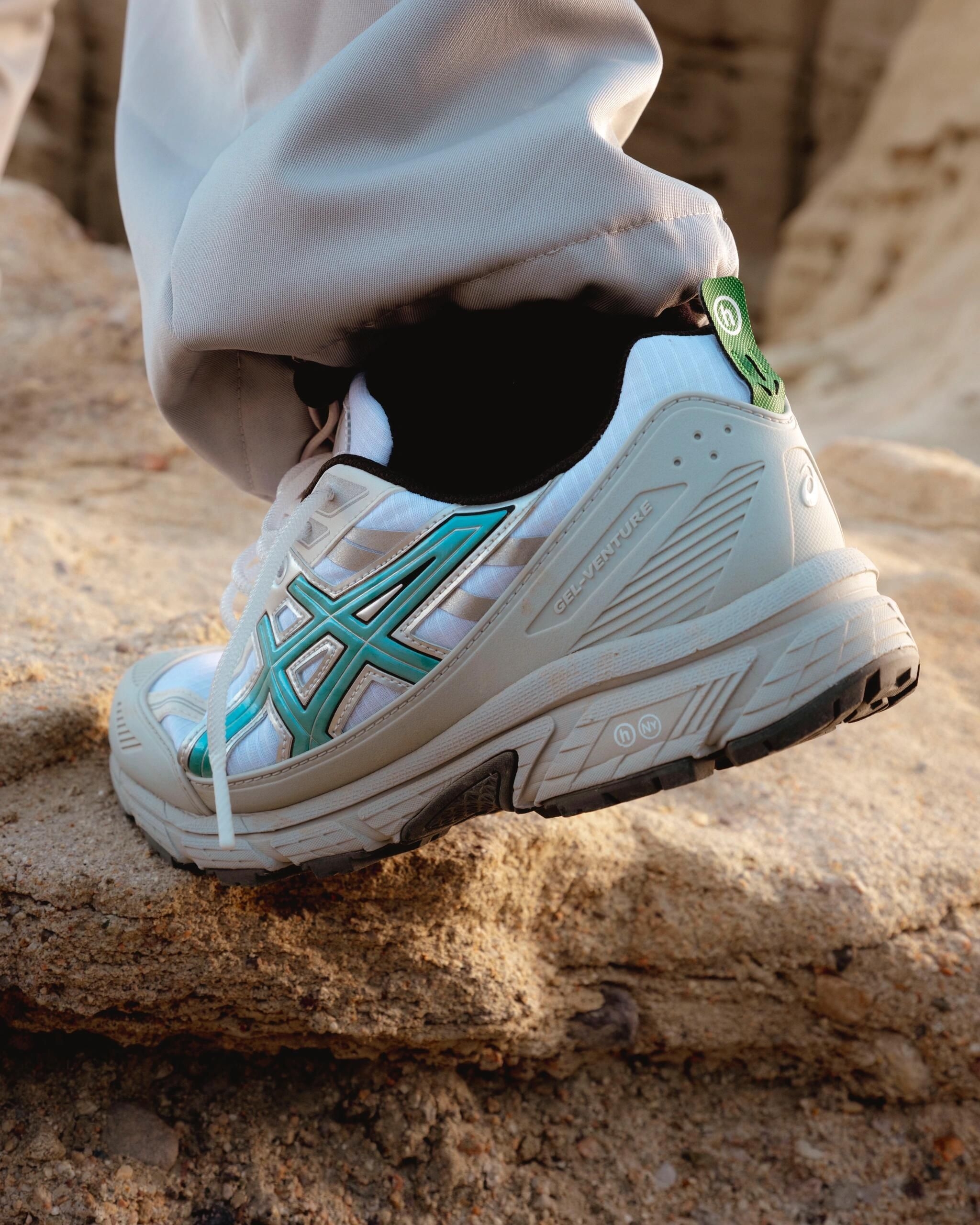 👟ASICS携手Hidden.NY推出的GEL-VENTURE 6联名跑鞋,灵感来自宝石实验室和考古研究。白色防撕裂网布鞋面+绿松石金属虎爪纹,细节超有辨识度✨。透明硅胶鞋带、反光元素和品牌标识,实用又时髦!缓震耐磨,日常穿搭或轻运动都OK,复古配色+独特设计,潮流爱好者必入!