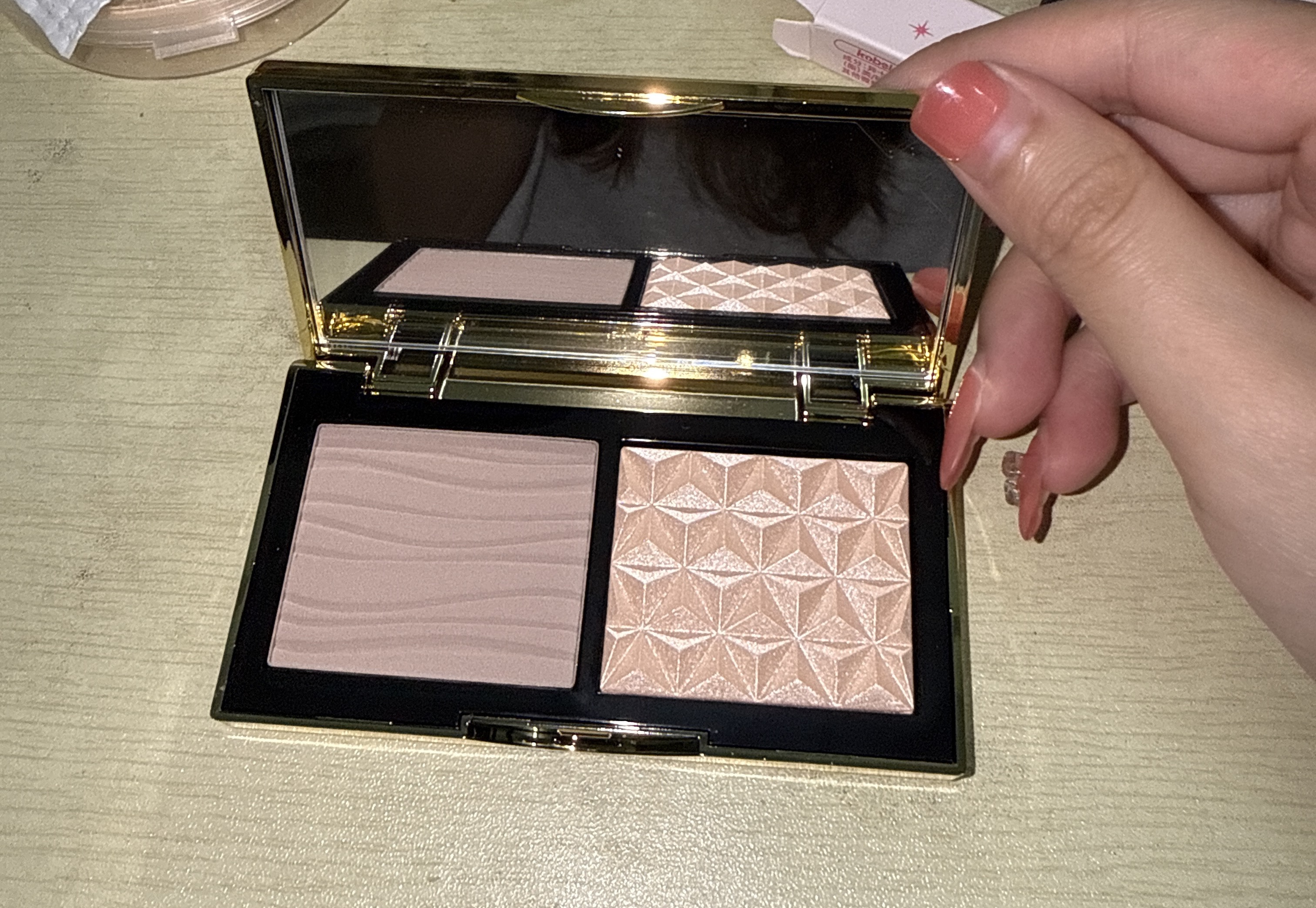 拿到手的时候就被这个金色外壳戳中了,质感好到不像MAC平时的风格✨ 打开就是一深一浅两块,深色是很正的灰调阴影,浅色是带细闪的高光,一盘直接搞定轮廓和提亮,不用再凑单买两盘了! 我这种平时不化妆的人,用它也完全不会出错: 深色扫在颧骨和下颌线,轻轻带两下,脸直接小了一圈,完全不会显脏; 高光打在鼻梁和眉骨,就是那种很自然的骨相提亮,不是那种很夸张的大闪,素颜涂也完全不突兀。 而且粉质巨细腻,用...
