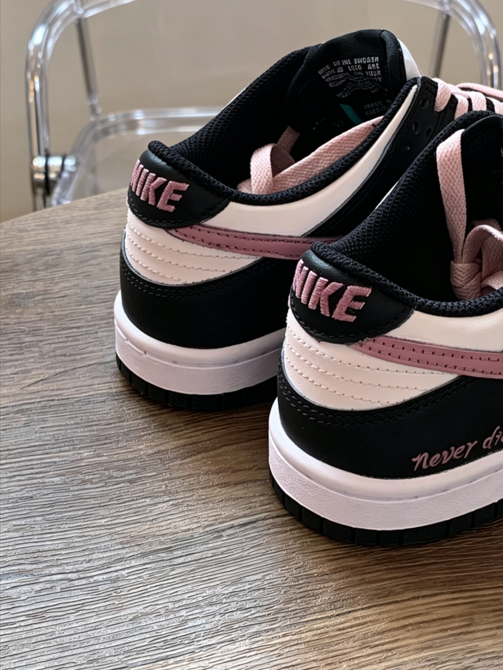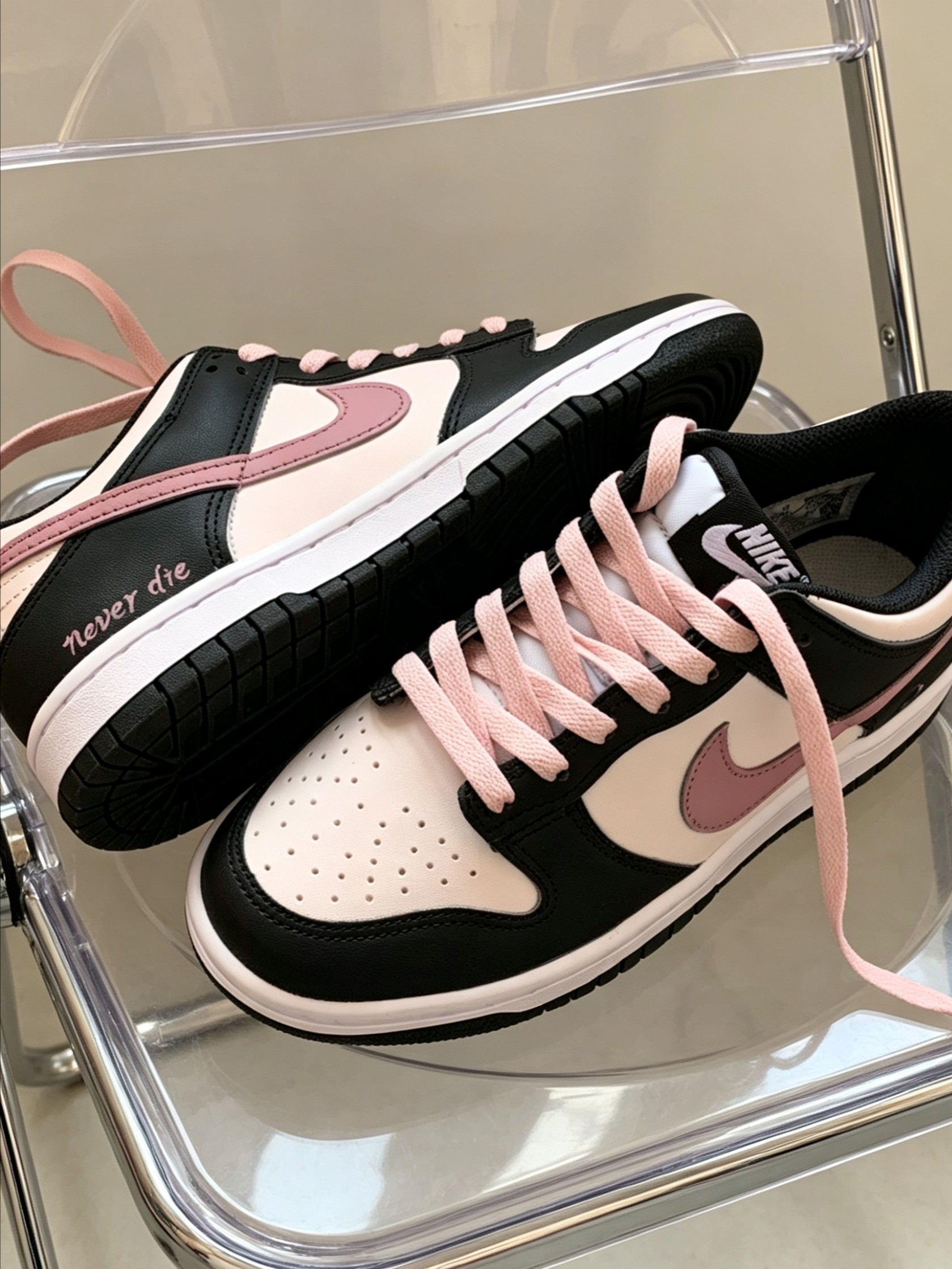 谁懂啊!黑粉配色直接戳中少女心! 奶fufu的浅粉搭配经典黑,加上鞋侧的“never die”小刺绣,甜酷感直接拉满~ 上脚又软又百搭,牛仔裤、百褶裙都能hold住,日常出门回头率超高✨