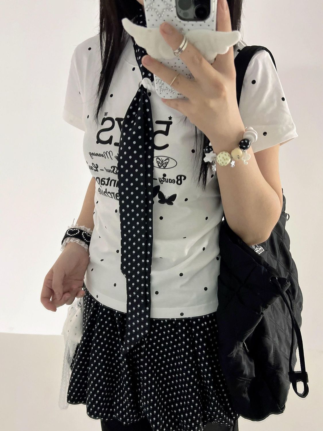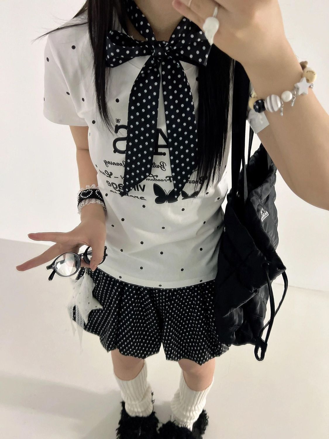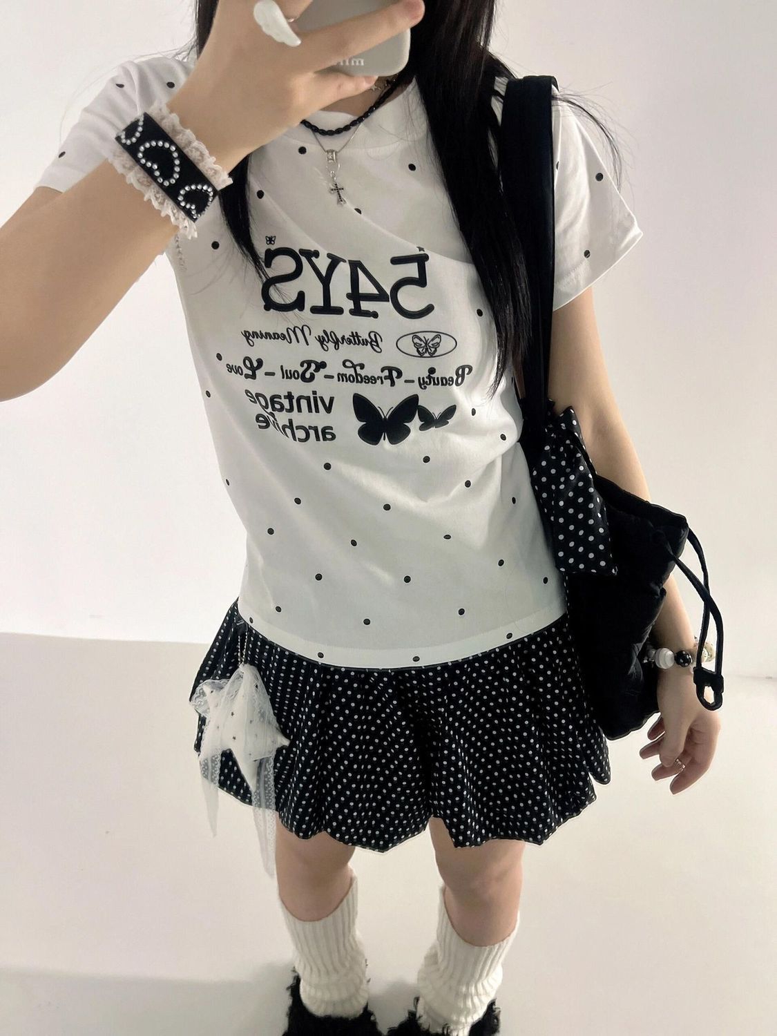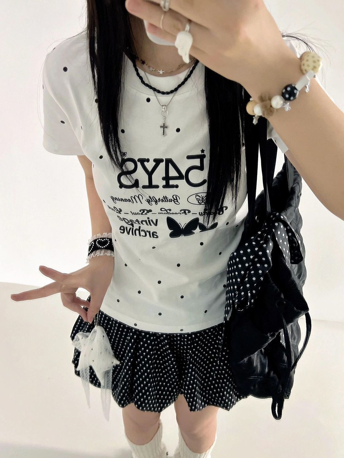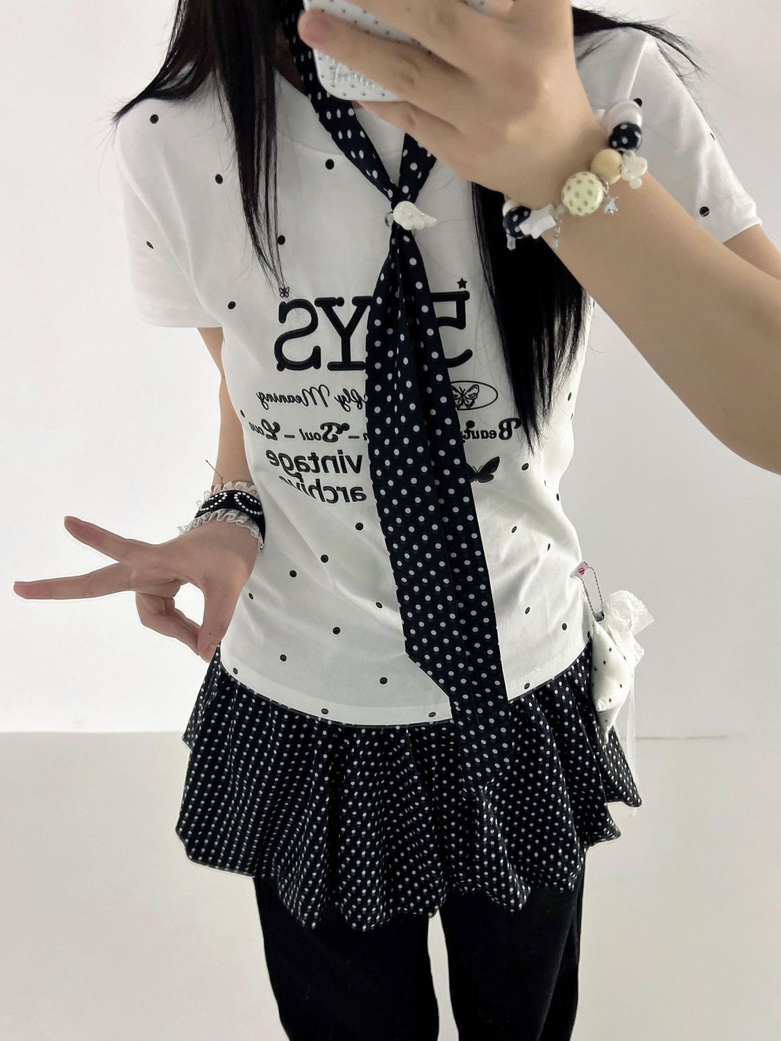 配饰加分:搭配彩色串珠手链、蕾丝发圈、甜酷风包包,能让造型的轻亚感更突出。 风格适配:这套穿搭很适合日常出街、探店、约会,也可以搭配厚底鞋或帆布鞋,打造不同的甜酷氛围。 元素复用:波点元素自带复古感,日常搭配中可以尝试用波点发带、袜子、包包来呼应,轻松营造韩系甜妹氛围。