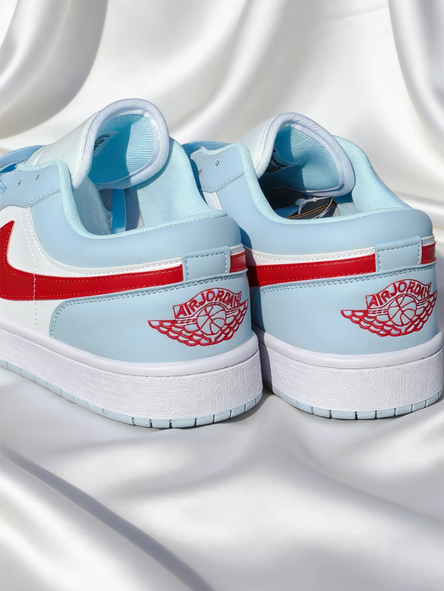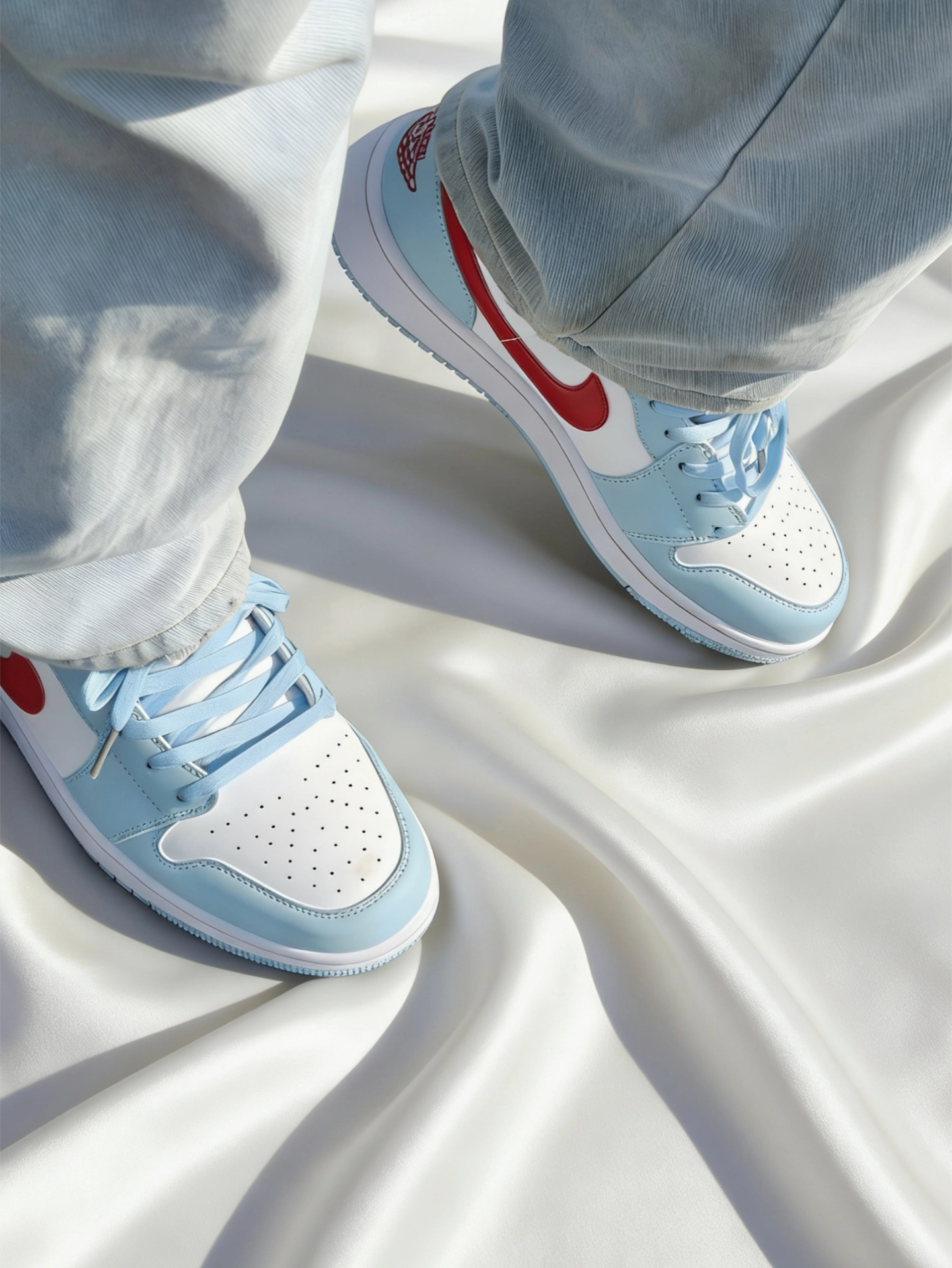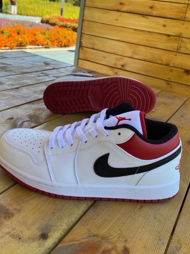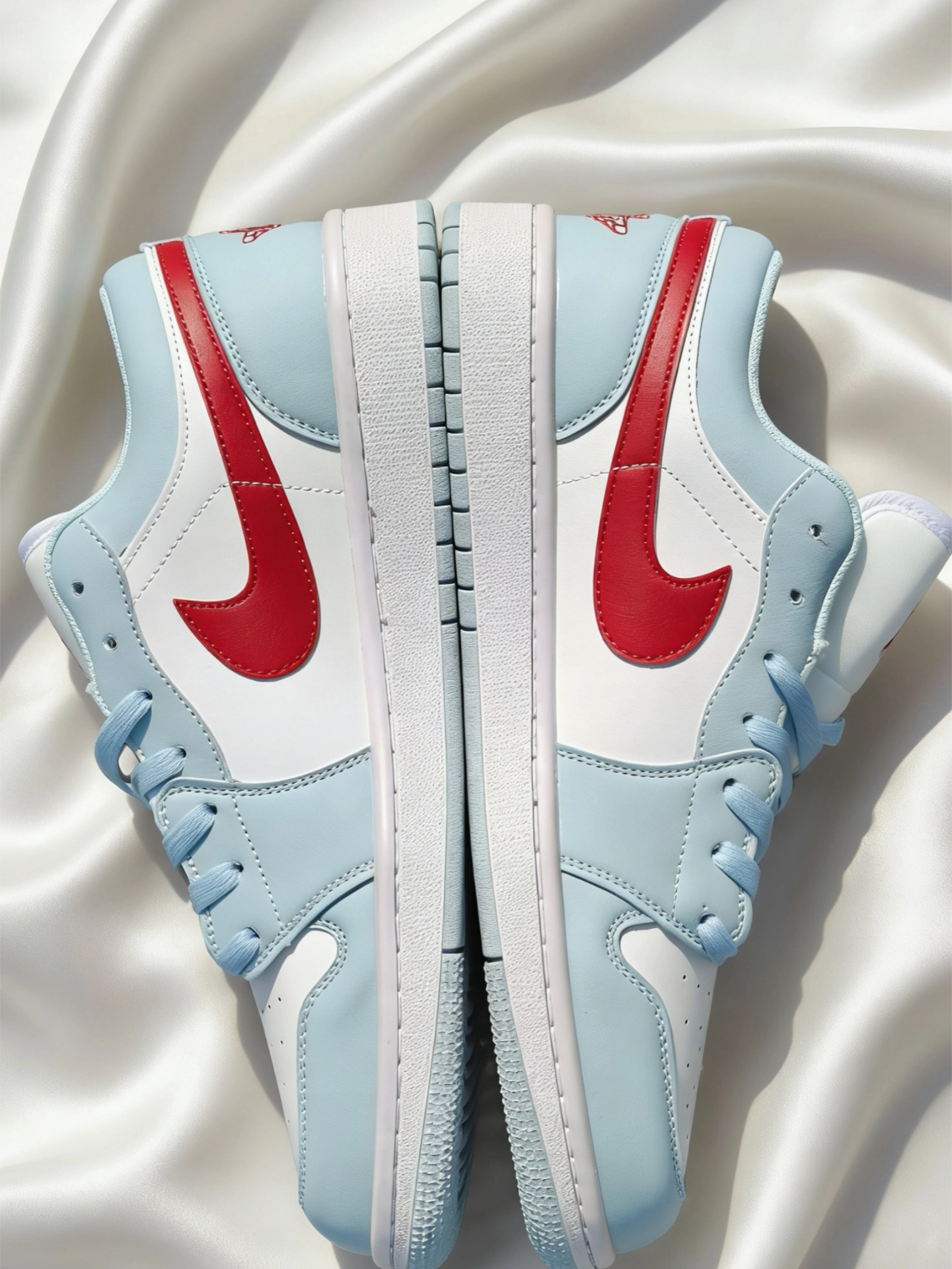 Air Jordan 1 Low 冰蓝红勾配色真的是越看越香。 冰蓝皮革+白红撞色,就像夏日里的海盐汽水,清爽又吸睛,比纯蓝更有层次,又比彩色款更耐看。 皮面质感在线,不管是搭浅蓝牛仔裤、白T还是运动短裤都很顶。 日常通勤、上学、出街随便穿,属于“不知道穿啥就穿它”的鞋。