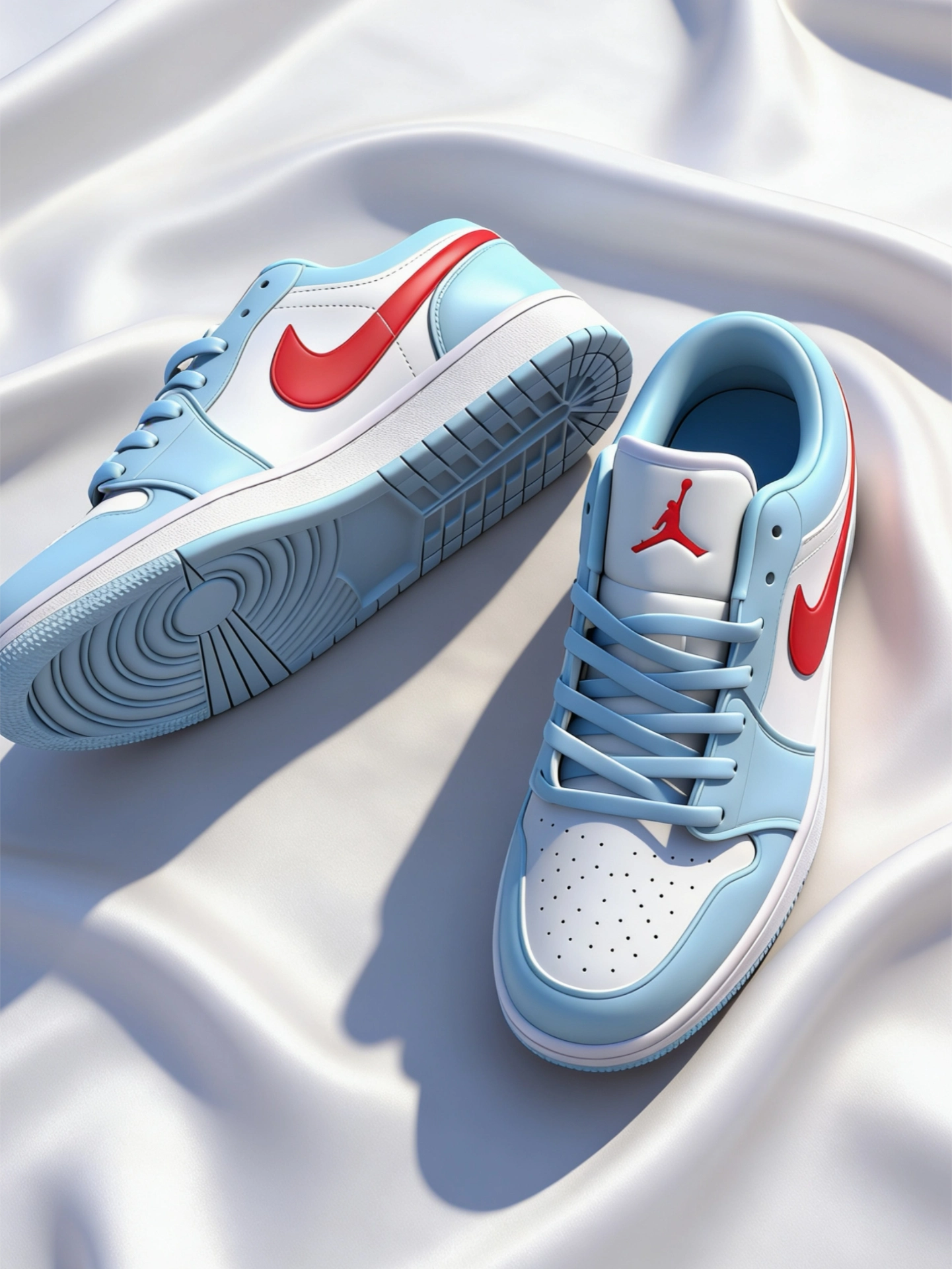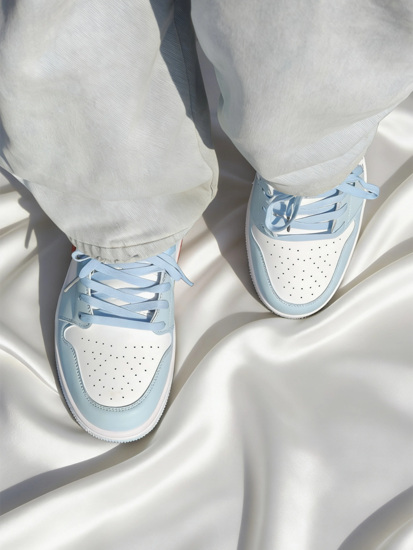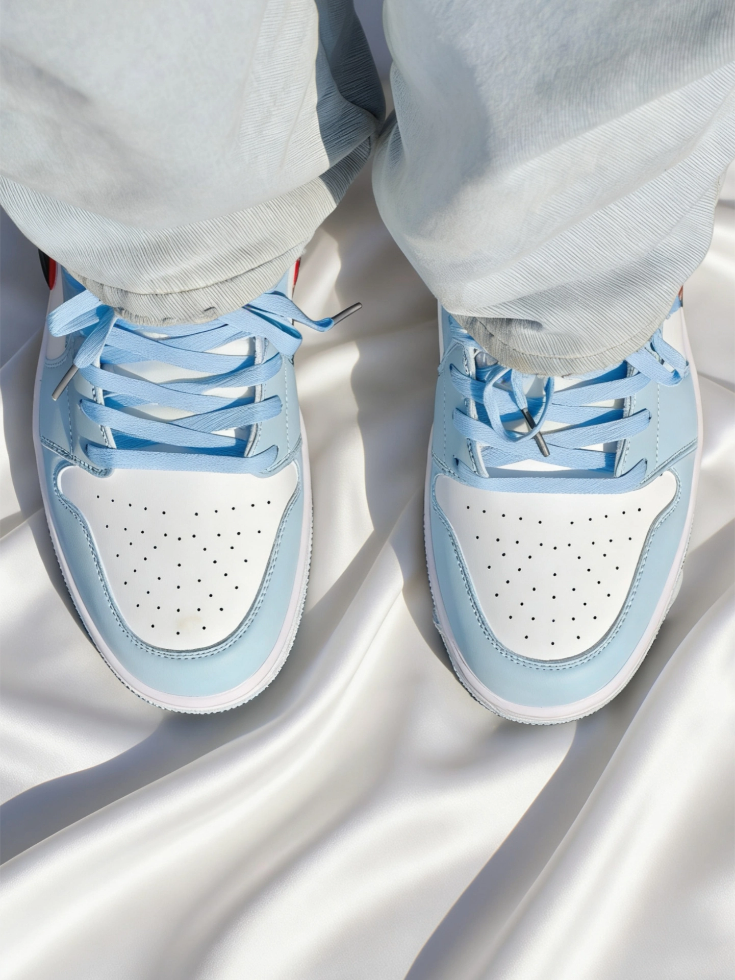 Air Jordan 1 Low 冰蓝红勾配色真的是越看越香。 冰蓝皮革+白红撞色,就像夏日里的海盐汽水,清爽又吸睛,比纯蓝更有层次,又比彩色款更耐看。 皮面质感在线,不管是搭浅蓝牛仔裤、白T还是运动短裤都很顶。 日常通勤、上学、出街随便穿,属于“不知道穿啥就穿它”的鞋。