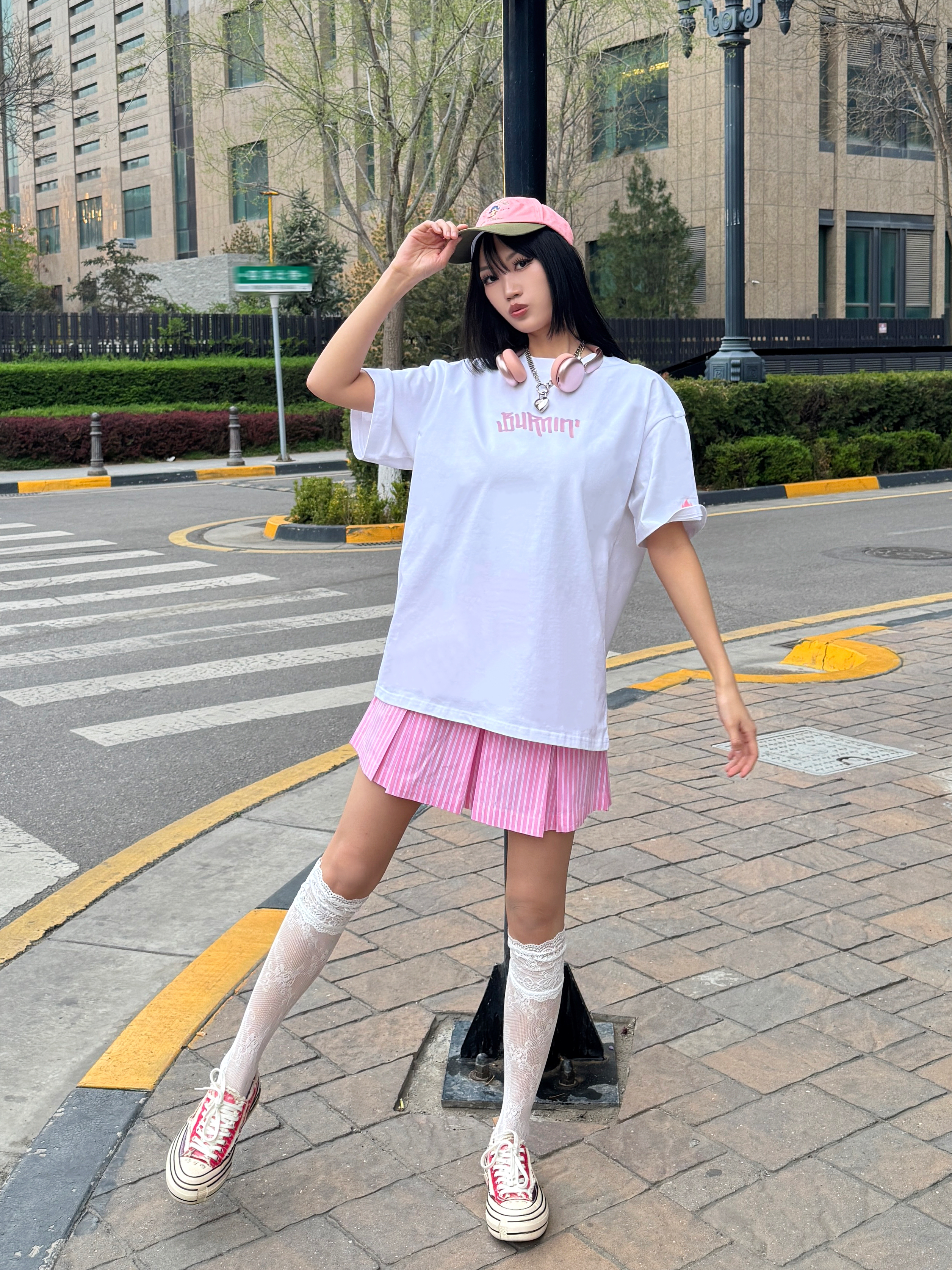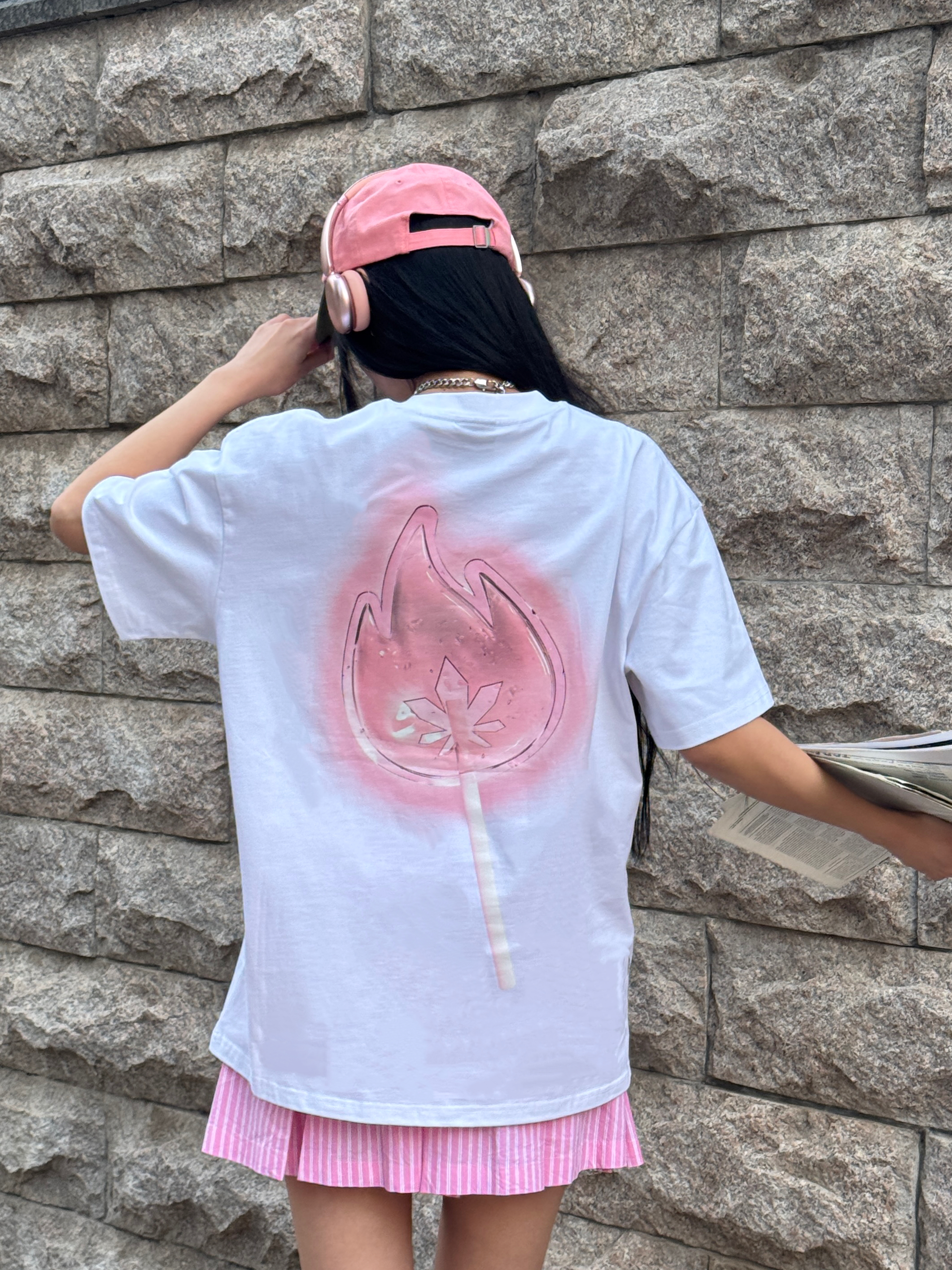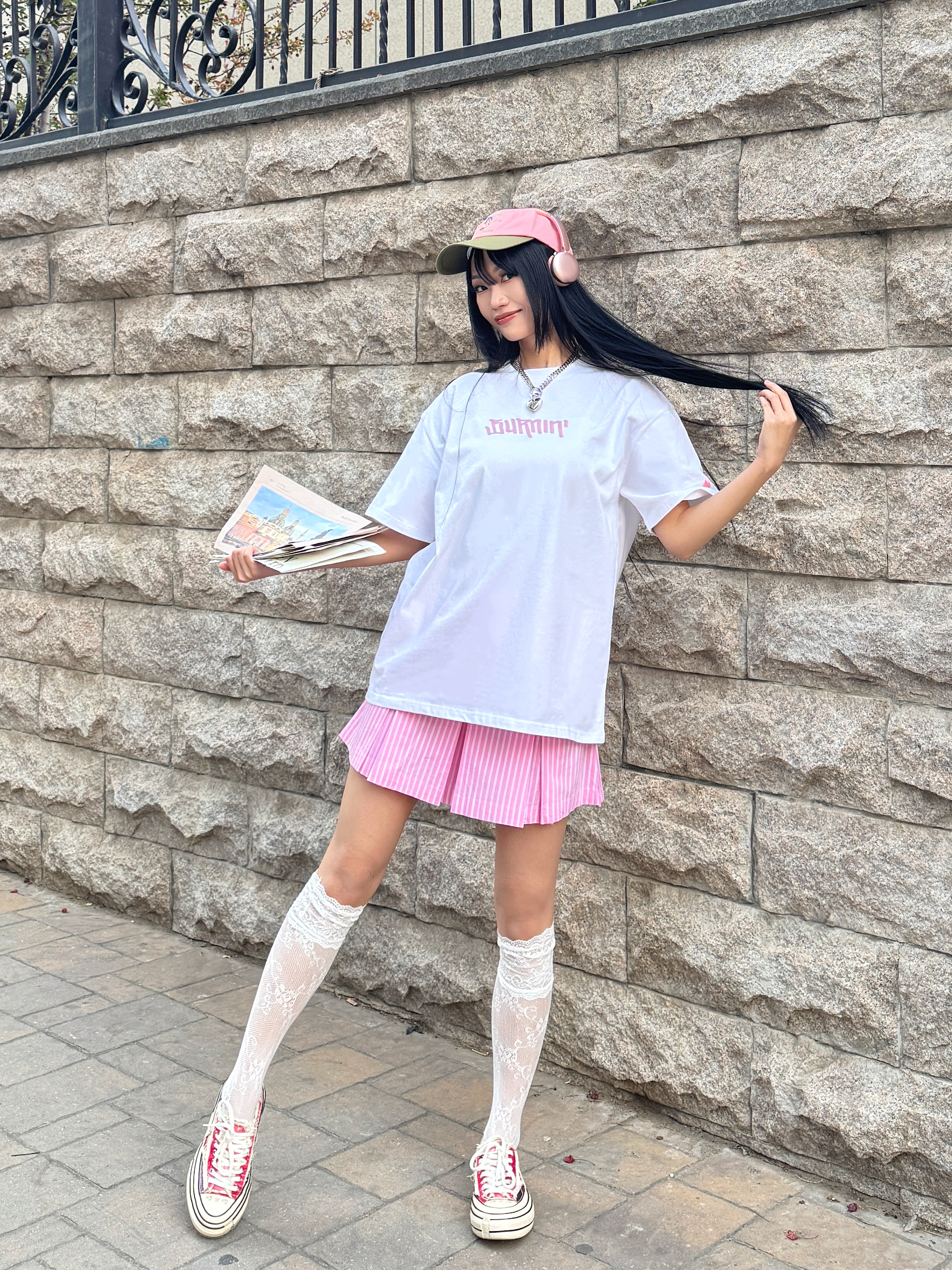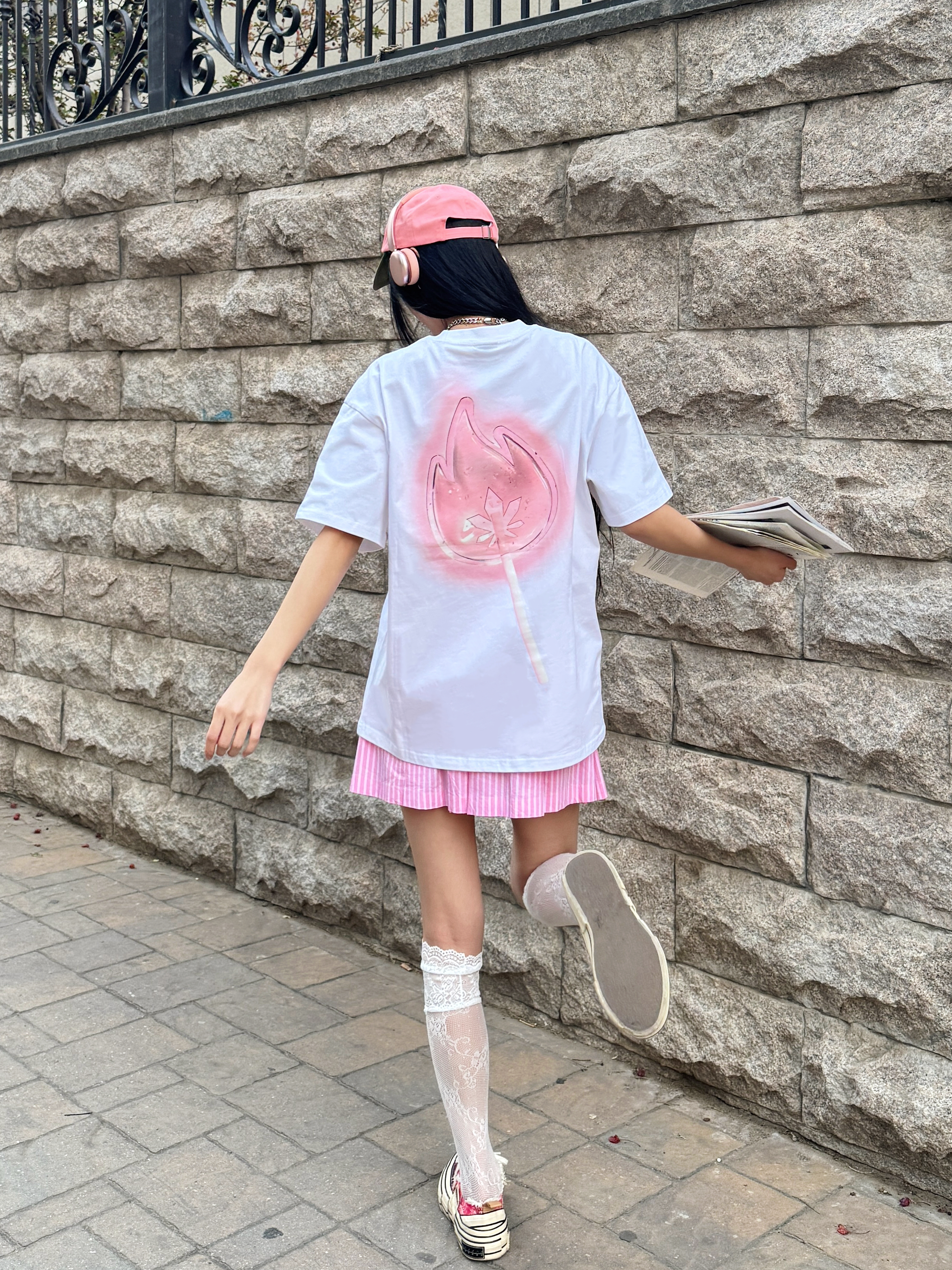 偶尔也想回忆一下青春力max的女大穿搭,今日份穿搭白➕粉撞色,是不是很有活力呢?粉色💕系真的很甜~ 🎧今日份穿搭分享: 粉色鸭舌帽➕ BURNIN 白粉小火苗棒棒糖短袖➕粉色竖条半裙➕粉色腰果花鞋=春夏活力内啡肽女大穿搭ootd。 📌📐短袖尺码建议:170 100 M宽松。