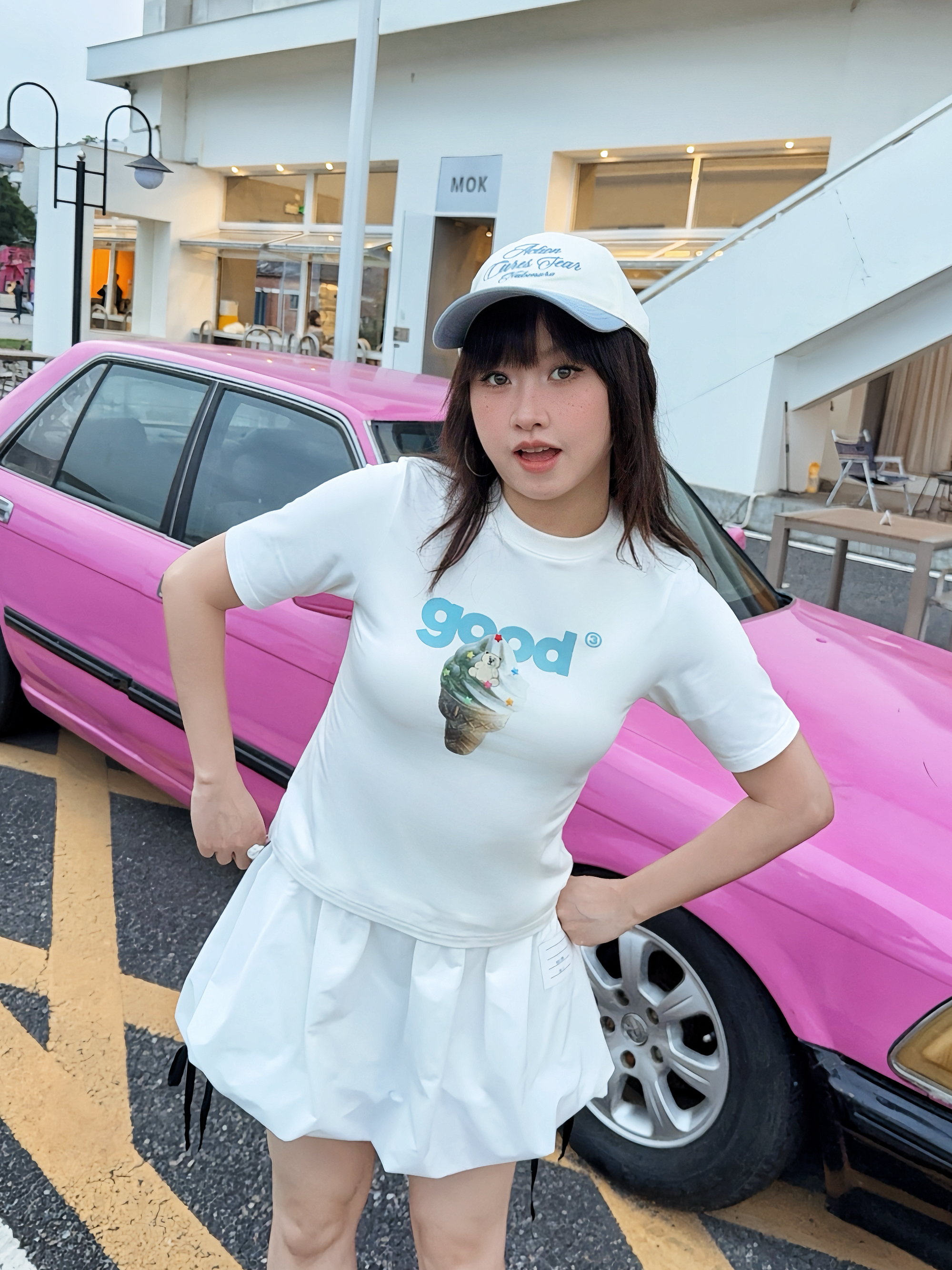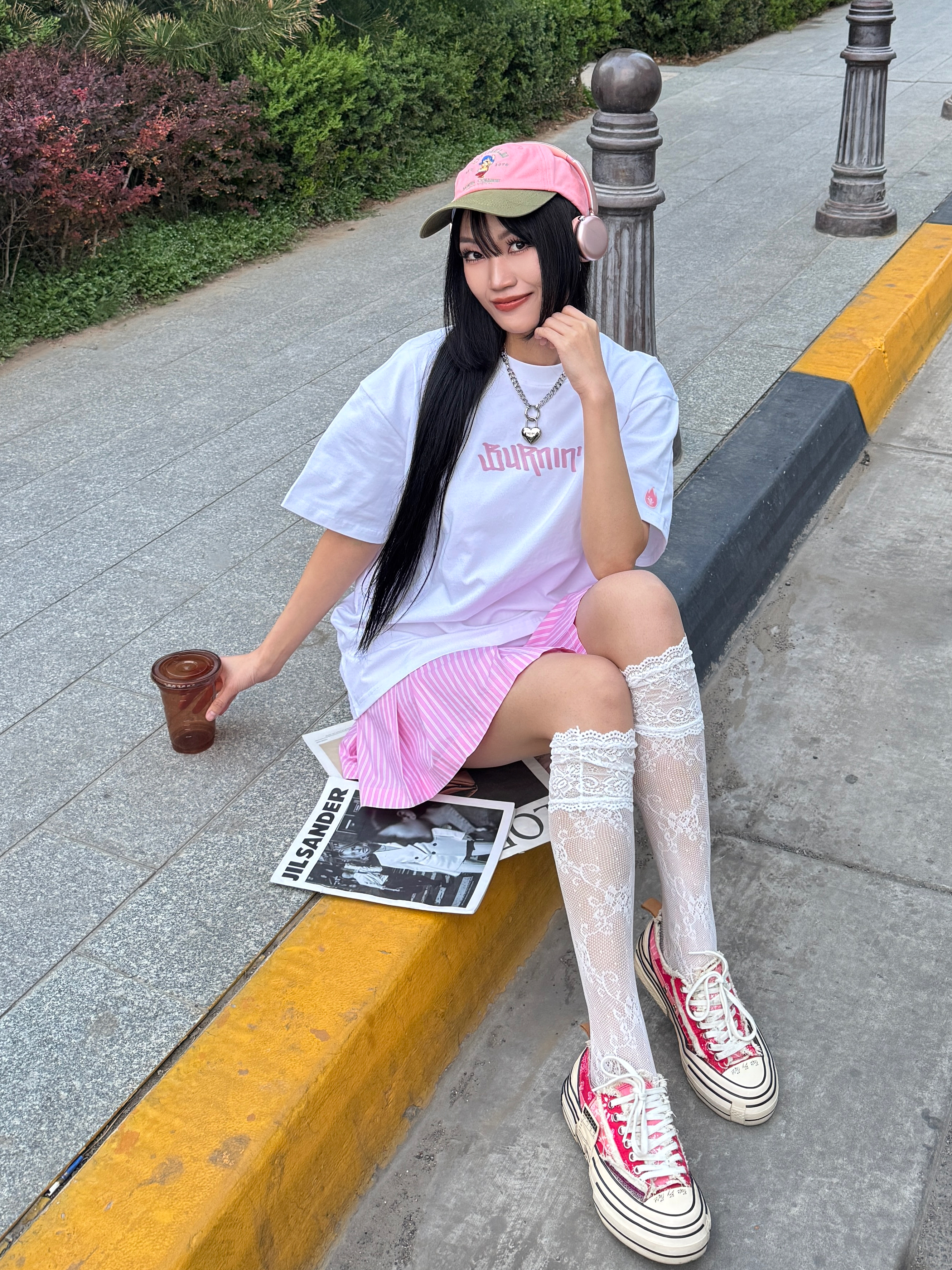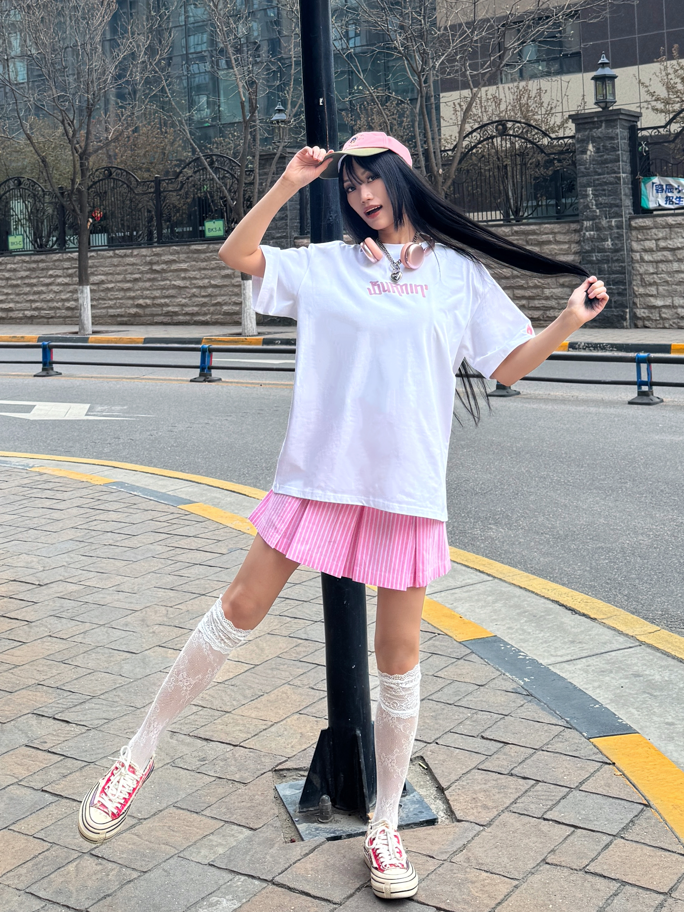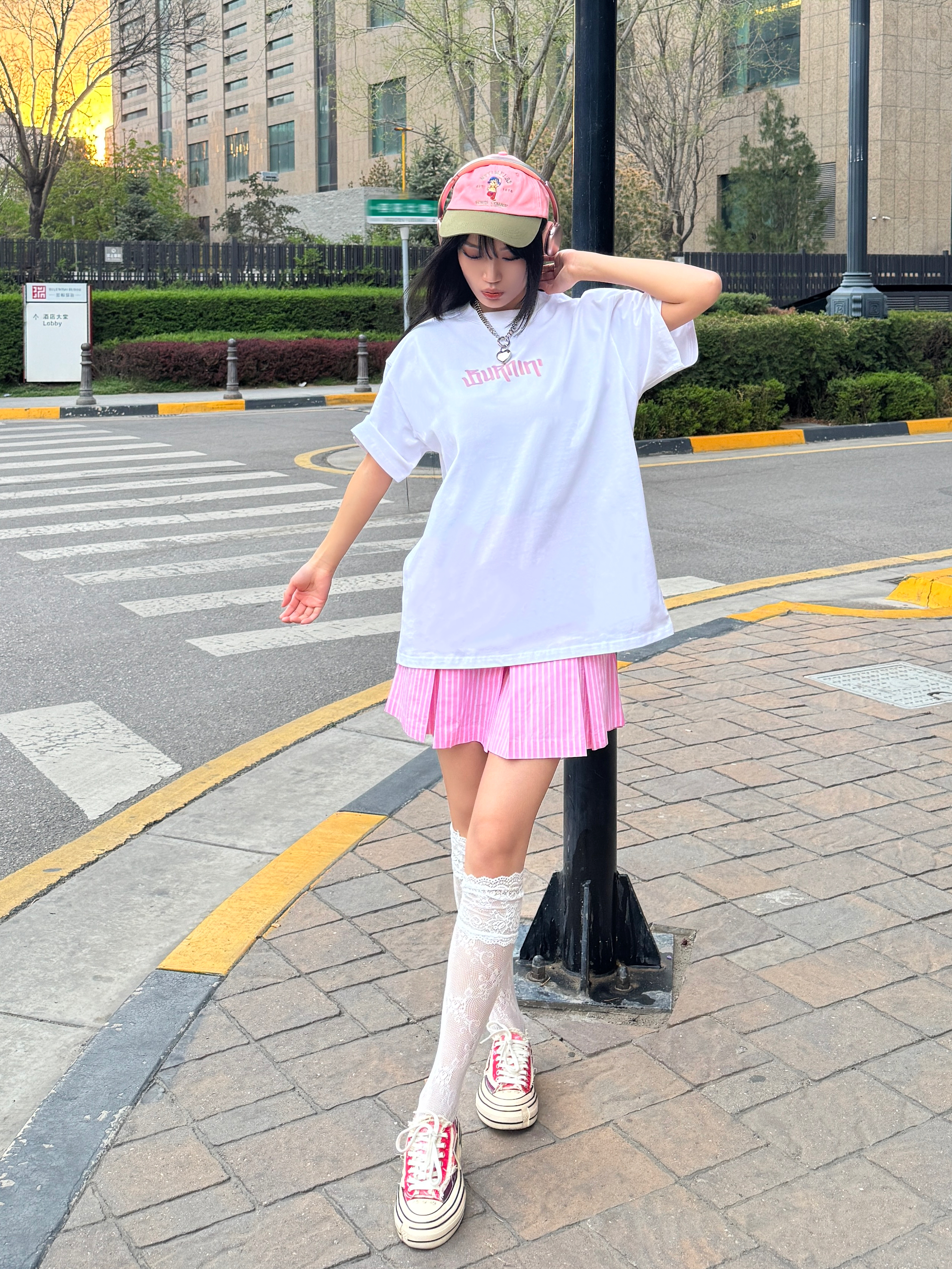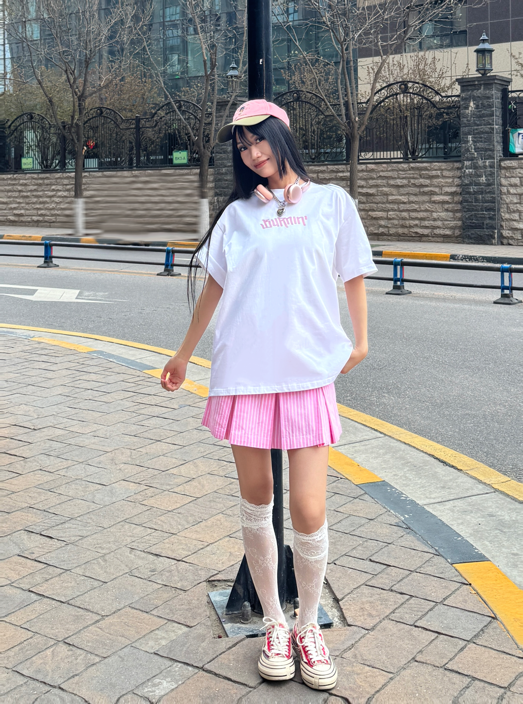 偶尔也想回忆一下青春力max的女大穿搭,今日份穿搭白➕粉撞色,是不是很有活力呢?粉色💕系真的很甜~ 🎧今日份穿搭分享: 粉色鸭舌帽➕ BURNIN 白粉小火苗棒棒糖短袖➕粉色竖条半裙➕粉色腰果花鞋=春夏活力内啡肽女大穿搭ootd。 📌📐短袖尺码建议:170 100 M宽松。
