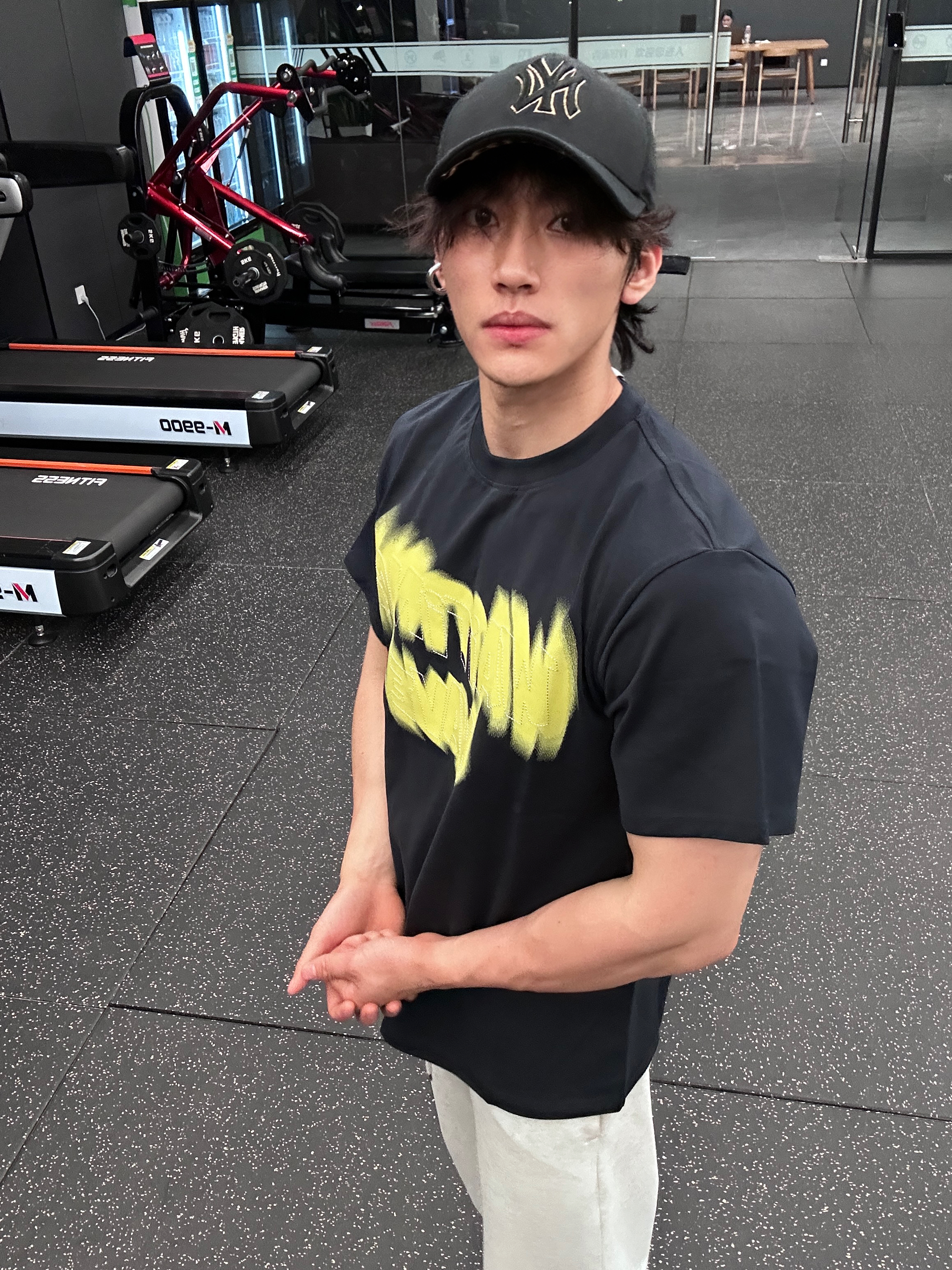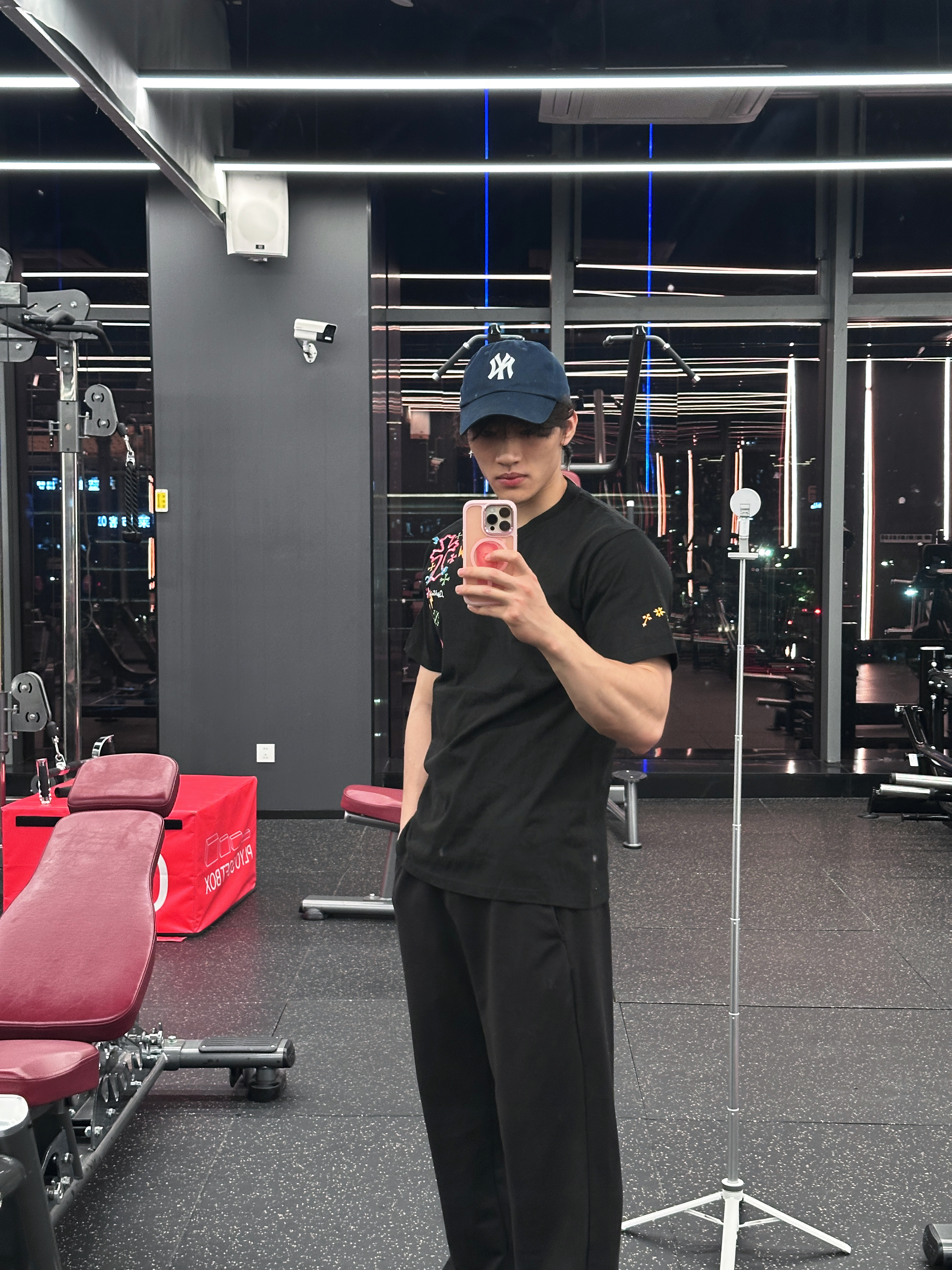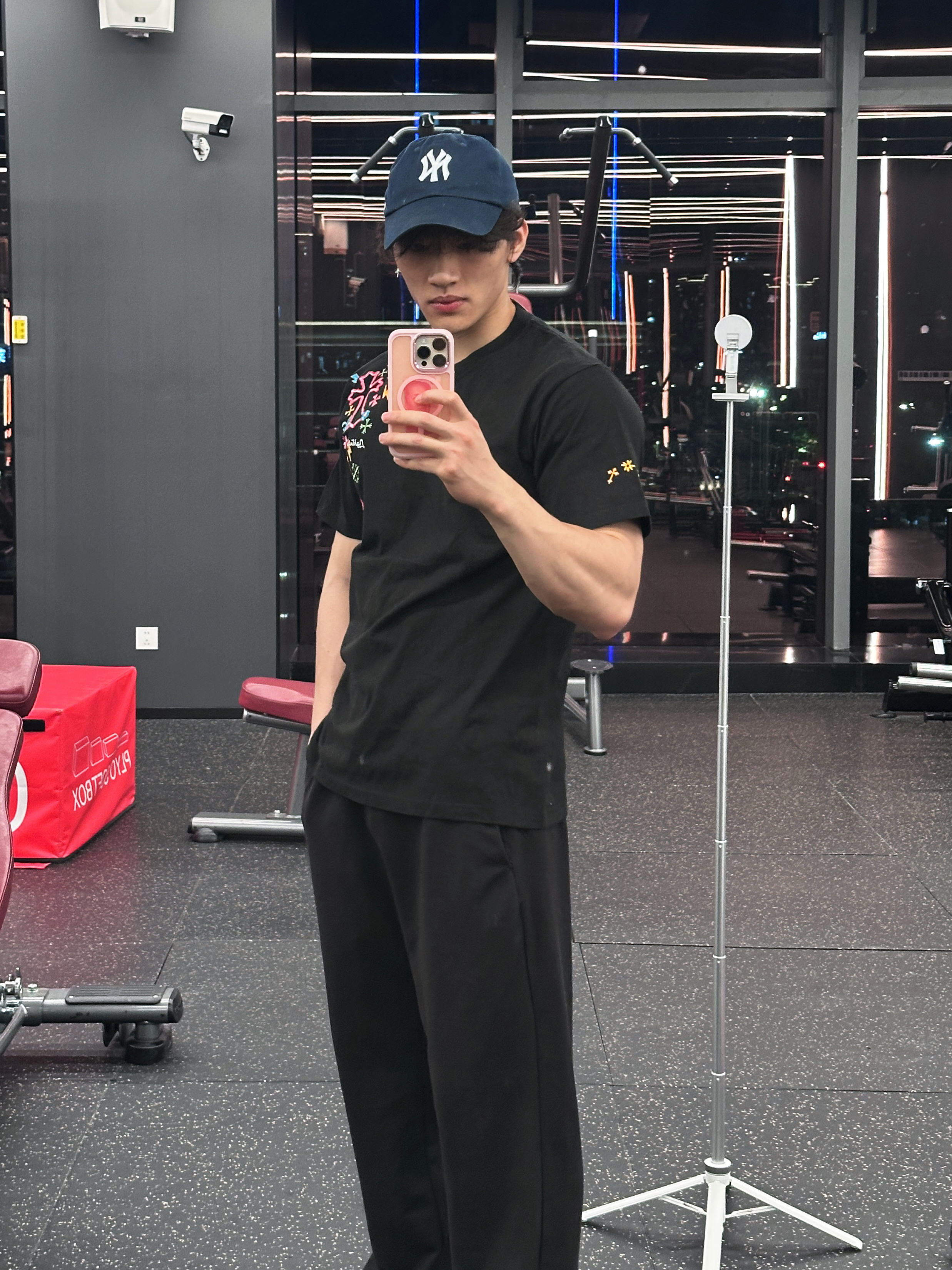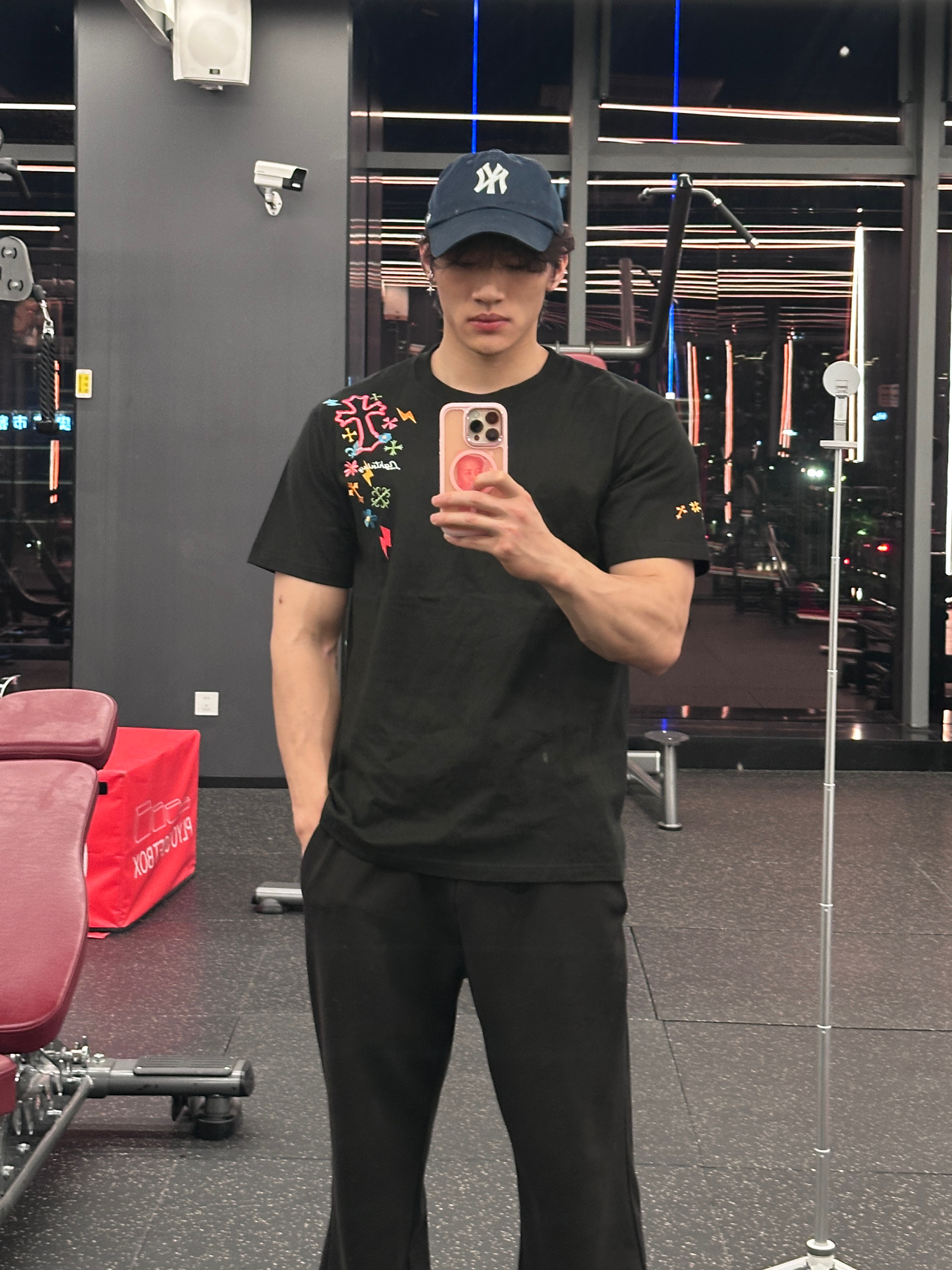 健身男孩的日常OOTD📸 这件黑T真的百搭不挑人,小印花的设计低调又有亮点,面料舒服透气,撸铁穿无压力,日常出街也完全不违和。 #男大健身ootd #