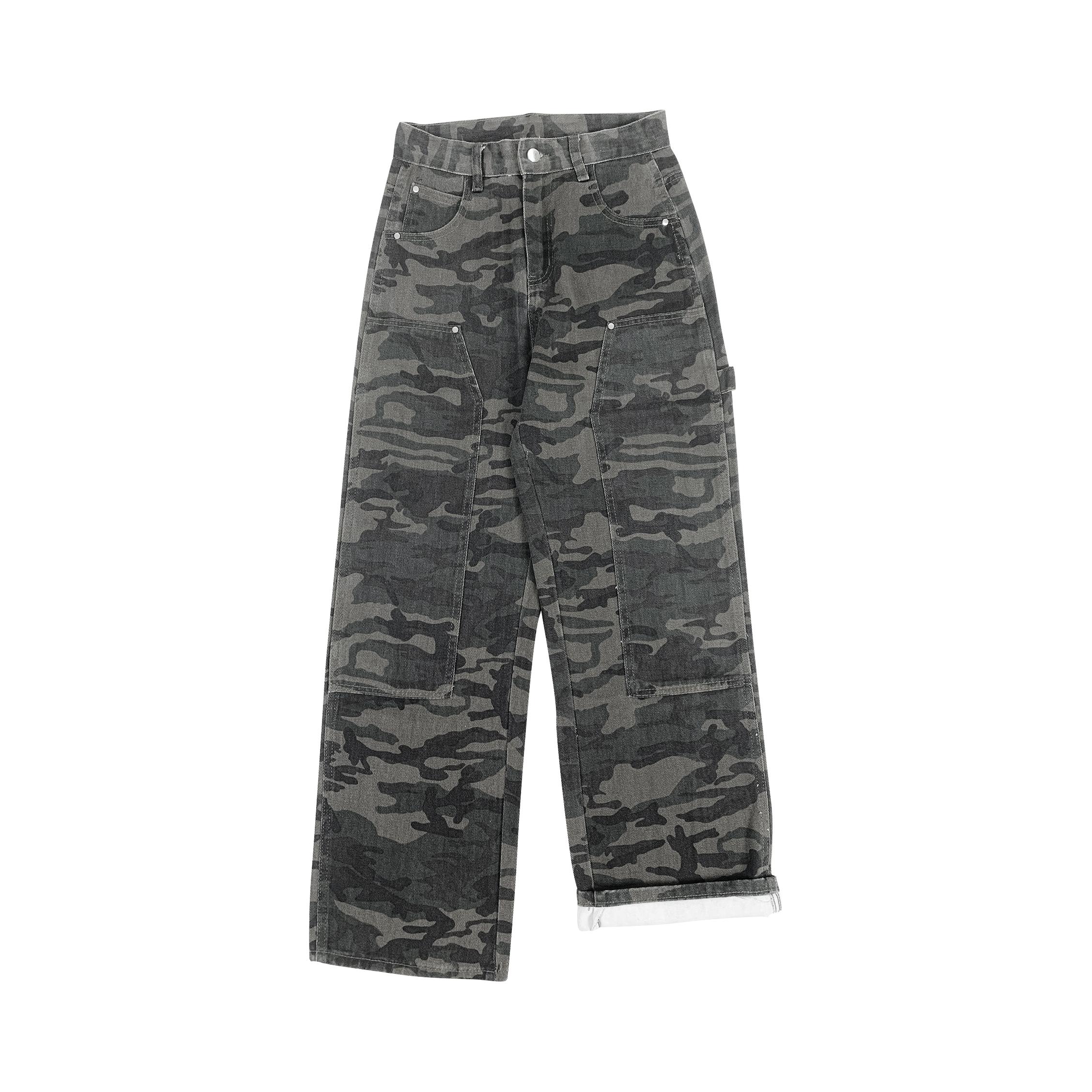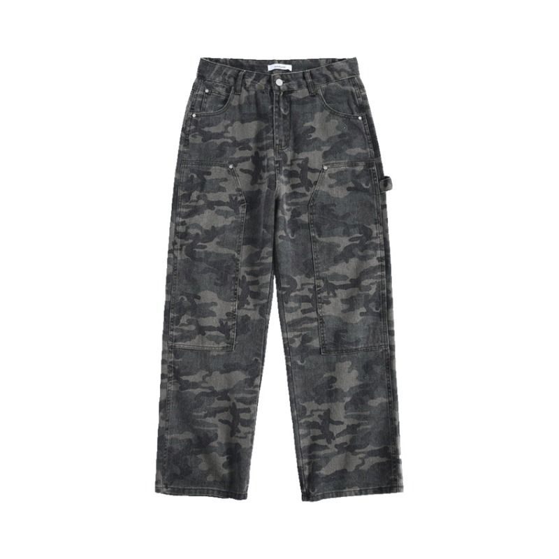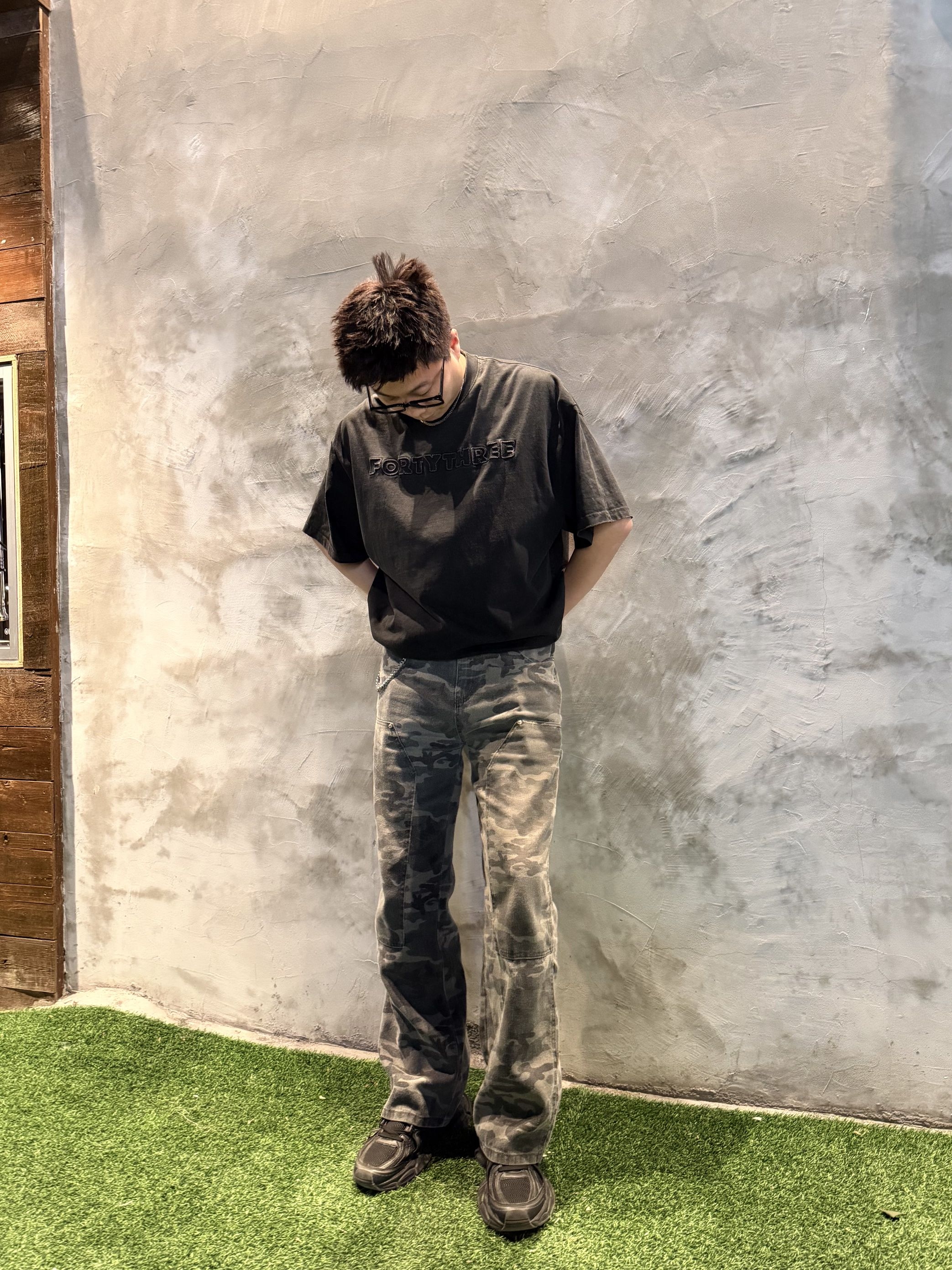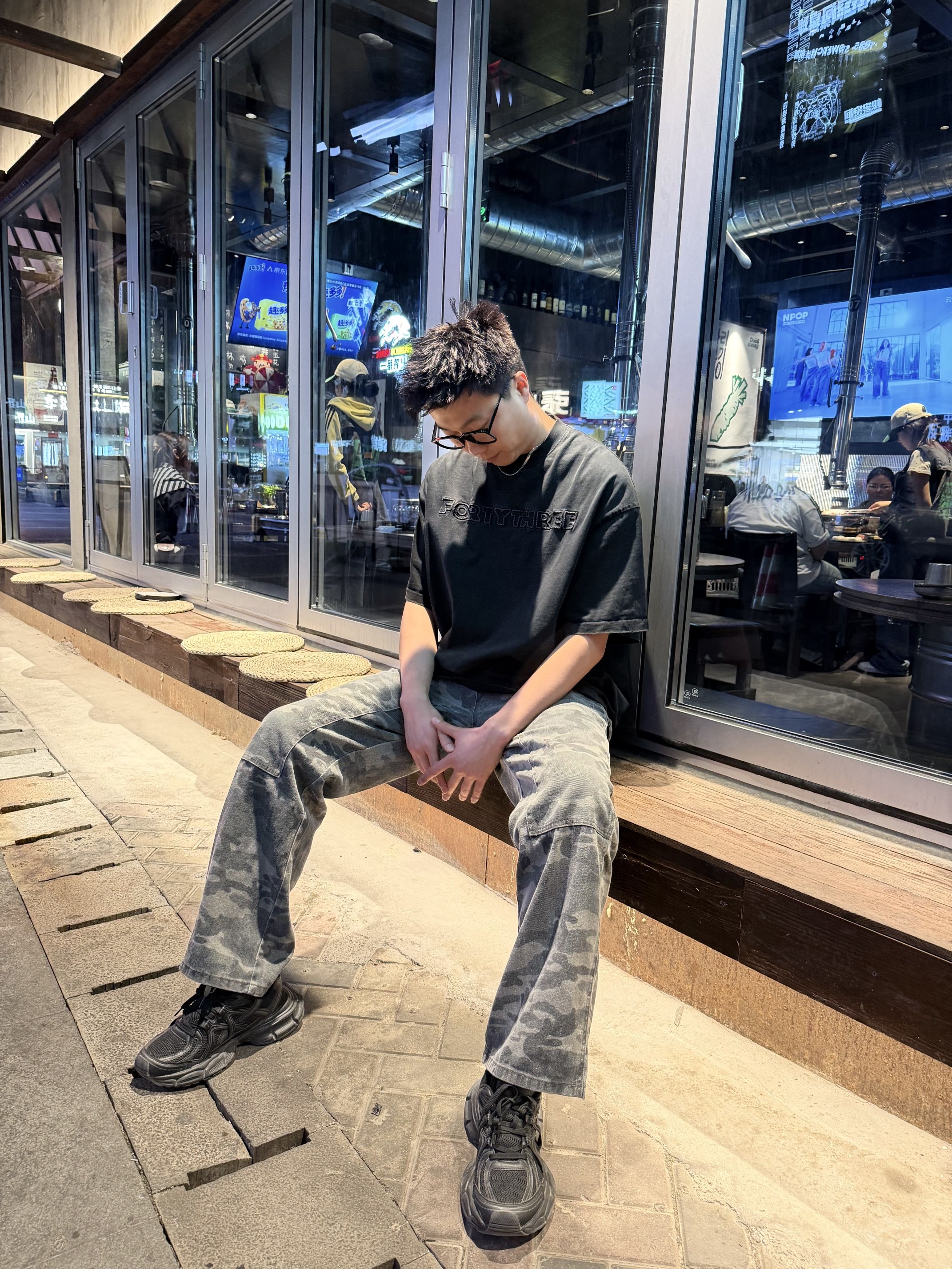 男生显瘦神裤!这条迷彩微喇裤直接封神!做旧水洗迷彩+立体剪裁,腿粗、腿不直全给你藏住,秒变直腿大长腿!搭配同色系压花黑T,松弛感拉满,上脚随便配双黑球鞋,美式街头感直接拿捏,学生党闭眼冲,不踩雷!